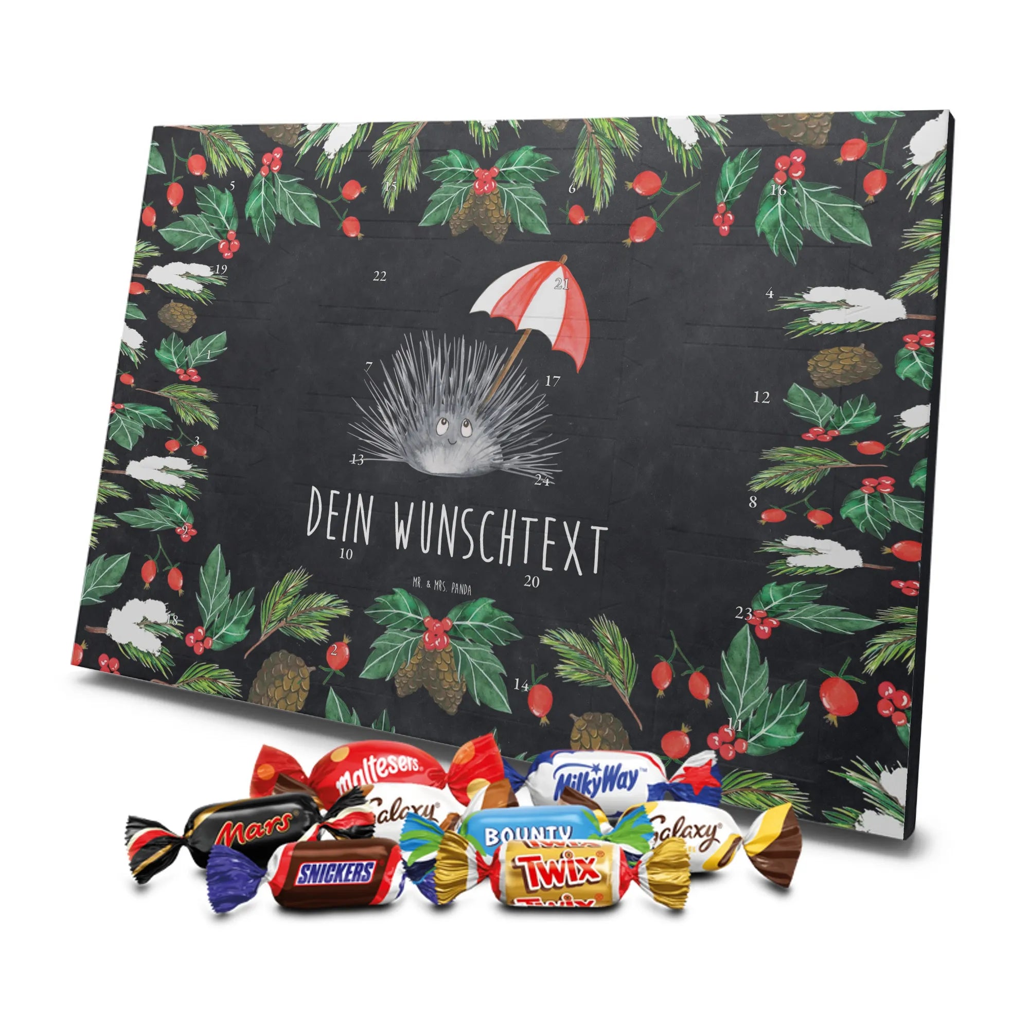 Schoko Adventskalender personalisiert von Mr. & Mrs. Panda – eine besonders liebevolle Geschenkidee für die Adventszeit. Unser Design vereint niedliche Illustrationen und herzliche Sprüche, die wir selbstverständlich mit deinem Wunschtext oder Namen personalisieren. Die brillante Druckqualität wird durch eine seidenmatte Oberflächenveredelung unterstrichen, die Farben und Details wunderschön zur Geltung bringt. Zusätzlich sind die Seitenflächen bedruckt, sodass das Motiv rundum stimmig ist. Du kannst den Kalender entweder aufhängen oder aufstellen – je nachdem, wo die Vorfreude am besten zur Geltung kommt. Gefüllt ist der Kalender mit Celebrations: 24 hochwertige Füllungen in 8 leckeren Sorten wie Maltesers, Mars, Snickers, Twix, Milky Way, Bounty, Galaxy und Galaxy Caramel sorgen für abwechslungsreiche Genussmomente. Maße: 325 mm x 225 mm x 27 mm – ein handliches Format, das trotzdem viel Platz für süße Überraschungen bietet. Ob als Geschenk für Freunde, Familie oder als kleine Verwöhnung für dich selbst: Dieser personalisierte Schoko Adventskalender bringt täglich Freude und ist mit ganz viel Herz gestaltet.