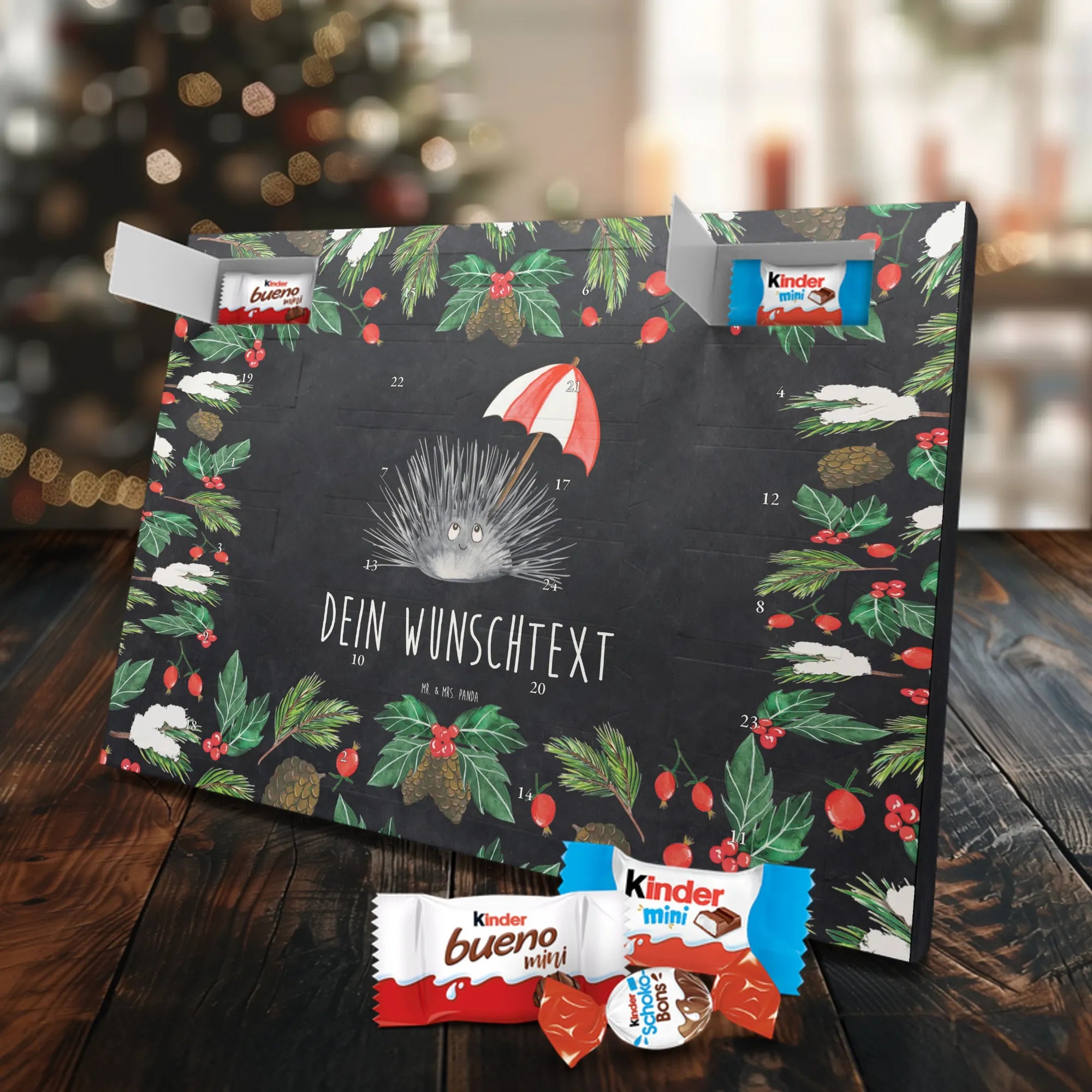Lieblingsstück für die Adventszeit: ein liebevoll gestalteter Adventskalender mit Namen von Mr. & Mrs. Panda. Dieser Adventskalender mit Namen ist perfekt, wenn du jemandem eine ganz persönliche Freude machen willst. Er ist bedruckt mit wunderschönen Motiven & Sprüchen von Mr. & Mrs. Panda und kann mit deinem Wunschnamen oder Wunschtext individualisiert werden. Die brillante Druckqualität und die seidenmatte Veredelung lassen die Farben warm und hochwertig wirken, während die bedruckten Seitenflächen das Design abrunden. Du kannst den Kalender aufstellen oder ganz einfach aufhängen – so passt er in jedes Zuhause. Maße: 355 mm x 245 mm x 11 mm – handlich und dekorativ. Besonderheit: kann aufgehängt oder aufgestellt werden. Gefüllt mit kinder® Schokolade: Adventskalender gefüllt mit kinder® Schokolade; Inhalt: kinder® Schoko-Bons, kinder® Bueno mini und kinder® Schokolade mini. Ideal als Geschenk für Kinder, Partner oder Freunde, die es süß und persönlich mögen. Mr. & Mrs. Panda bringt mit liebevollen Details und hochwertiger Verarbeitung einen besonderen Glanz in deine Adventszeit.