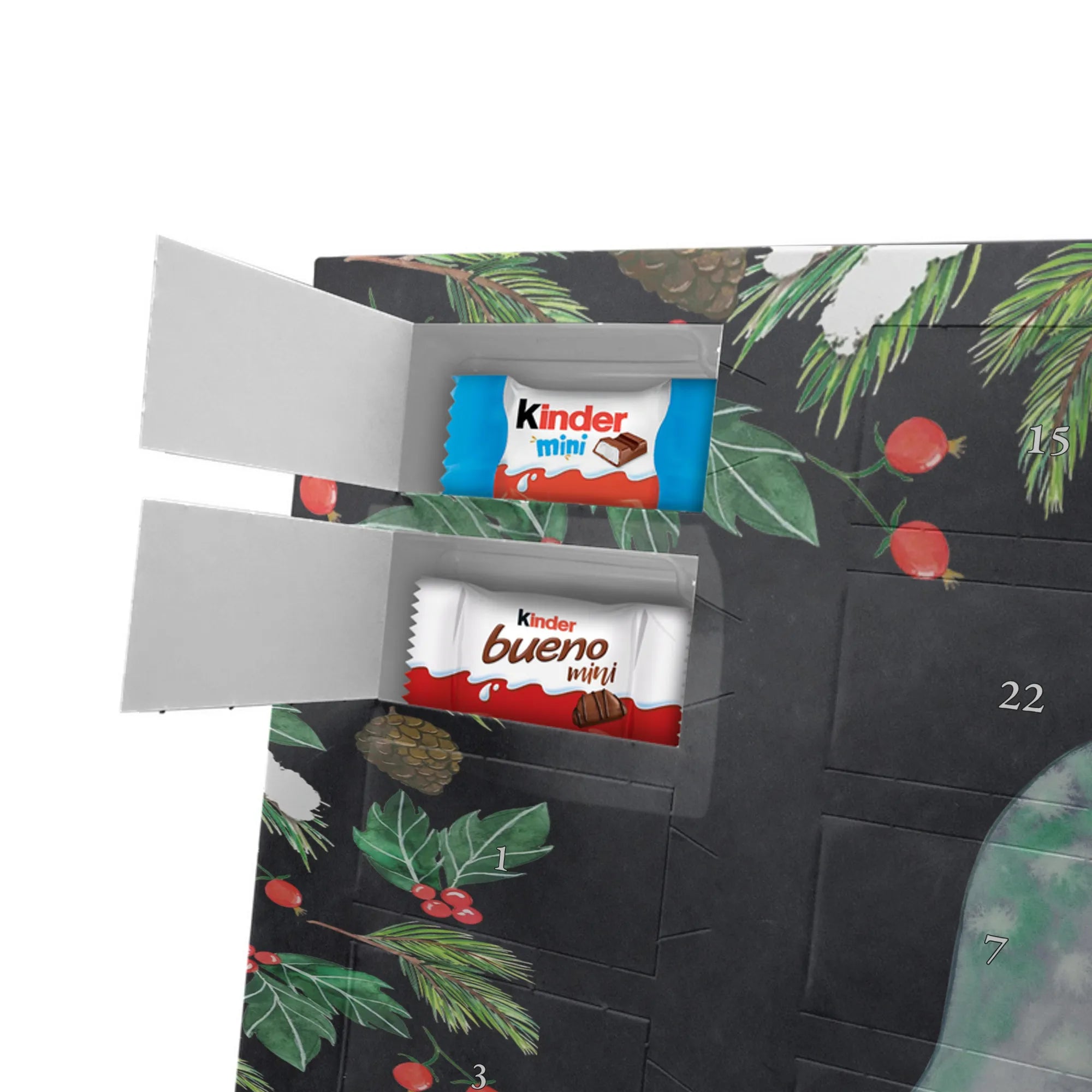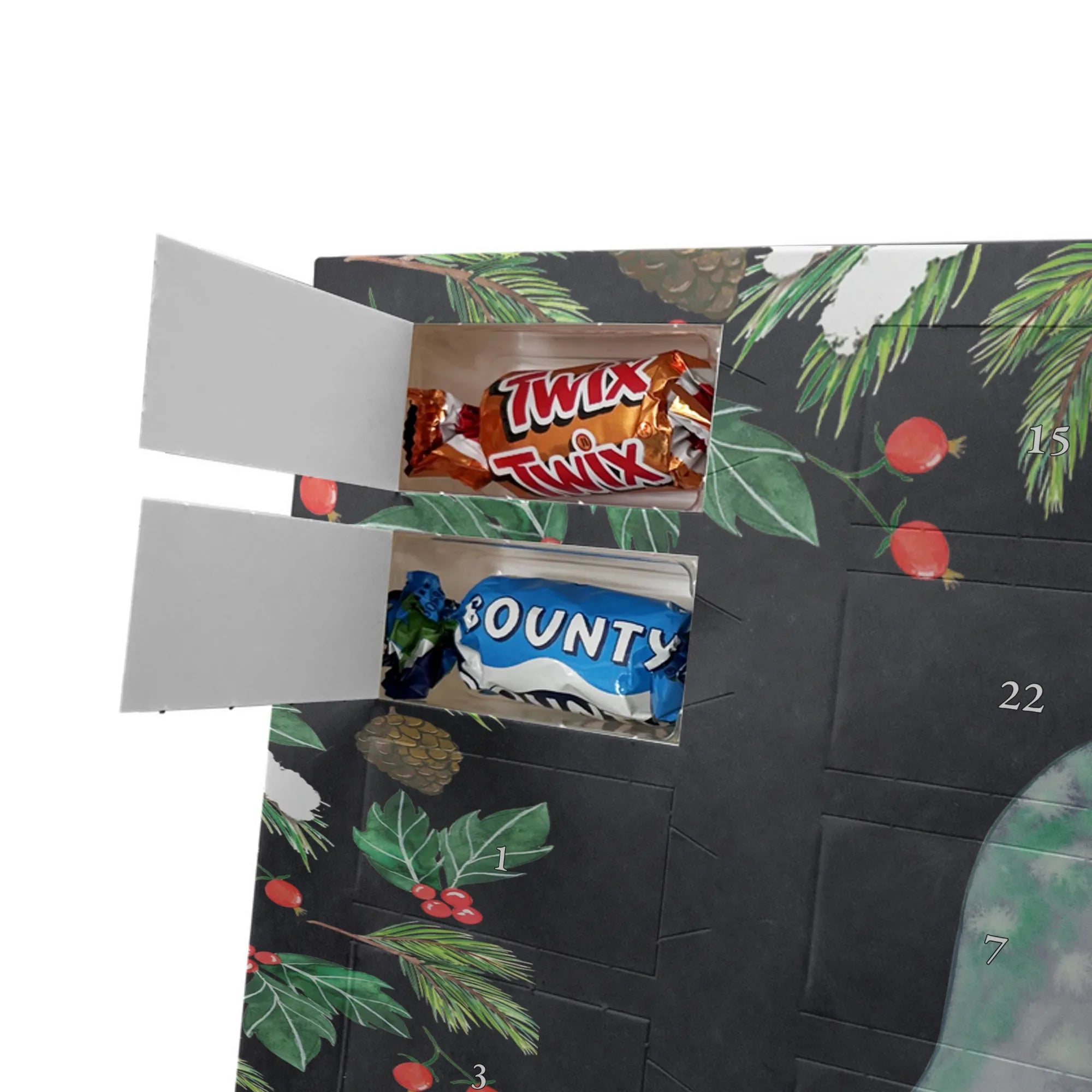 Adventskalender mit Namen von Mr. & Mrs. Panda – die süße und persönliche Art, die Adventszeit zu feiern! Dieser liebevoll gestaltete Adventskalender ist bedruckt mit zauberhaften Motiven & Sprüchen von Mr. & Mrs. Panda und lässt sich ganz nach deinem Geschmack personalisieren: Dein Name oder ein kurzer Wunschtext wird hochwertig aufgedruckt. Die brillante Druckqualität kombiniert mit einer seidenmatten Oberflächenveredelung sorgt für ein edles Finish, und auch die Seitenflächen sind hübsch bedruckt, sodass das Design aus jedem Blickwinkel wirkt. Besonders praktisch: Du kannst den Kalender aufhängen oder einfach aufstellen – perfekt für den Weihnachtsbaum, die Wand oder das Regal. Der Kalender ist gefüllt mit Celebrations und beinhaltet 24 leckere Füllungen in 8 verschiedenen Sorten wie Maltesers, Mars, Snickers, Twix, Milky Way, Bounty, Galaxy und Galaxy Caramel – für jeden Tag bis Heiligabend eine kleine Freude. Maße: 325 mm x 225 mm x 27 mm – handlich und trotzdem großzügig genug für die Schoko-Überraschungen. Verschenke Vorfreude und Persönlichkeit in einem – ideal für Freunde, Familie oder als liebevolle Aufmerksamkeit für dich selbst.