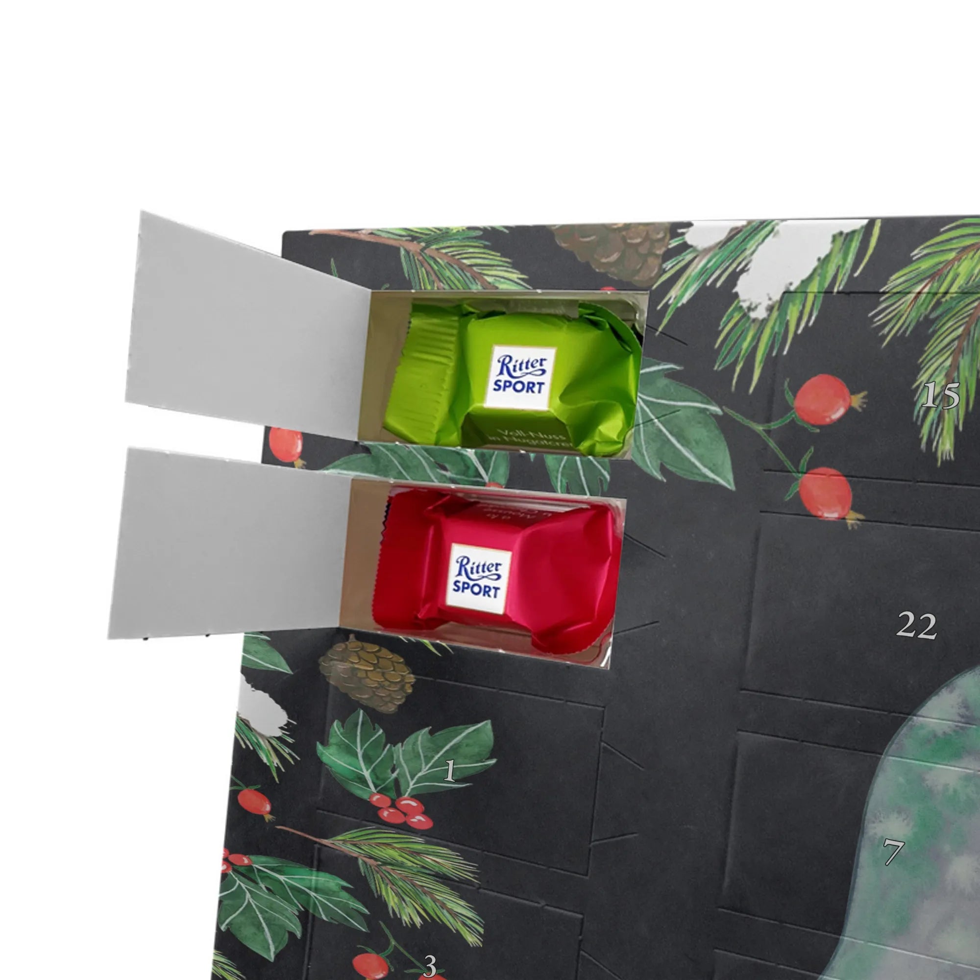 🐼 Personalisierter Schoko Adventskalender, seidenmatt und mit Ritter Sport Schokowürfeln.
