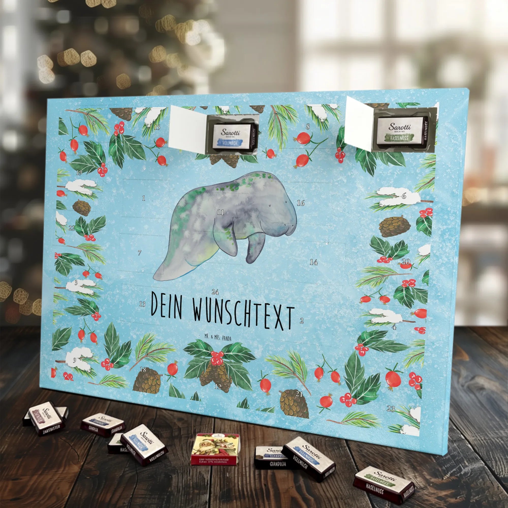 Suchst du einen besonderen Adventskalender, der persönlich und hochwertig ist? Unser Adventskalender mit Namen von Mr. & Mrs. Panda ist genau das – individualisierbar mit dem Namen deiner Liebsten oder einem kurzen Spruch und bedruckt mit unseren beliebten, charmanten Motiven. Die Druckqualität ist brillant, die seidenmatte Oberflächenveredelung verleiht dem Kalender eine elegante Haptik. Auch die Seitenflächen sind liebevoll bedruckt, sodass das Design rundum überzeugt. Du kannst den Kalender aufstellen oder an einer Stelle aufhängen, die du magst – die besondere Form macht beides möglich. Gefüllt ist der Kalender mit Ritter Sport Schokowürfeln in sechs beliebten Sorten: Mousse au Chocolat, Schoko Crisp, Voll-Nuss in Nougatcreme, Karamell Duo, Joghurt und Erdbeer-Joghurt. So gibt es hinter jedem Türchen eine kleine, leckere Überraschung. Maße: 325 mm x 225 mm x 27 mm – kompakt genug, um überall Platz zu finden, groß genug für 24 sorgfältig verpackte Schokowürfel.