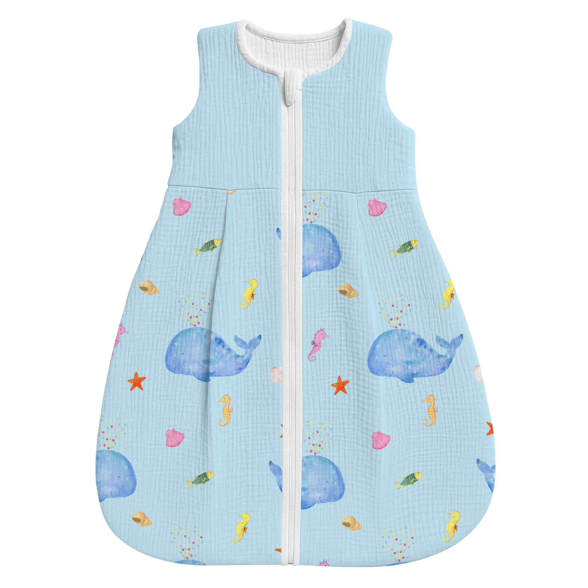Ein leicht zu handhabender Reißverschluss macht das Wickeln und An- und Ausziehen schnell und unkompliziert. Die angenehme Passform sorgt dafür, dass dein Baby sich geborgen fühlt und entspannt schlafen kann. Die leuchtenden Farben und das handgezeichnete Aquarellmotiv passen perfekt zur Meerestiere-Deko oder als Foto-Accessoire bei süßen Erinnerungsshootings.