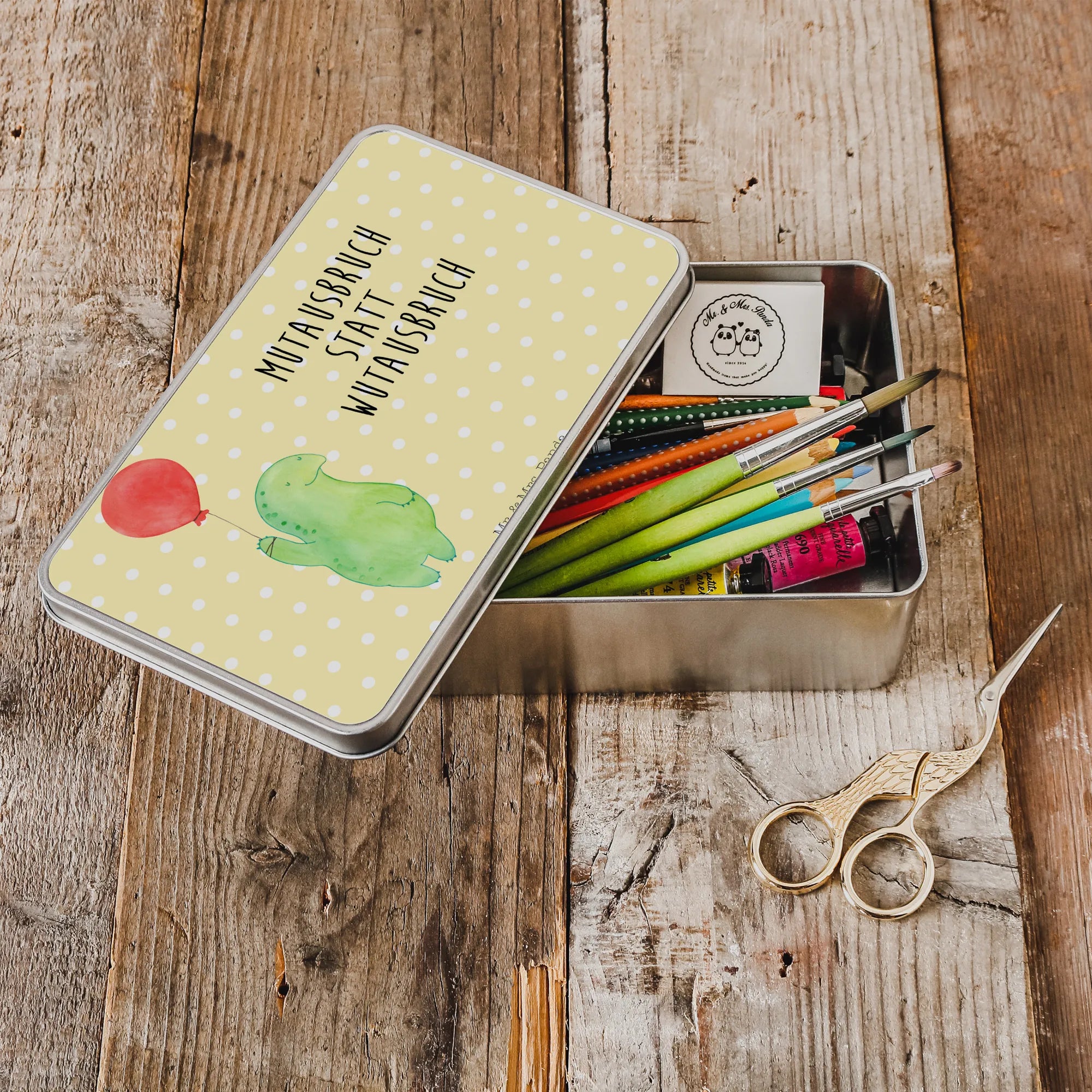 Die wunderschöne Metalldose rechteckig mit dem zauberhaften Motiv der Schildkröte Luftballon von Mr. & Mrs. Panda ist der perfekte Begleiter für alle, die das Besondere lieben. Diese süße Schildkröte schwebt majestätisch an ihrem Luftballon und verbreitet Freude und Leichtigkeit.