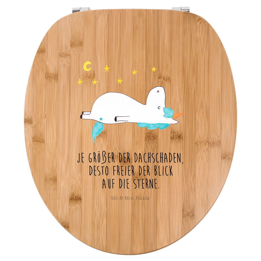 Das niedliche Einhorn, das verträumt in den Sternenhimmel schaut, bringt Freude und einen Hauch von Magie in jedes Badezimmer. Der Spruch "Je größer der Dachschaden, desto freier der Blick auf die Sterne" sorgt für ein Schmunzeln und macht diesen WC Sitz zu einem echten Hingucker!