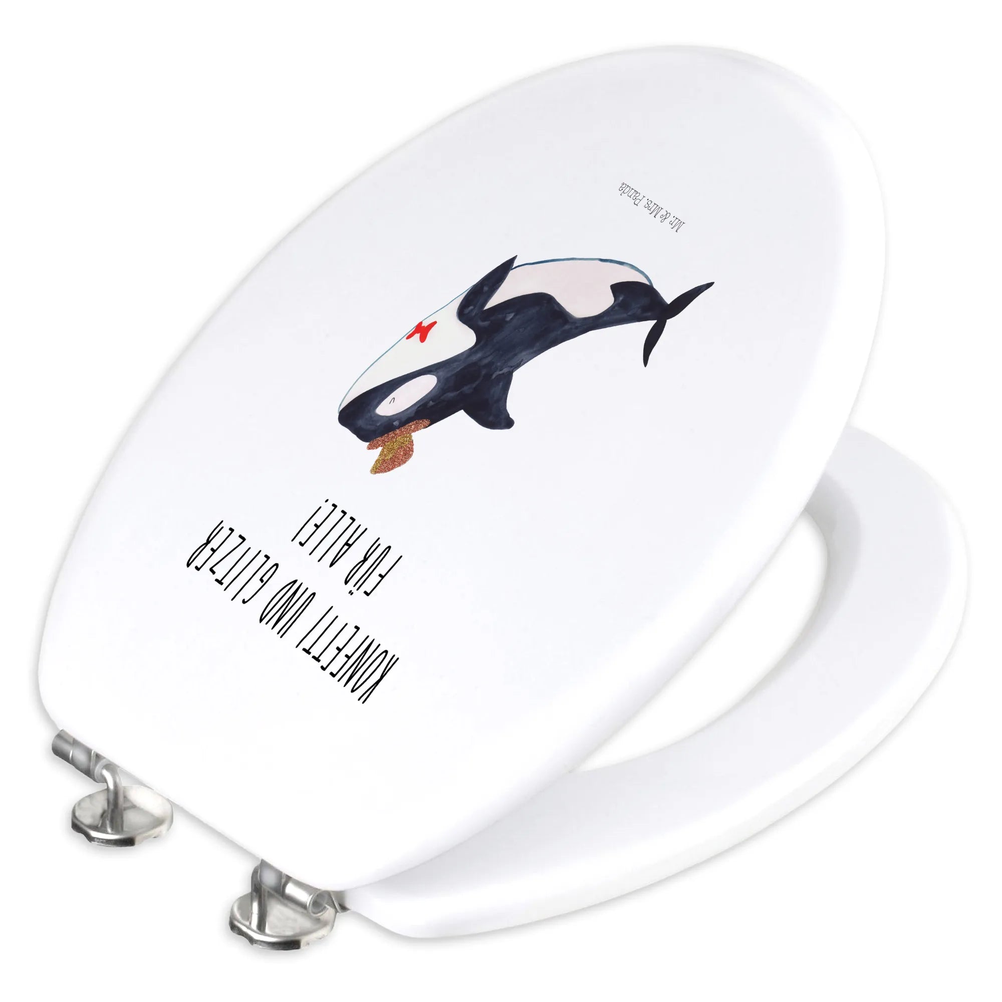 Dieser liebevoll gestaltete Design WC Sitz aus unserer Meerestiere-Kollektion zeigt einen freundlichen Orca im skizzierten Aquarell-Stil, der einen verspielten Zylinder mit Blumenverzierung trägt. Ein kleiner roter Fisch nahe seiner Wange verleiht dem Motiv zusätzlichen Charme. Das Ergebnis: ein fröhliches, warmes Bild, das jedem Bad Persönlichkeit schenkt.