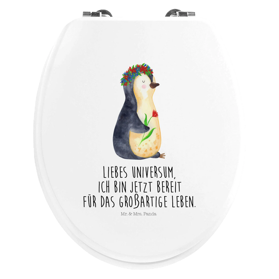 Motiv WC Sitz Pinguin Blumen - mit Spruch - Hartfaser Holzkern Weiß - Weiß