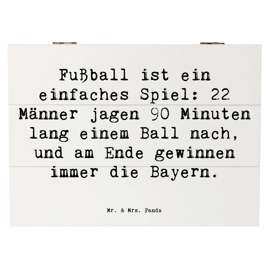 Entdecke die perfekte Holzkiste von Mr. & Mrs. Panda, die nicht nur schön, sondern auch funktional ist! Mit ihrem bezaubernden Fußball-Motiv und dem inspirierenden Spruch "Fußball ist ein einfaches Spiel: 22 Männer jagen 90 Minuten lang einem Ball nach, und am Ende gewinnen immer die Bayern" ist diese Kiste ein ideales Geschenk für alle Sportfans.