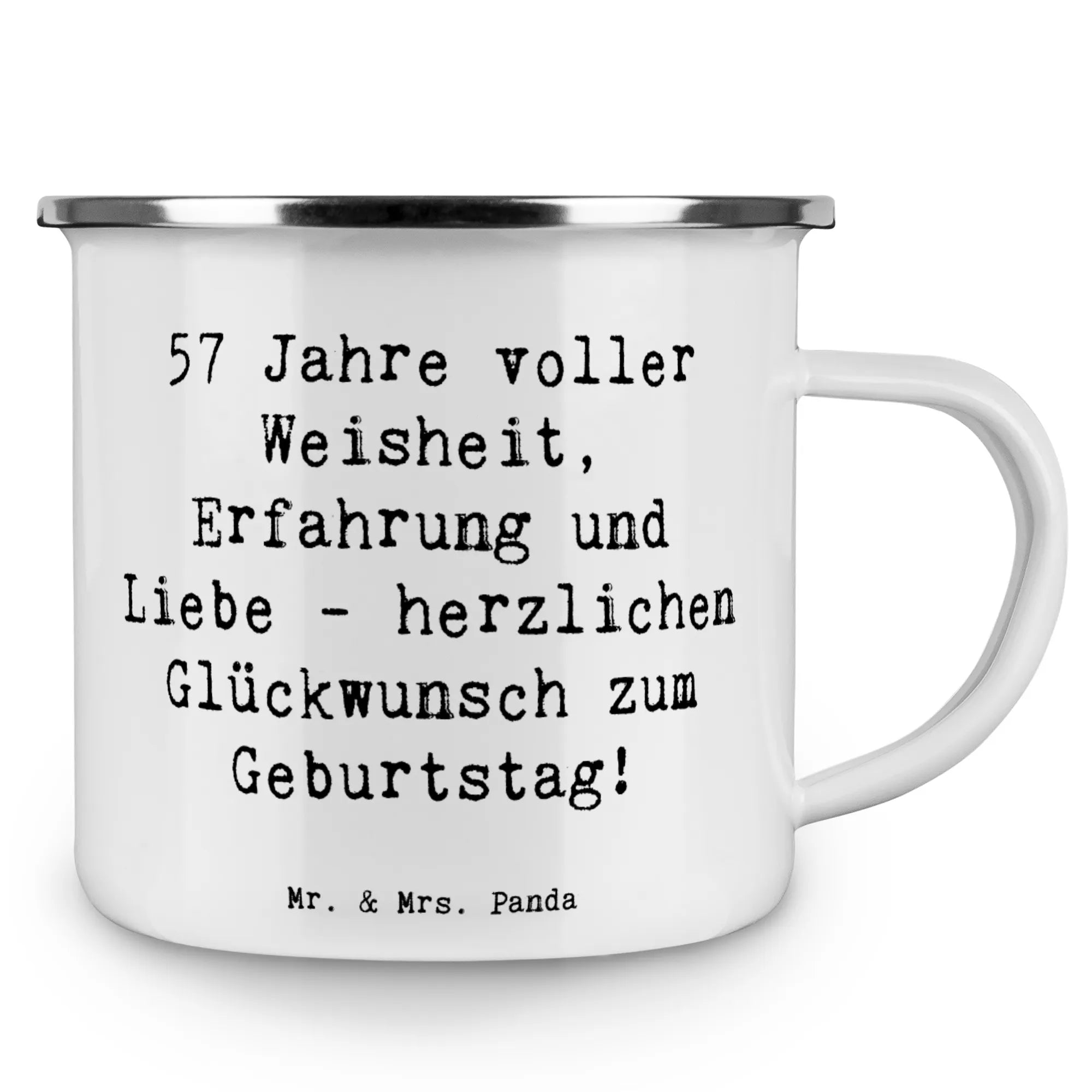 Die Camping Emaille Tasse von Mr. & Mrs. Panda ist mehr als nur ein Trinkbehälter; sie ist dein Begleiter für unvergessliche Momente in der Natur. Mit einem charmanten Motto "57 Jahre voller Weisheit, Erfahrung und Liebe - herzlichen Glückwunsch zum Geburtstag!" ist sie das perfekte Geschenk zum 57. Geburtstag und wird jeden, der sie erhält, begeistern. Egal, ob beim Campen, Wandern oder einfach nur in deinem Garten – diese Tasse ist der ideale Gefährte für warme und kalte Getränke.