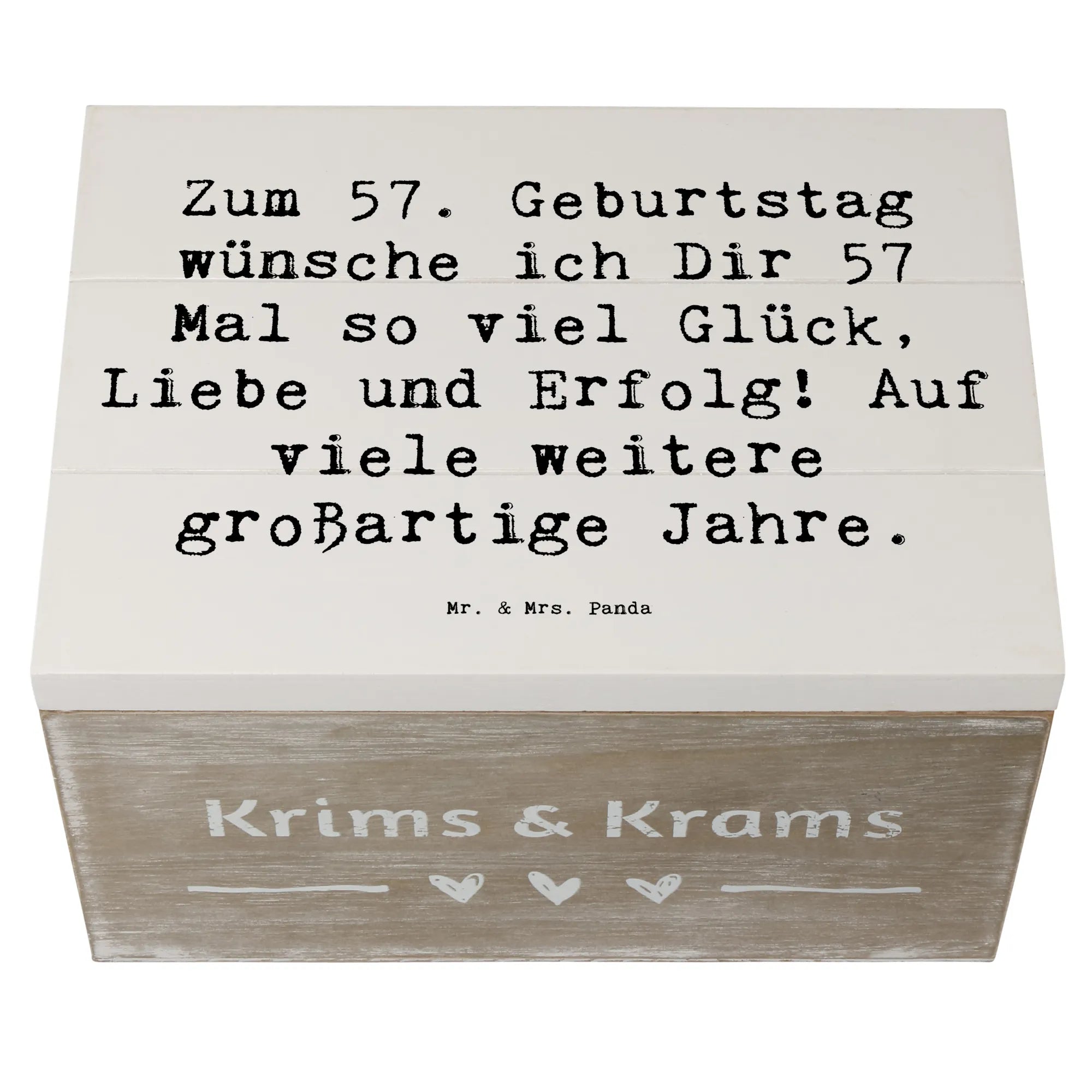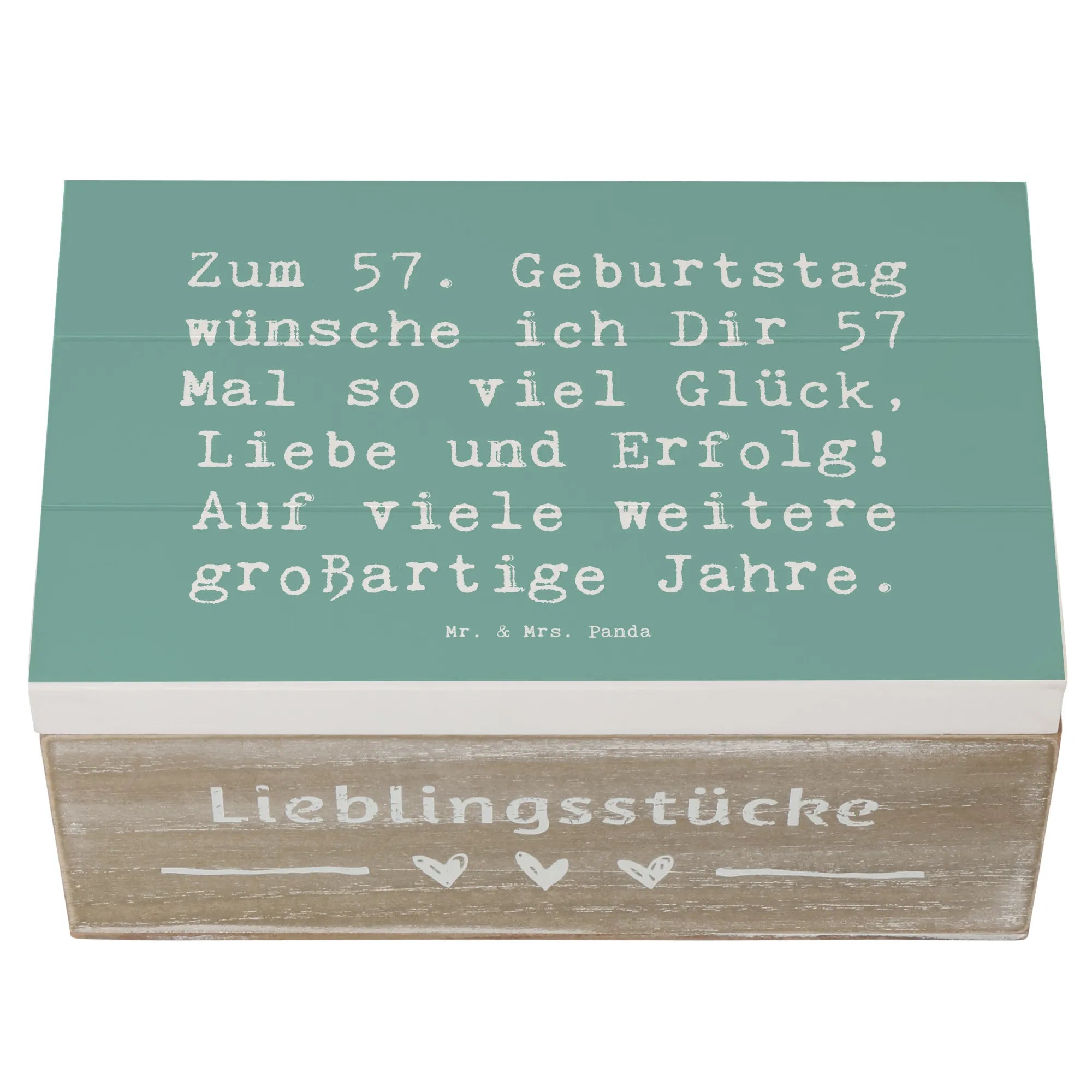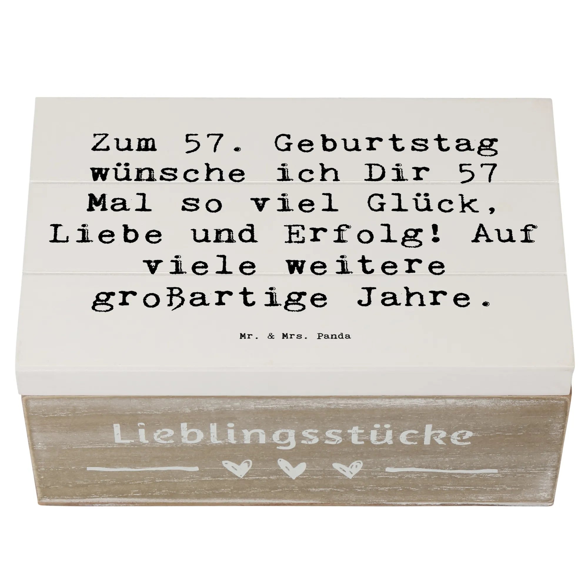 Die wunderschöne Holzkiste von Mr. & Mrs. Panda ist das perfekte Geschenk zum 57. Geburtstag! Mit dem liebevoll gestalteten Slogan 'Zum 57. Geburtstag wünsche ich Dir 57 Mal so viel Glück, Liebe und Erfolg! Auf viele weitere großartige Jahre.' wird diese Kiste zu einem unvergesslichen Erinnerungsstück.