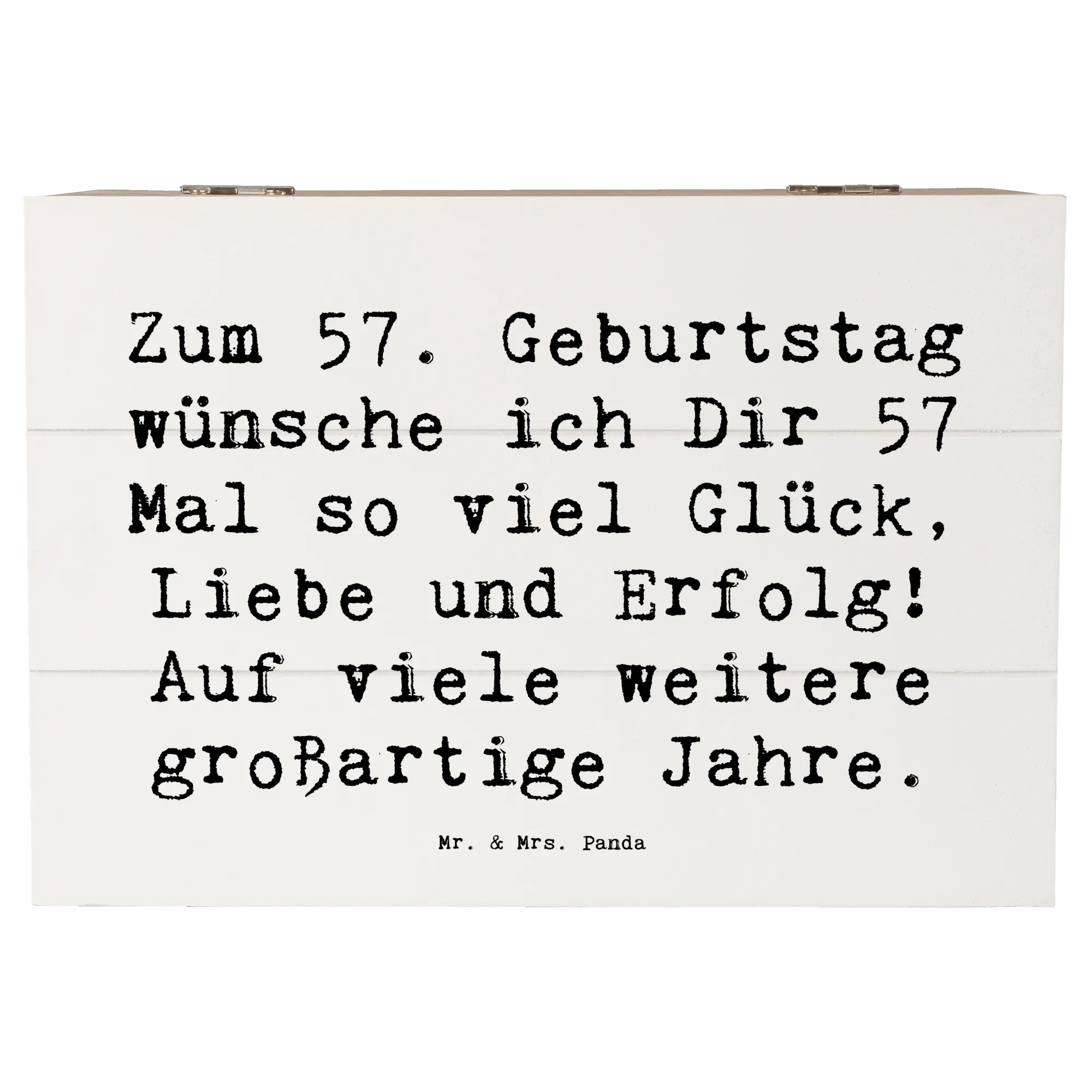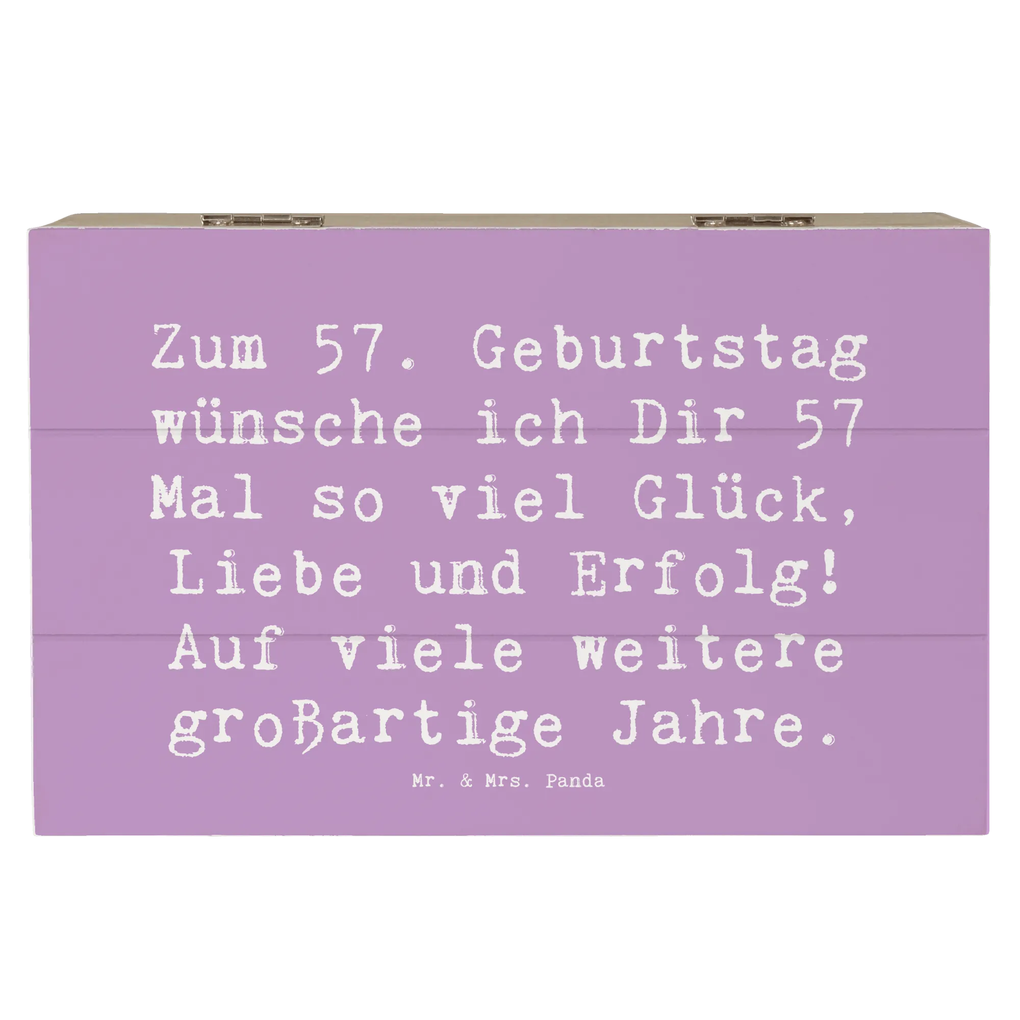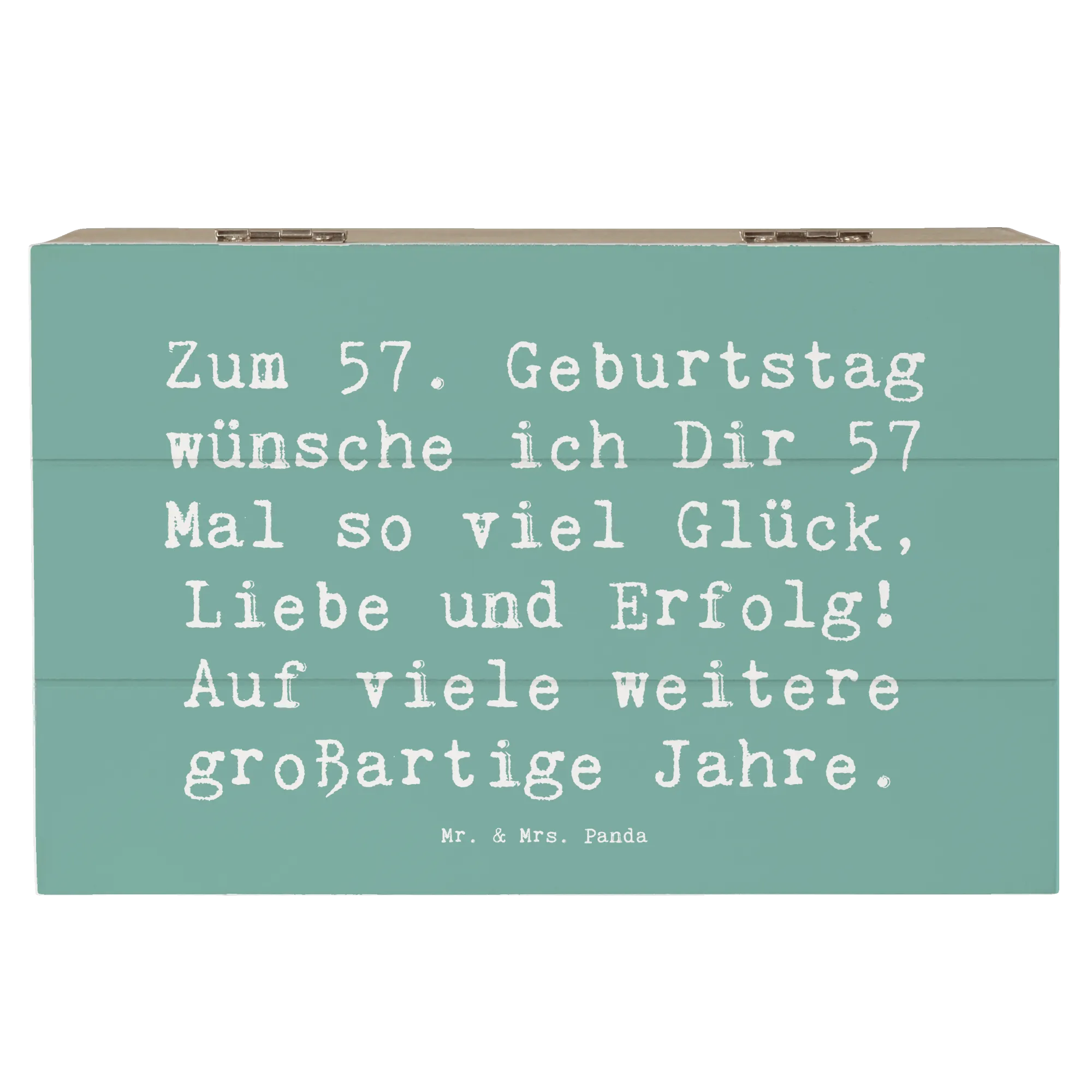 Die wunderschöne Holzkiste von Mr. & Mrs. Panda ist das perfekte Geschenk zum 57. Geburtstag! Mit dem liebevoll gestalteten Slogan 'Zum 57. Geburtstag wünsche ich Dir 57 Mal so viel Glück, Liebe und Erfolg! Auf viele weitere großartige Jahre.' wird diese Kiste zu einem unvergesslichen Erinnerungsstück.