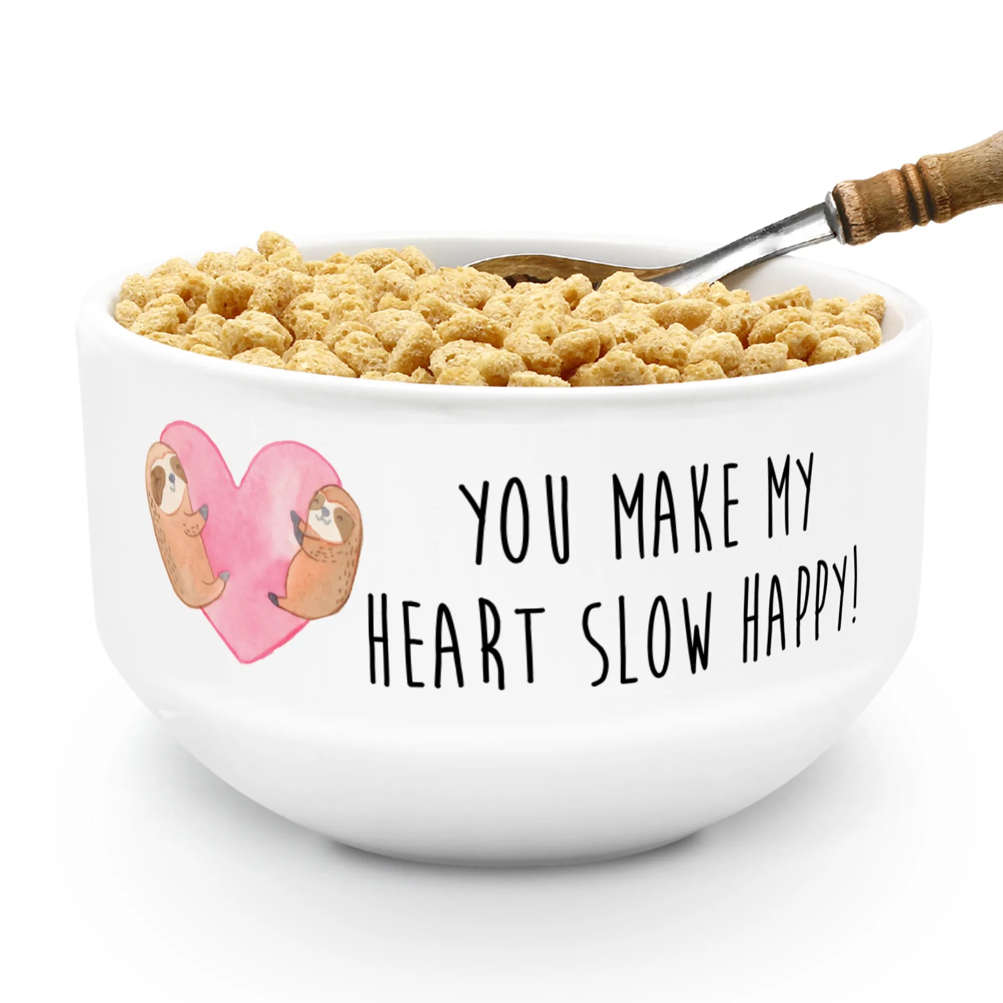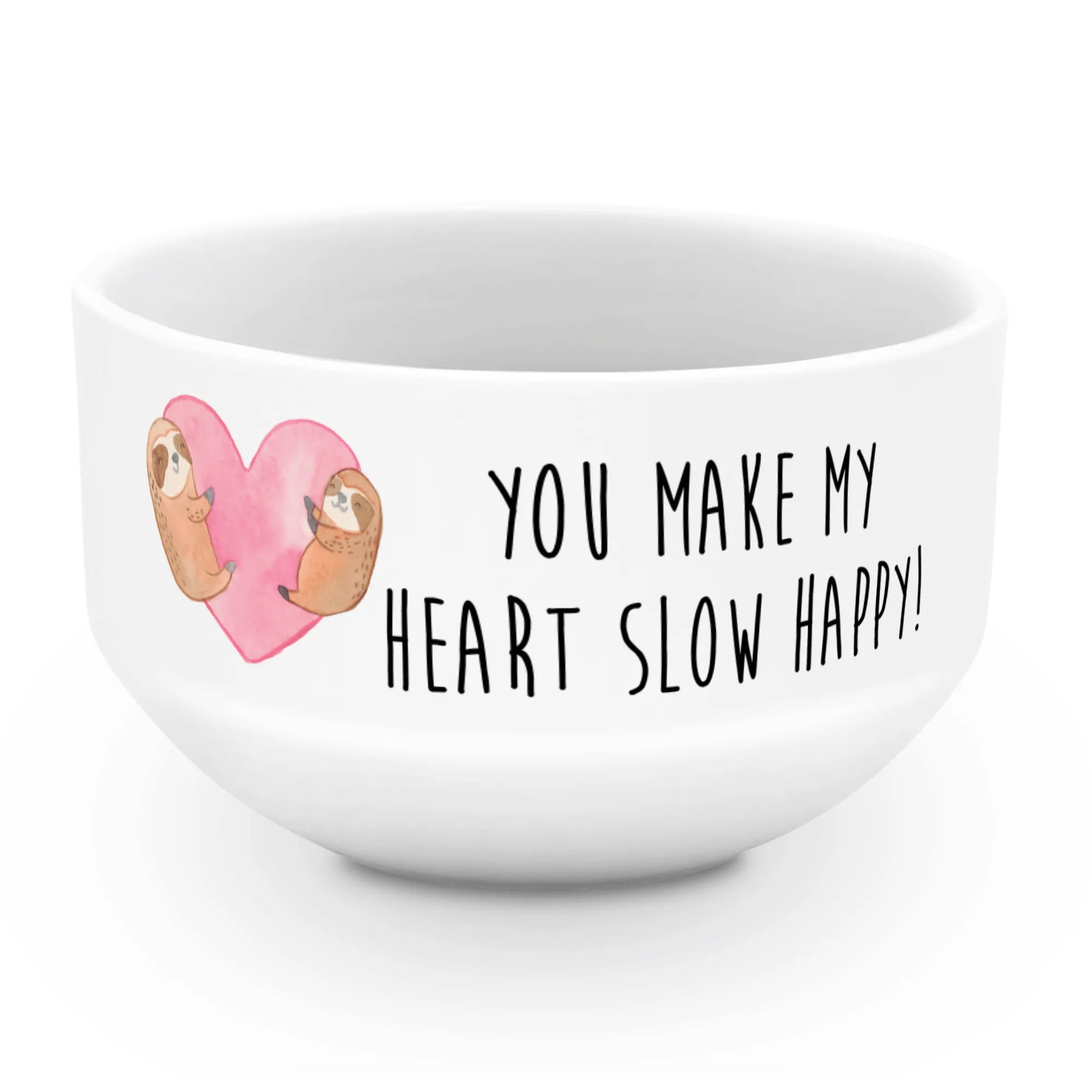 Im Inneren der Schüssel siehst du ein Paar süßer Faultiere, die in einem große herzförmigen, in zarten Rosa-Tönen gemalten Hintergrund kuscheln. Diese Faultiere drücken mit ihren entspannten Gesichtsausdrücken und liebevollen Haltungen die Verbundenheit und Zuneigung aus, die sie füreinander empfinden. Ergänzt wird das liebevolle Design durch den Spruch „You make my heart slow happy!”, der jedem Frühstück oder Snack eine ganz besondere Note verleiht.