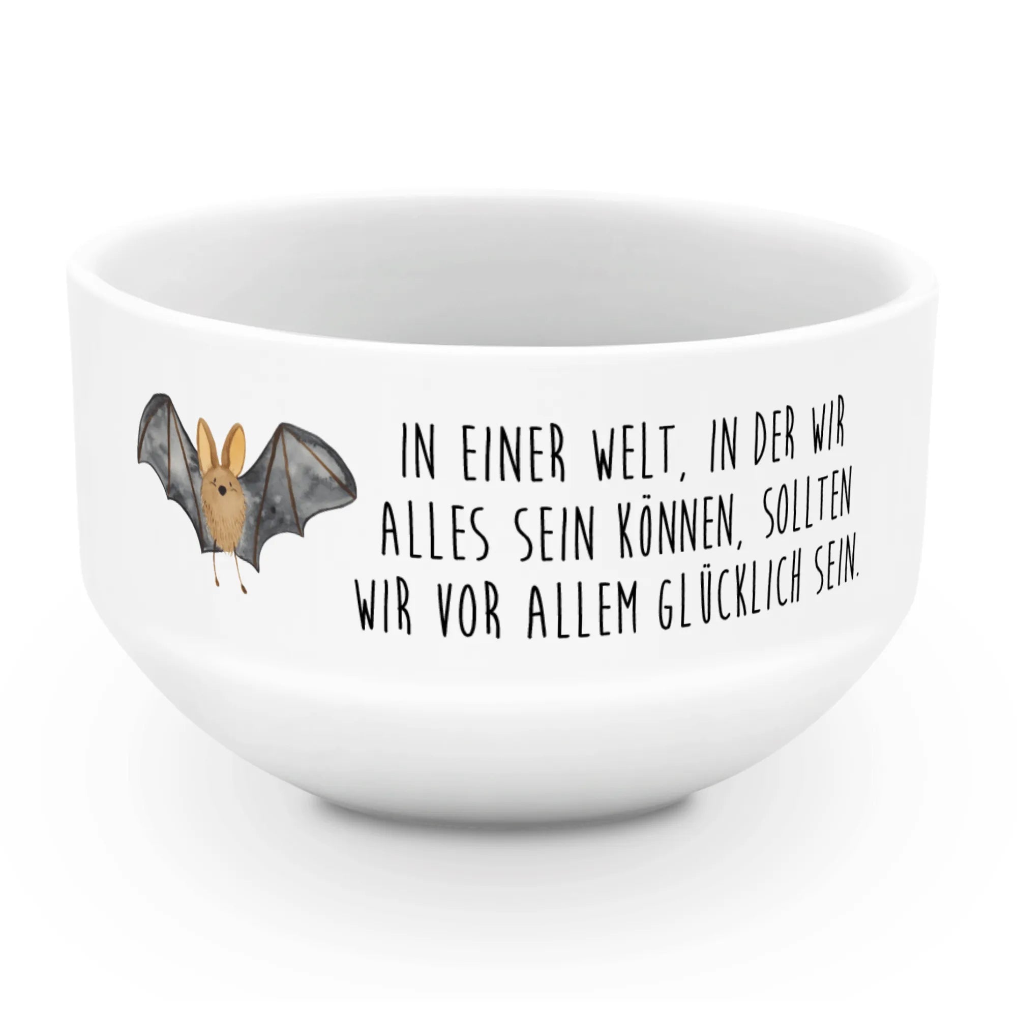 Die kleinen Fledermäuse, die fröhlich umherfliegen, erinnern uns daran, das Leben in vollen Zügen zu genießen. Jede Schale ist mit dem inspirierenden Spruch "In einer Welt, in der wir alles sein können, sollten wir vor allem glücklich sein." versehen, was sie zu einem idealen Geschenk für Freunde und Familie macht.