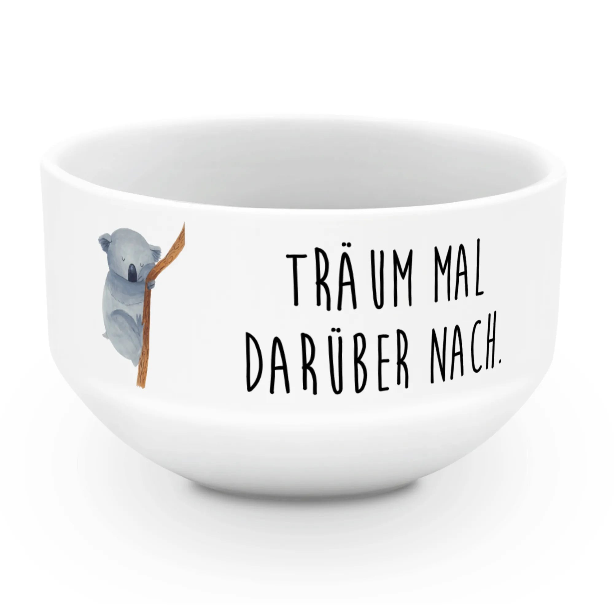 Das niedliche Koalabär Motiv, das sich sanft an einen Ast klammert, lädt dazu ein, die Gedanken einfach mal treiben zu lassen. Mit dem Spruch „Träum mal darüber nach.“ bringt die Schüssel nicht nur Farbe in den Frühstückstisch, sondern auch ein Lächeln in Dein Gesicht.