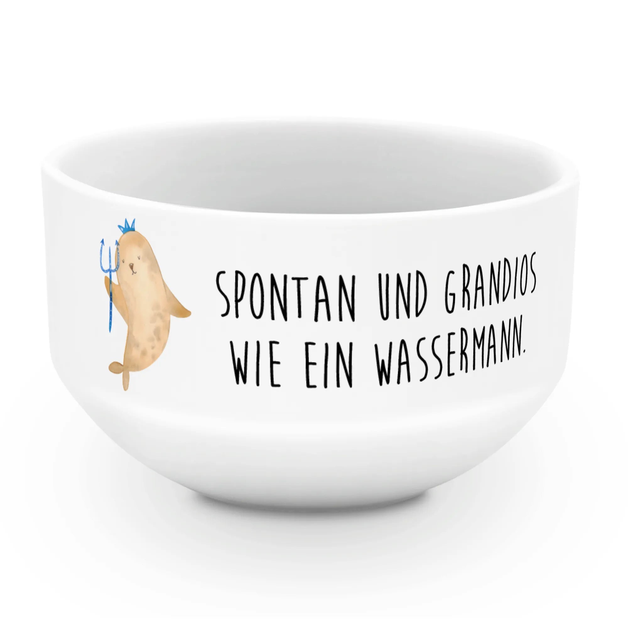 Mr. & Mrs. Panda Müslischale Sternzeichen Wassermann – Deine neue Lieblingsschale für jeden Morgen! 🐧🌊 Die süße Robben-Illustration mit Krone und Zepter ist handgezeichnet und bringt fröhliche Aquarellfarben an deinen Frühstückstisch. Der Spruch „Spontan und grandios wie ein Wassermann.“ passt perfekt zu allen kreativen, freiheitsliebenden Seelen.