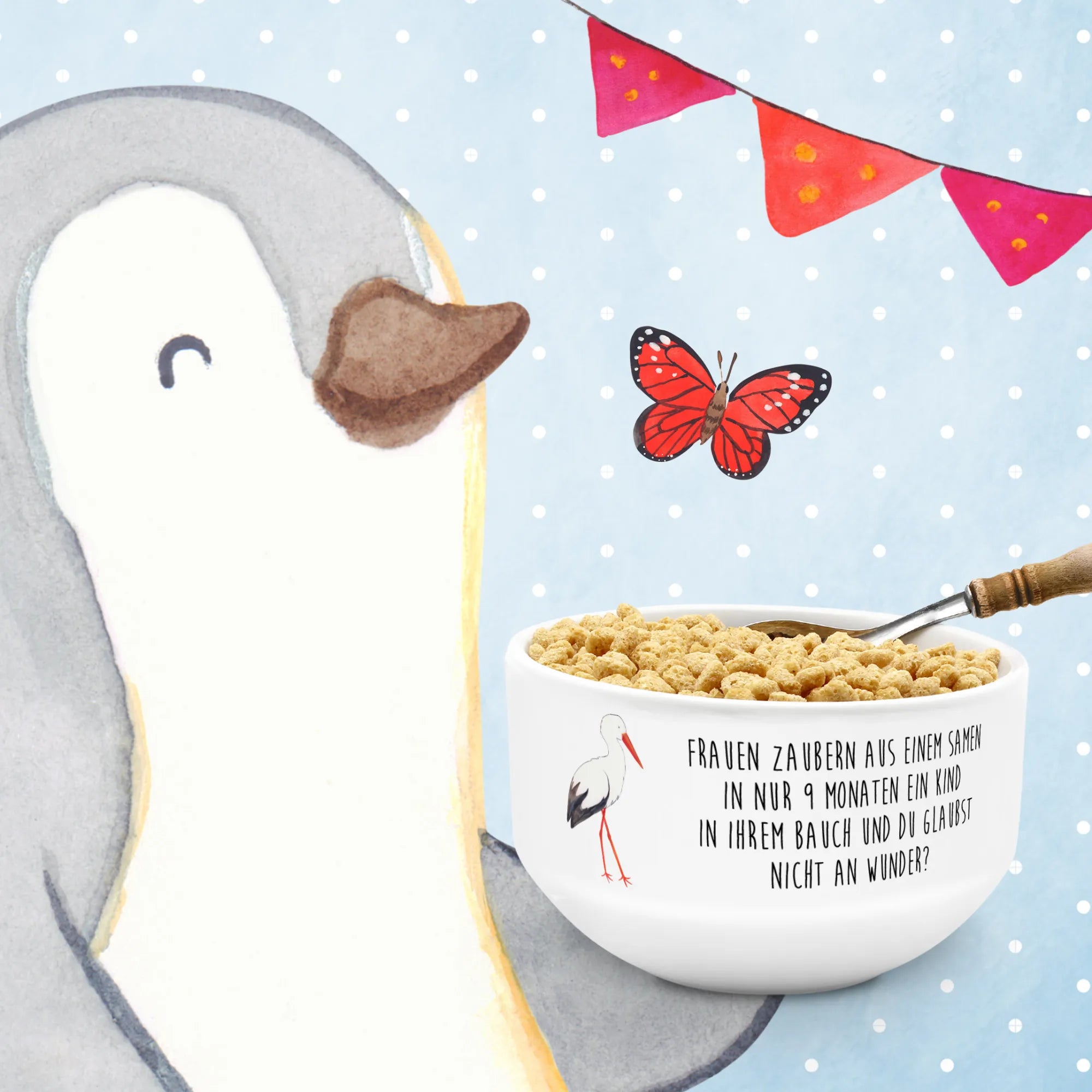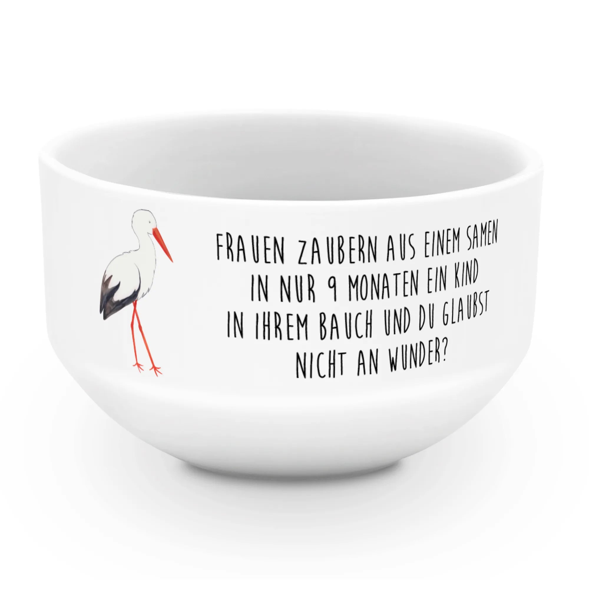 Die bezaubernde Müslischale mit dem süßen Storch-Motiv von Mr. & Mrs. Panda ist das perfekte Geschenk für werdende Mütter oder frisch gebackene Eltern. Sie zeigt einen niedlichen Storch, der ein Baby in einem Tuch trägt, und verleiht Deinem Frühstück oder Dessert eine besondere Note. Mit dem Spruch "Frauen zaubern aus einem Samen in nur 9 Monaten ein Kind in ihrem Bauch und du glaubst nicht an Wunder?" wird diese Schüssel nicht nur zum Blickfang, sondern erinnert auch daran, wie besonders die Zeit der Schwangerschaft ist.