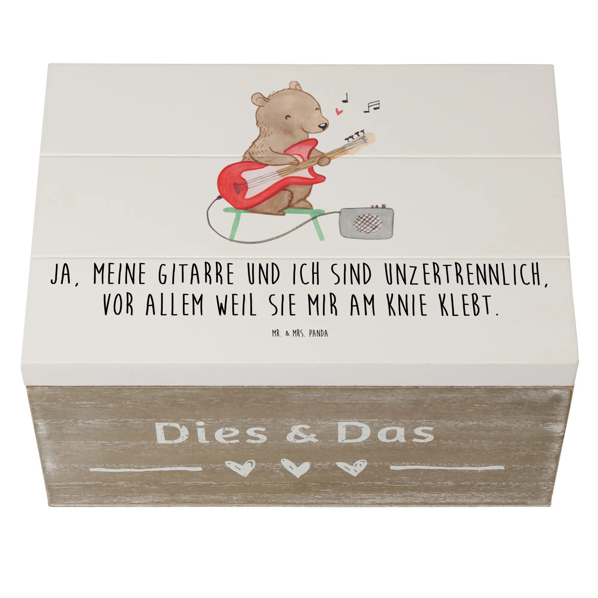 Die wunderschöne Holzkiste von Mr. & Mrs. Panda ist mehr als nur eine Aufbewahrungsbox – sie ist ein magischer Ort für all deine Schätze! Mit ihrem wunderschönen Motiv einer Gitarre und dem witzigen Spruch 'Ja, meine Gitarre und ich sind unzertrennlich, vor allem weil sie mir am Knie klebt' bringt sie Freude und einen Hauch von Musik in dein Leben.