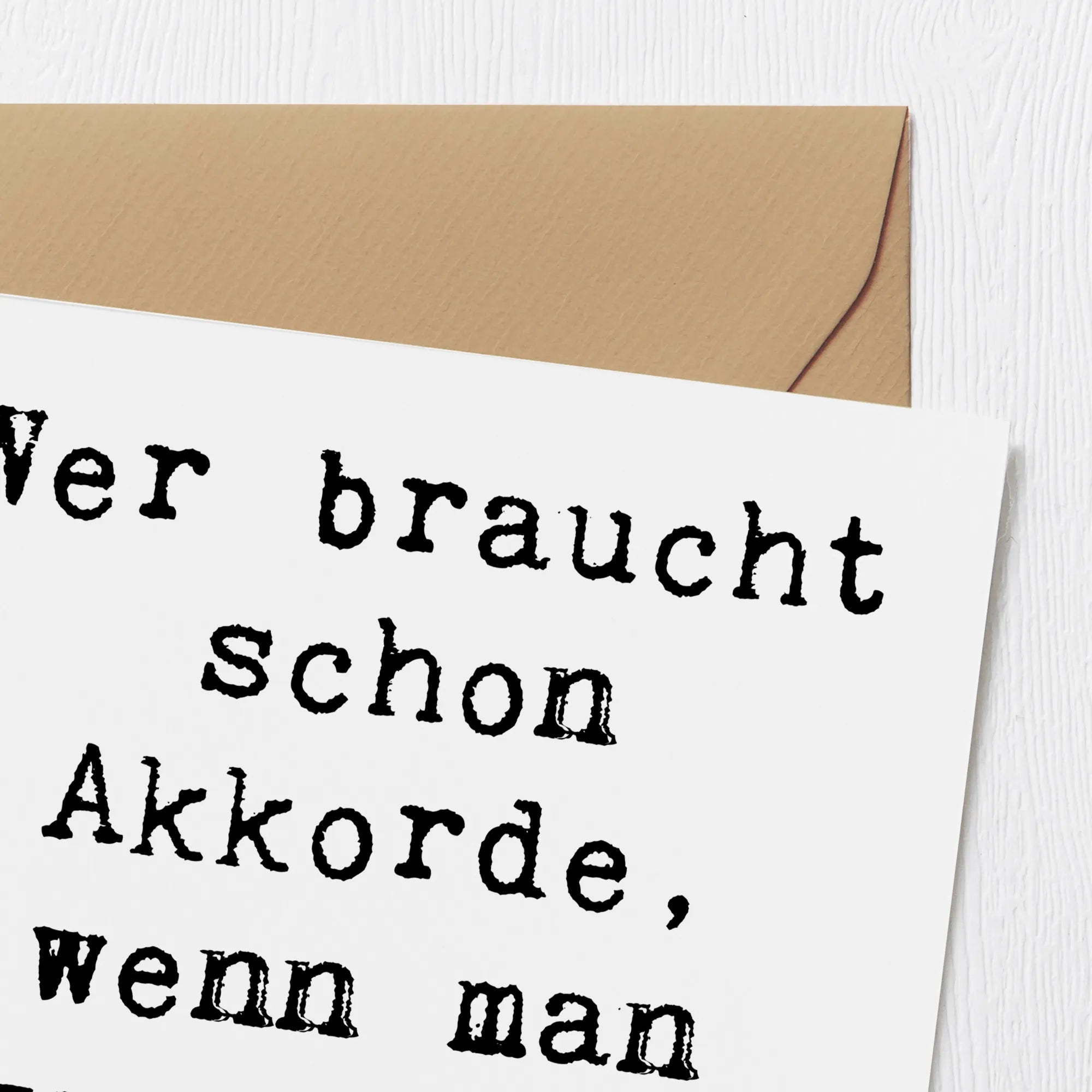 Die Karte kommt in einer handlichen Größe von 140 mm x 140 mm und ist aus hochwertigem 300 Gramm Karton gefertigt, was sie besonders edel erscheinen lässt. Die hochglänzend veredelte Vorderseite zeigt das coole Motiv einer E-Gitarre, die den Charakter und die Energie der modernen Musik widerspiegelt. Der Spruch "Wer braucht schon Akkorde, wenn man zwei gute Riffs hat?" macht die Karte zu einem echten Highlight, das gerade bei Musikern und Musikliebhabern für Schmunzeln sorgt.