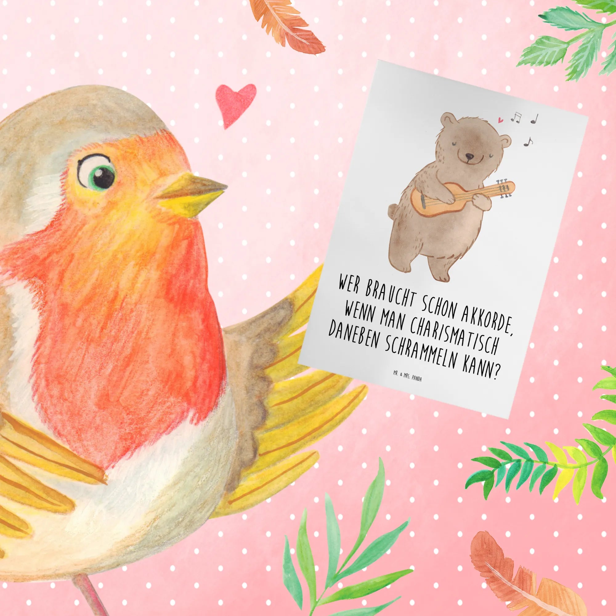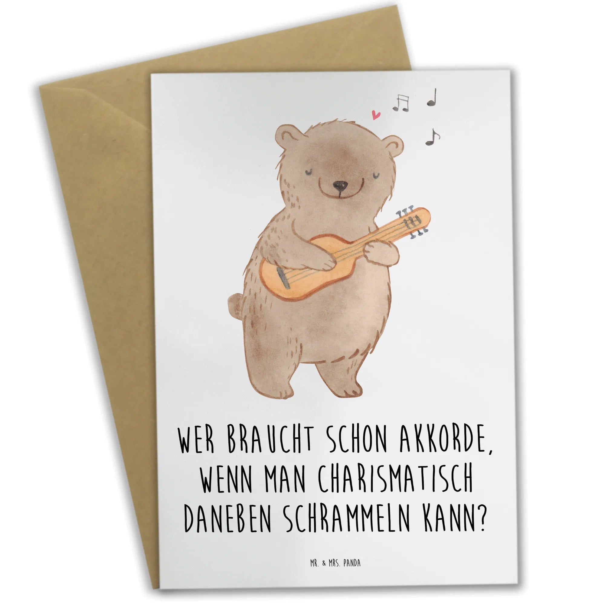 Die Grußkarte mit dem liebevollen Motiv einer Gitarre von Mr. & Mrs. Panda ist das perfekte Geschenk für alle Musikliebhaber und kreativen Köpfe. Mit einem sympathischen Spruch "Wer braucht schon Akkorde, wenn man charismatisch daneben schrammeln kann?" vermittelt diese Karte eine lockere und humorvolle Atmosphäre, die perfekt zu festlichen Anlässen passt.
