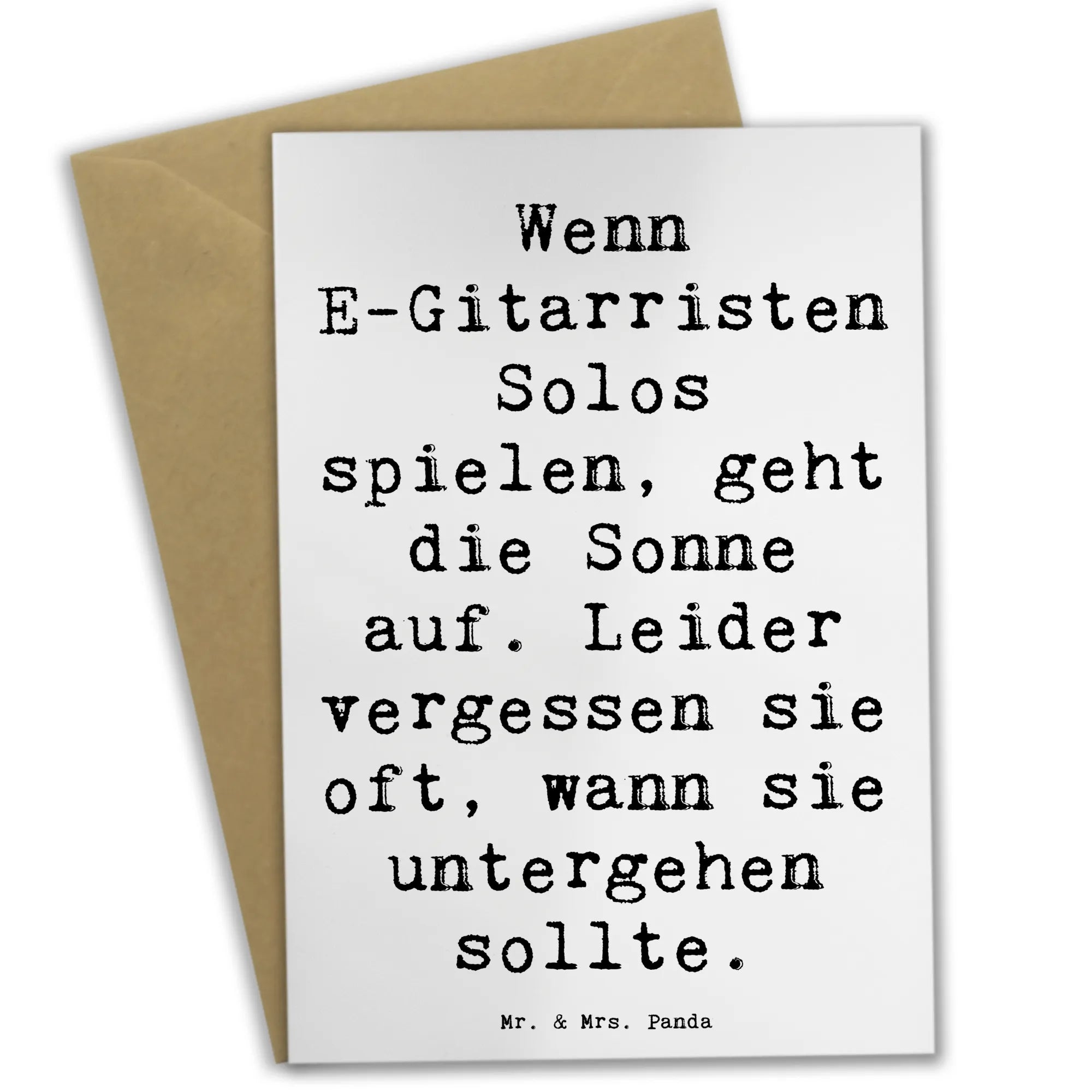 Die wunderschöne Grußkarte von Mr. & Mrs. Panda mit dem Motiv E-Gitarre ist das perfekte Geschenk für Musikliebhaber und E-Gitarristen. Sie eignet sich hervorragend zu vielen Anlässen: vom Geburtstag über die Hochzeit bis hin zu jedem feierlichen Moment, in dem deine kreativen Grüße gefragt sind. Augenblicklich zaubert diese Karte jedem Musikfan ein Lächeln ins Gesicht. Der originelle Spruch auf der Vorderseite: "Wenn E-Gitarristen Solos spielen, geht die Sonne auf. Leider vergessen sie oft, wann sie untergehen sollte." spricht nicht nur Gitarrespieler an, sondern alle, die Musik im Herzen tragen.