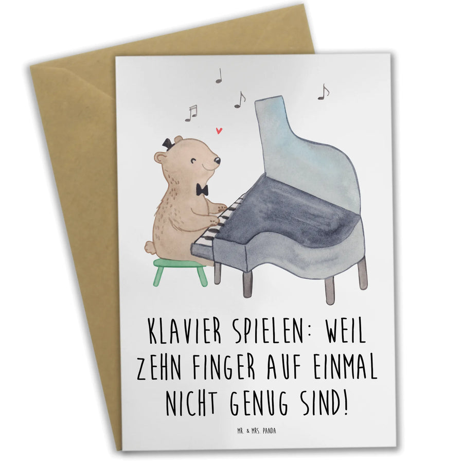 Mr. & Mrs. Panda Grußkarte Klavier – Für alle, die das Klavier lieben und die Magie der Musik feiern. Das Motiv zeigt ein stilvolles Klavier mit Elfenbeintasten in warmen Farben. Auf der Vorderseite lacht dich der Spruch an: "Klavier spielen: Weil zehn Finger auf einmal nicht genug sind!" – ein humorvoller, sympathischer Text, der Pianisten, Klavierschüler und Musiklehrer sofort ins Herz trifft. 🎶