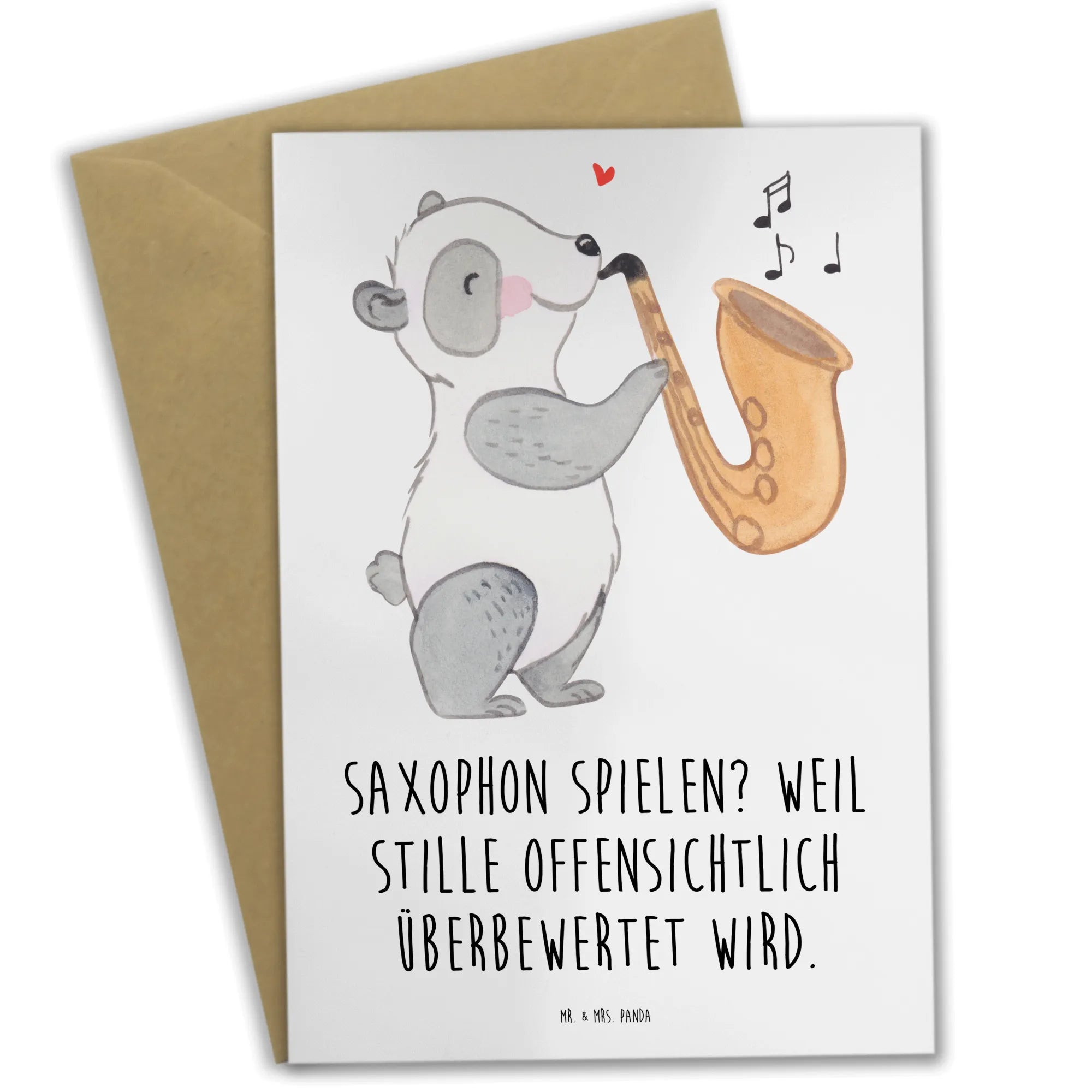 Die wunderschöne Grußkarte von Mr. & Mrs. Panda mit dem Motif "Saxophon" ist das perfekte Geschenk für alle Musikliebhaber. 🎷 Egal, ob du einen Freund hast, der ein leidenschaftlicher Musiker ist, oder jemanden, der als Hobby Saxophon spielt, diese Karte wird ein Lächeln auf ihre Gesichter zaubern.