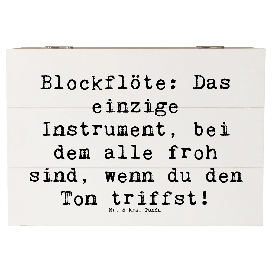 Der witzige Slogan „Blockflöte: Das einzige Instrument, bei dem alle froh sind, wenn du den Ton triffst!“ sorgt dafür, dass die Holzkiste nicht nur funktional ist, sondern auch für ein Lächeln sorgt.
