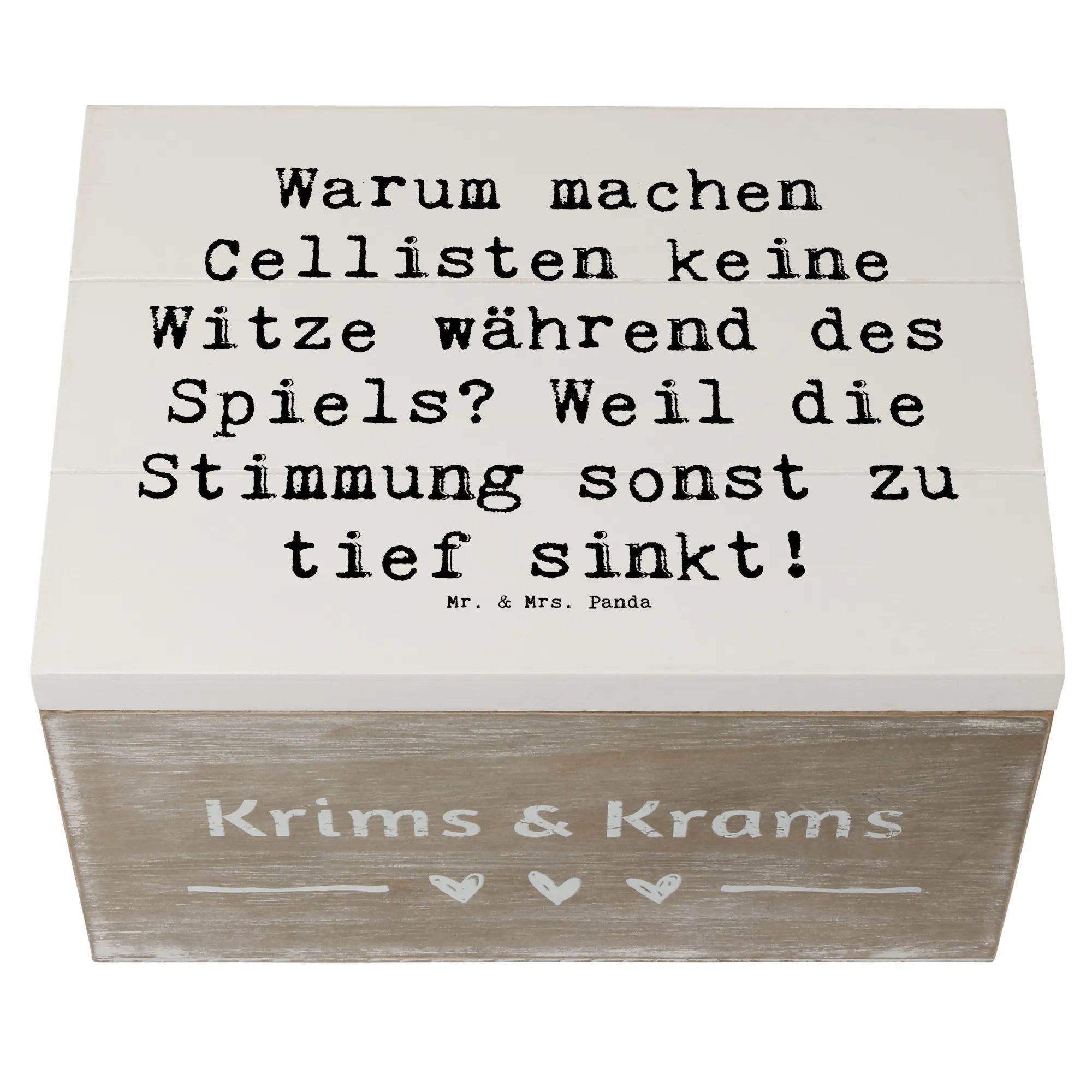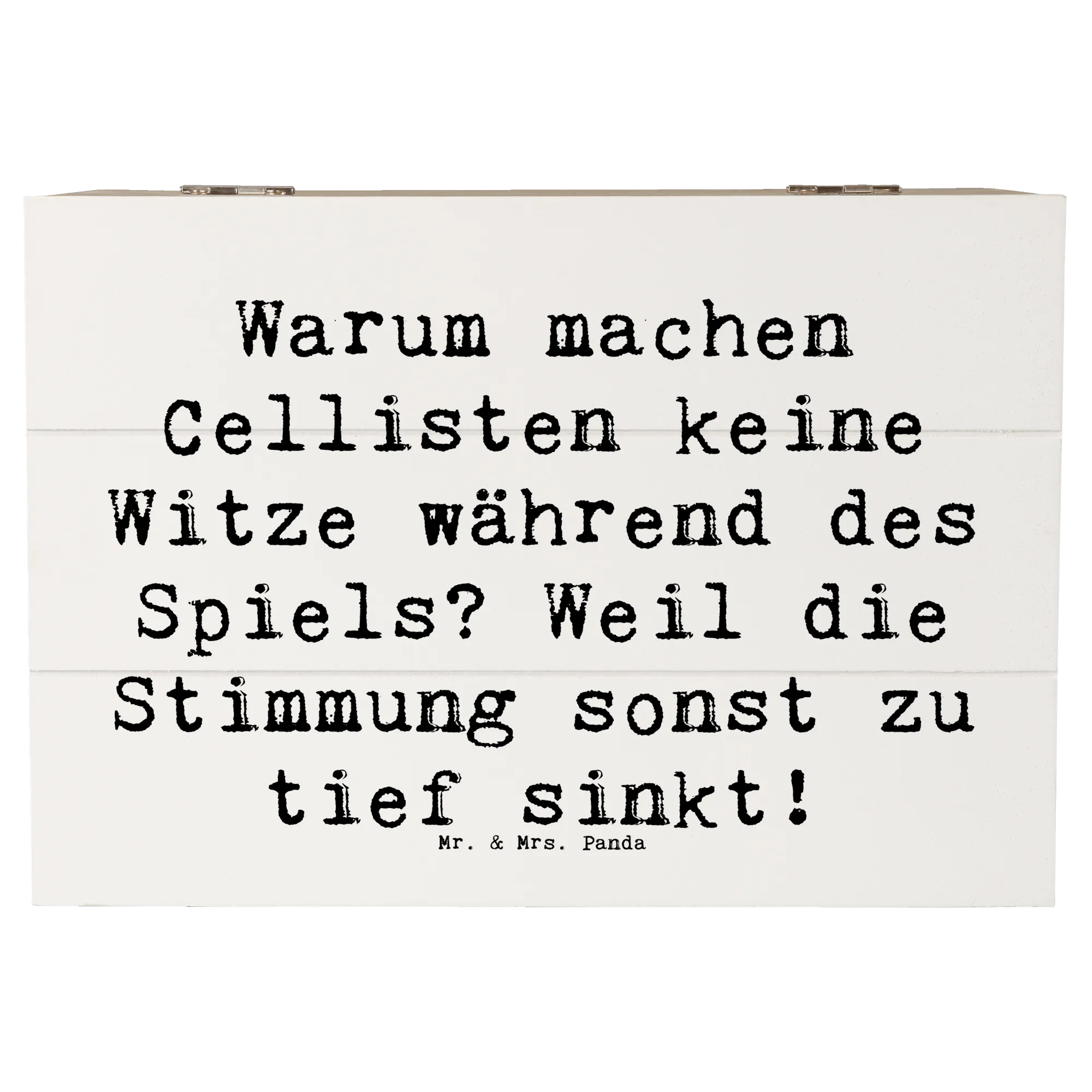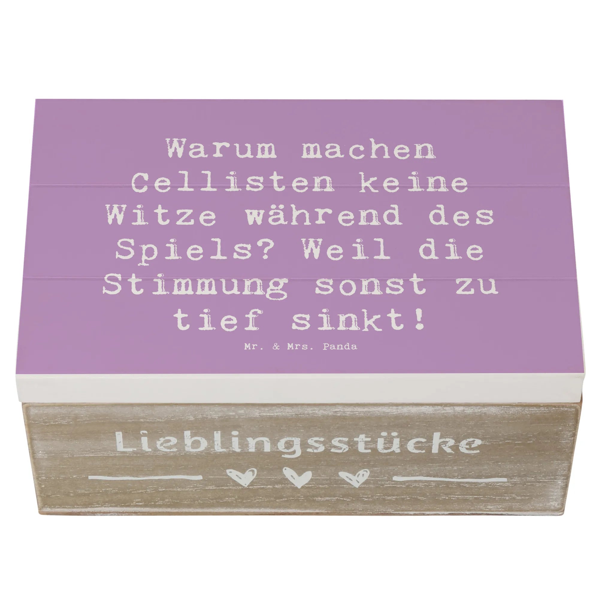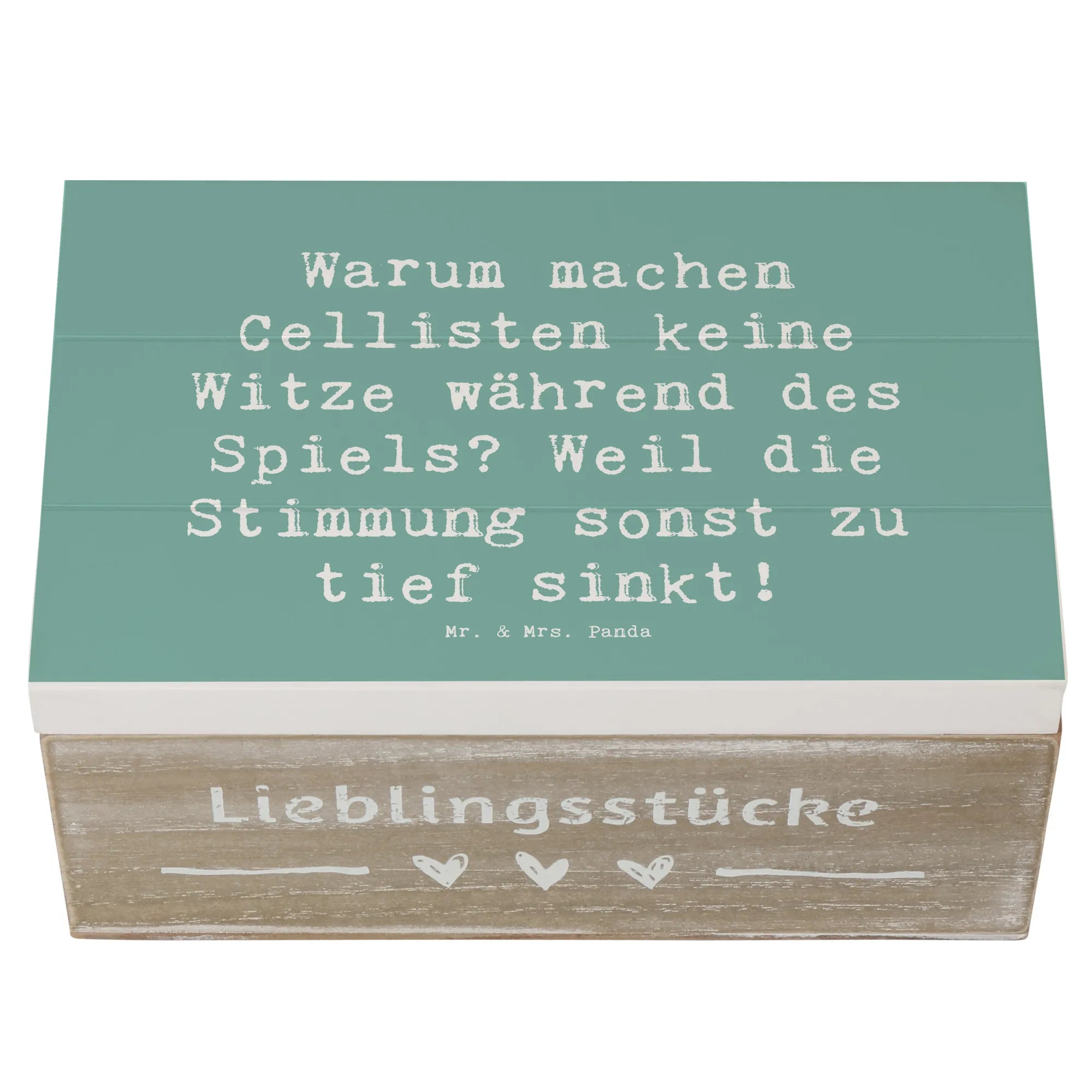 Eine wunderschöne Holzkiste von Mr. & Mrs. Panda, bedruckt mit einem charmanten Cello-Motiv und dem witzigen Spruch „Warum machen Cellisten keine Witze während des Spiels? Weil die Stimmung sonst zu tief sinkt!“. Diese Erinnerungskiste ist die ideale Geschenkbox für Musiker, Musikschüler und alle, die das Cellospiel lieben.