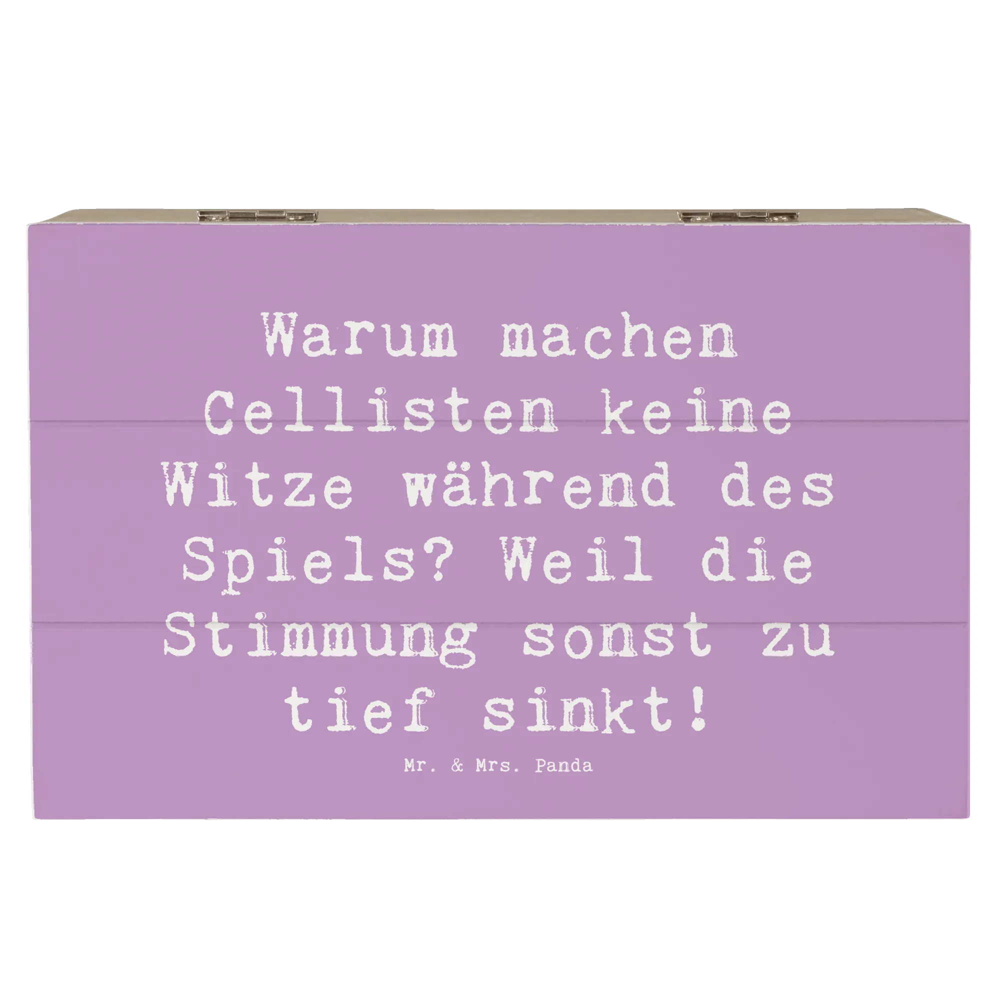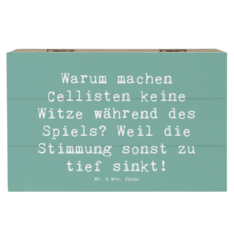 Entdecke die perfekte Holzkiste von Mr. & Mrs. Panda, bedruckt mit dem wunderbaren Cello-Motiv und dem witzigen Spruch: "Warum machen Cellisten keine Witze während des Spiels? Weil die Stimmung sonst zu tief sinkt!" Diese Holzkiste ist nicht nur ein Aufbewahrungsort für deine Schätze, sondern auch ein originelles Geschenk für Musikliebhaber und Cellisten.