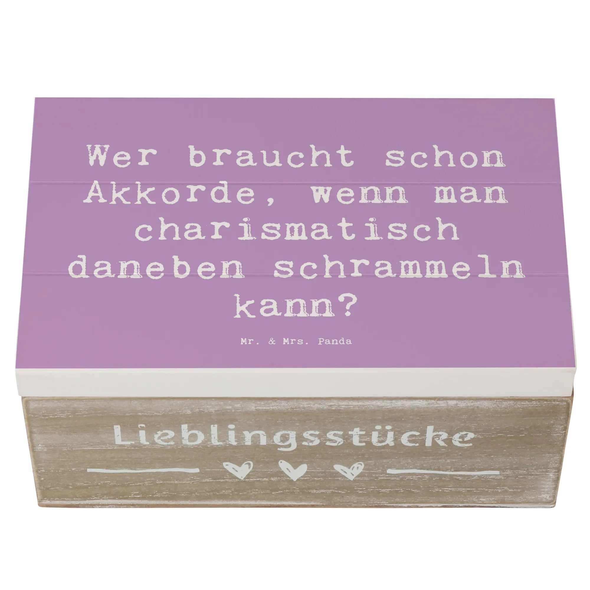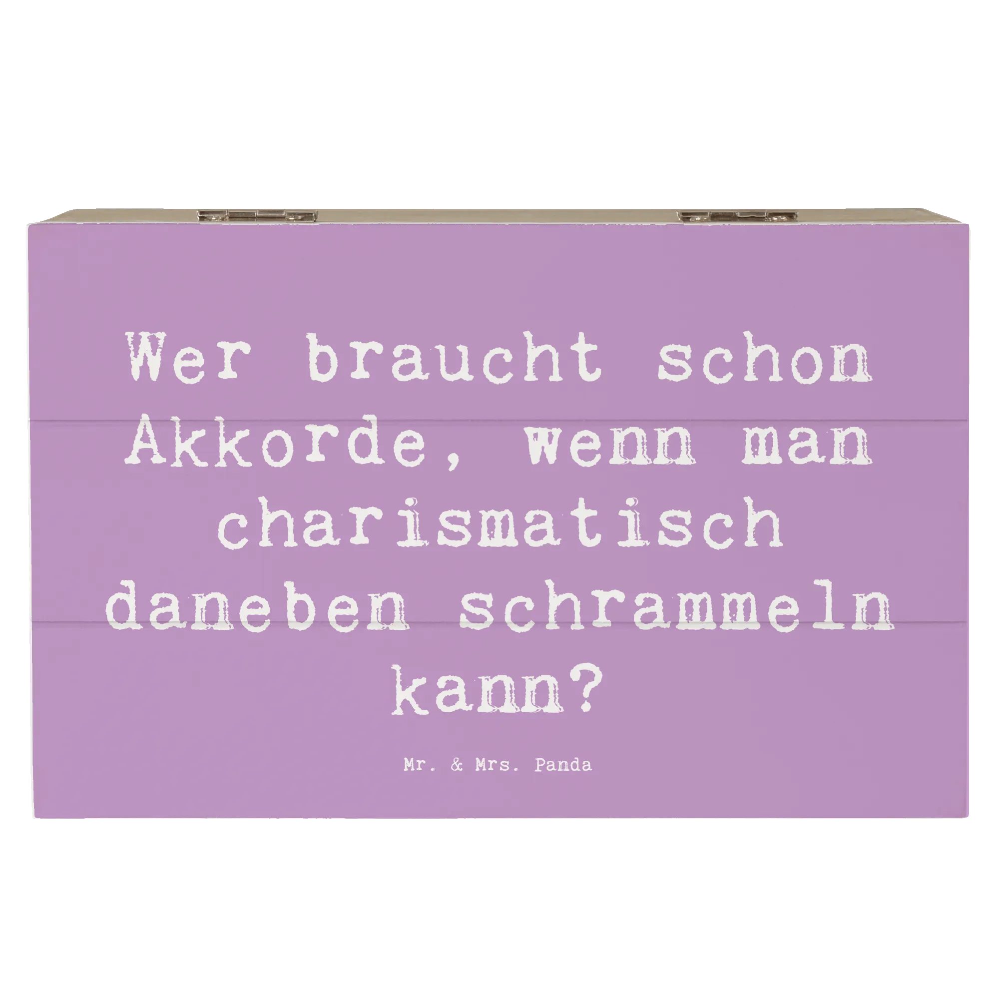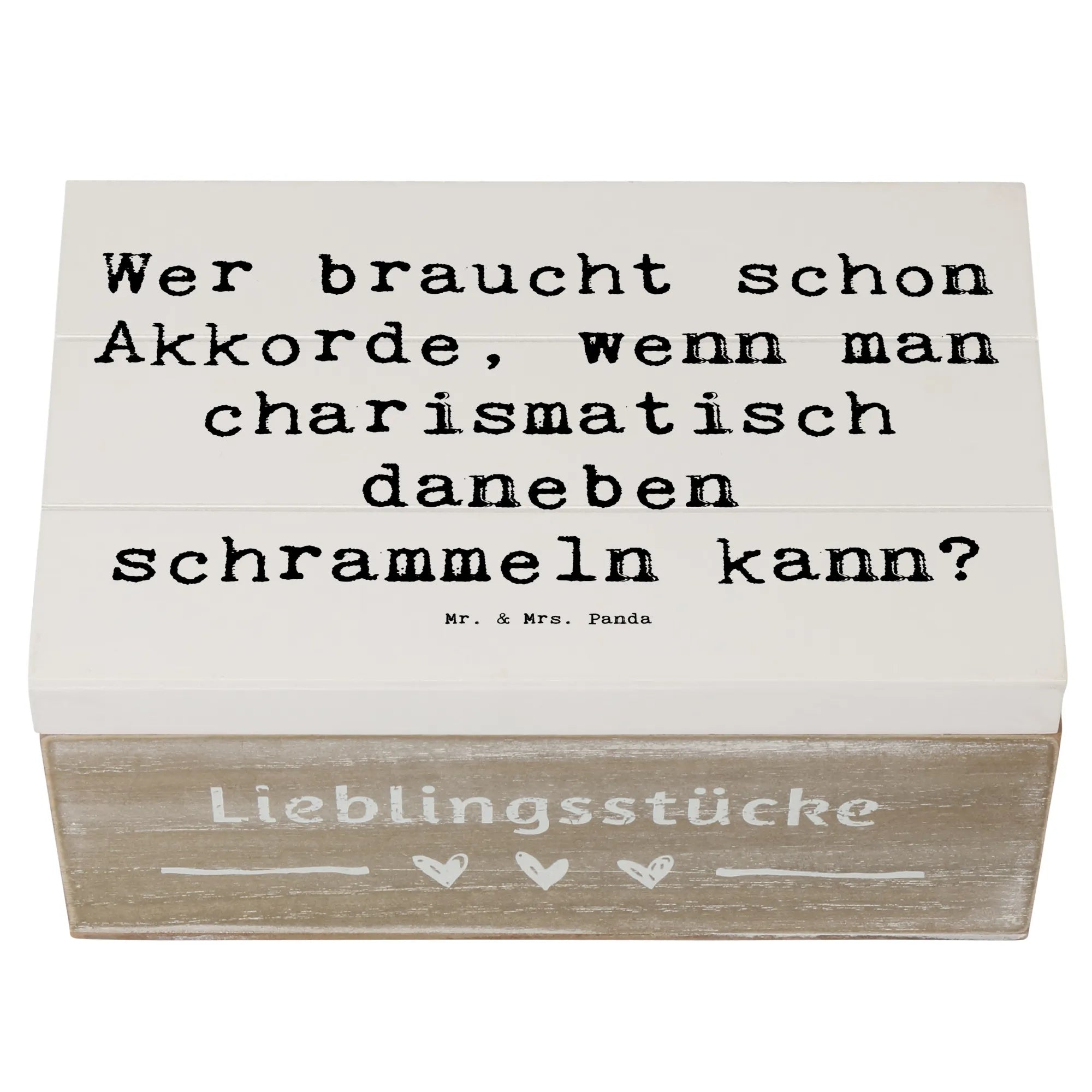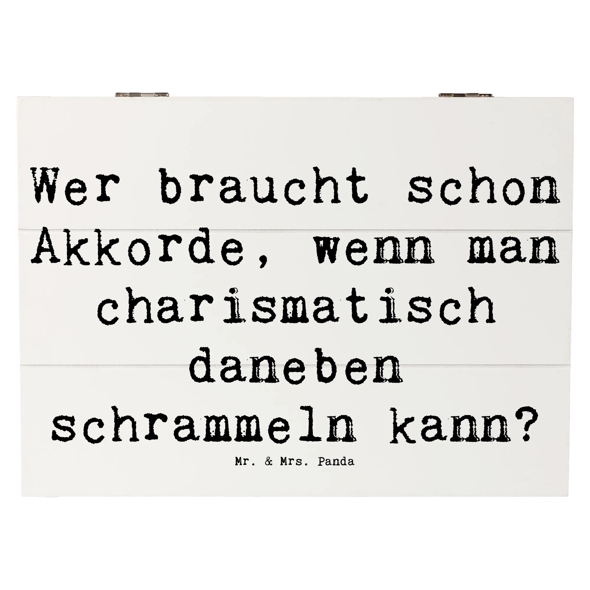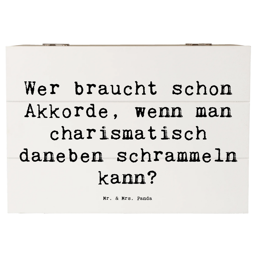 Mit dem Spruch "Wer braucht schon Akkorde, wenn man charismatisch daneben schrammeln kann?" bringt sie ein Lächeln auf die Lippen. Die Besonderheit der Einschlagscharniere sorgt dafür, dass sich die Kiste einfach öffnen und schließen lässt. Da sie nicht abschließbar ist, ist sie perfekt für jeden Tag im Gebrauch.