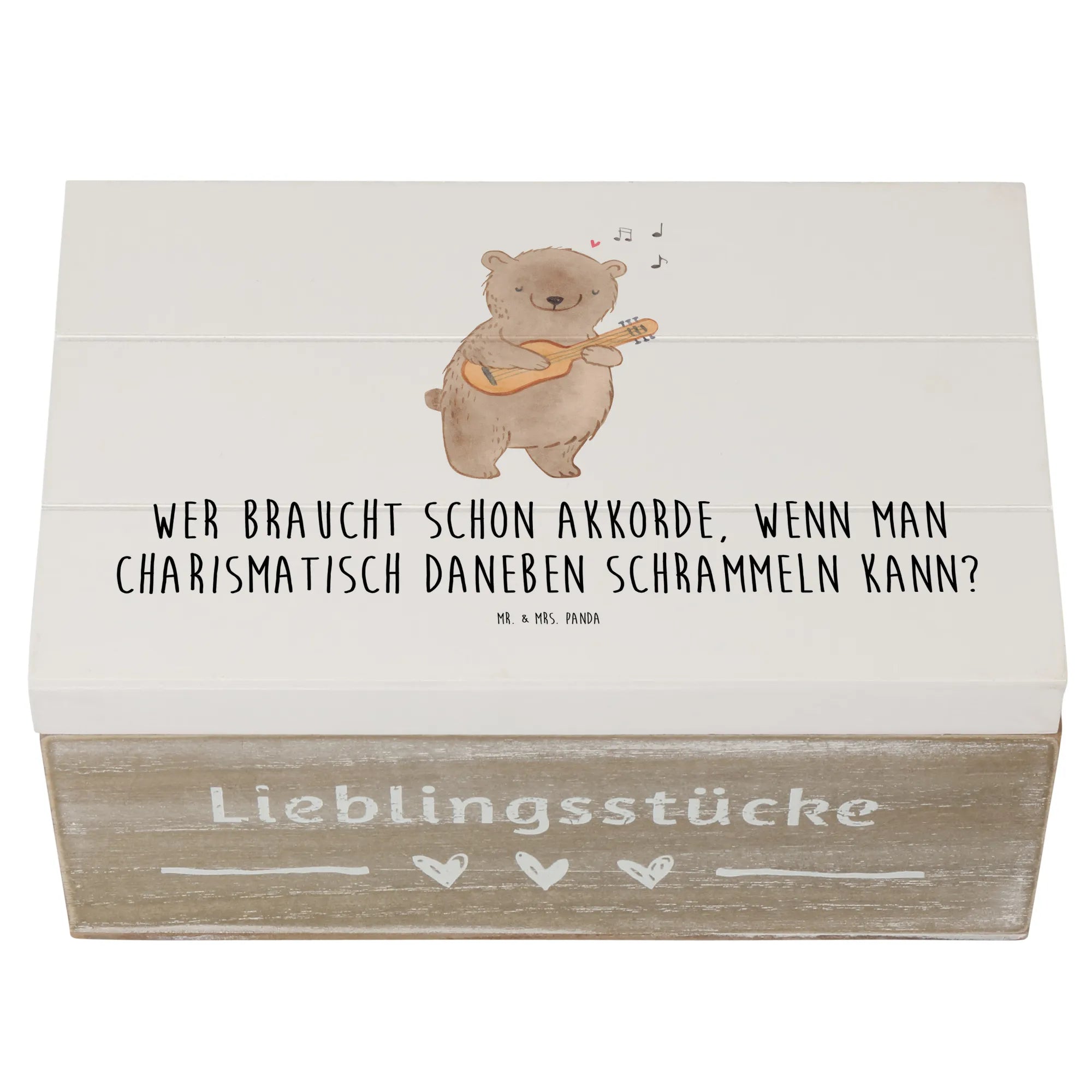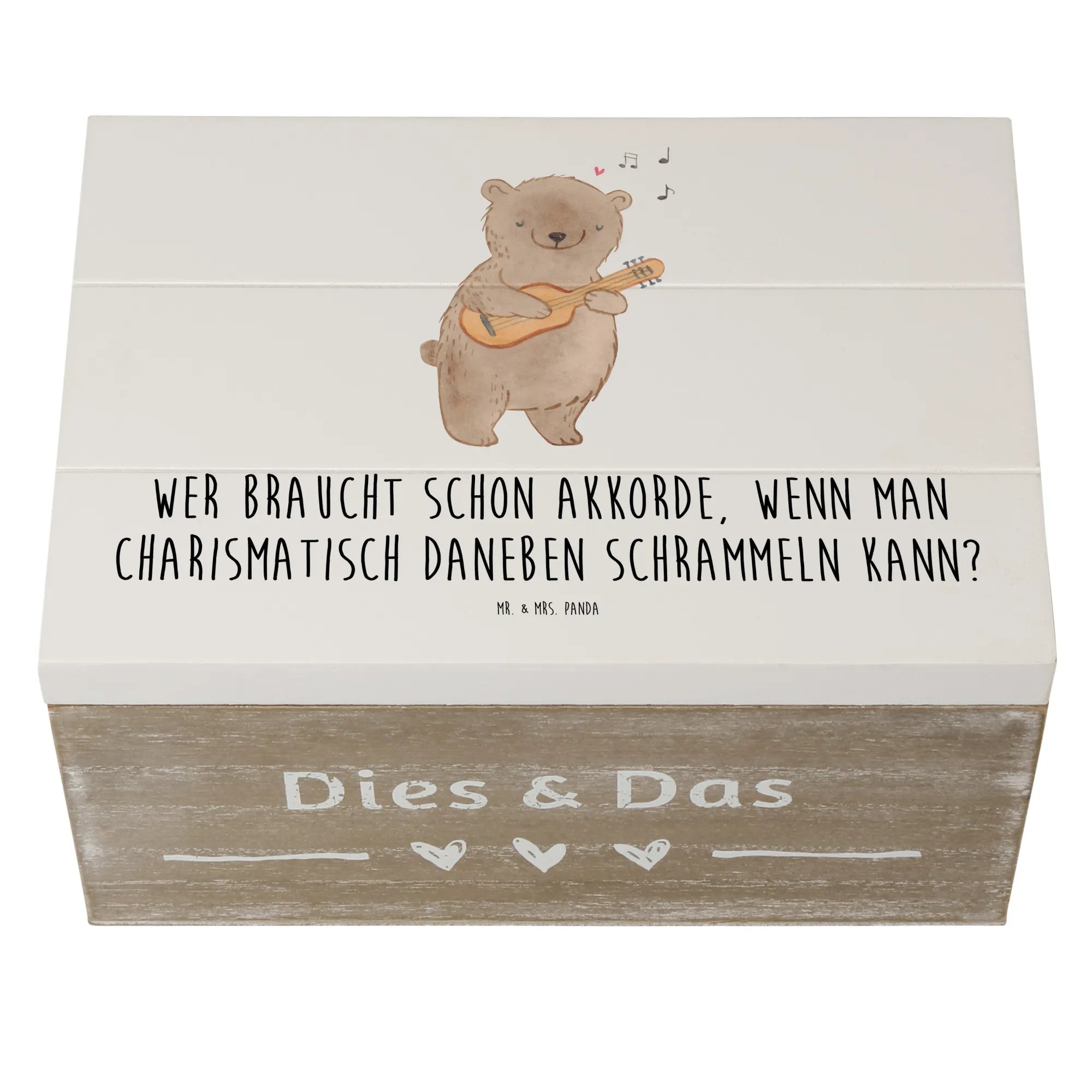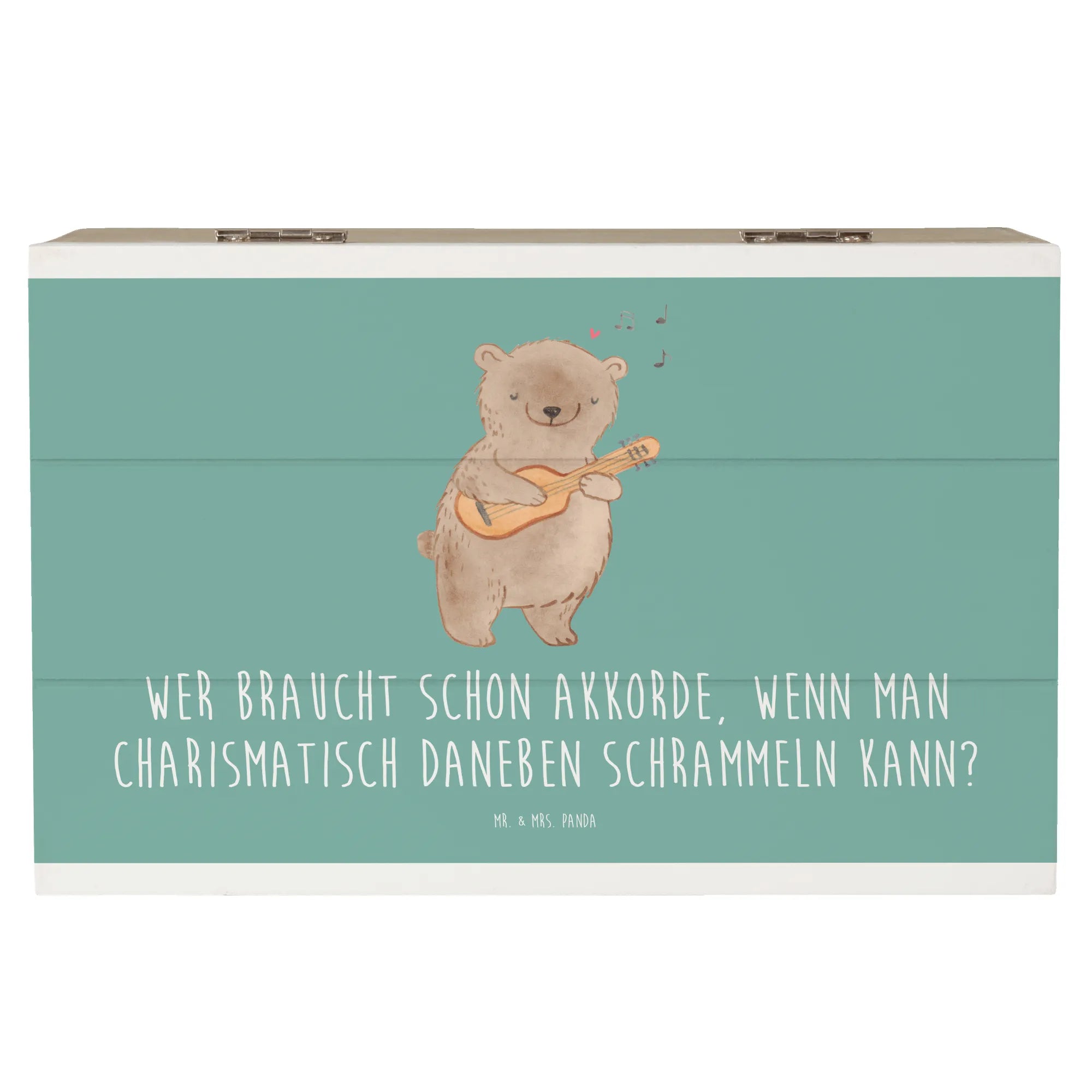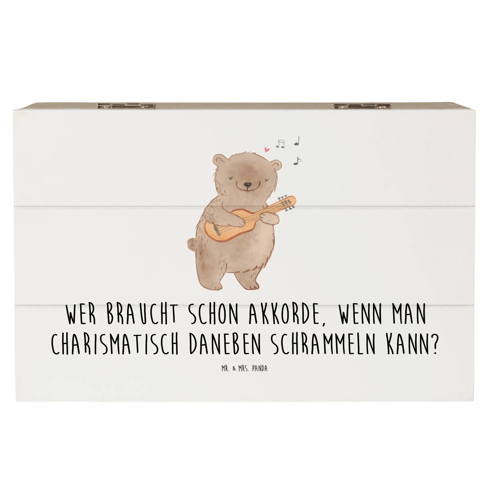 Mr. & Mrs. Panda Holzkiste Gitarre – die perfekte Kombination aus praktischer Aufbewahrung und musikalischem Herz. Dieses liebevoll gestaltete Schmuckstück ist ideal als Erinnerungskiste, Schatzkiste oder stilvolle Geschenkbox für alle, die Musik, Gitarrenklänge und kreative Melodien lieben. Auf der weißen Oberfläche prangt eine Gitarre als Symbol für Leidenschaft, Kreativität und Freiheit. Der freche Spruch „Wer braucht schon Akkorde, wenn man charismatisch daneben schrammeln kann?“ macht die Kiste zu einem persönlichen und humorvollen Geschenk.