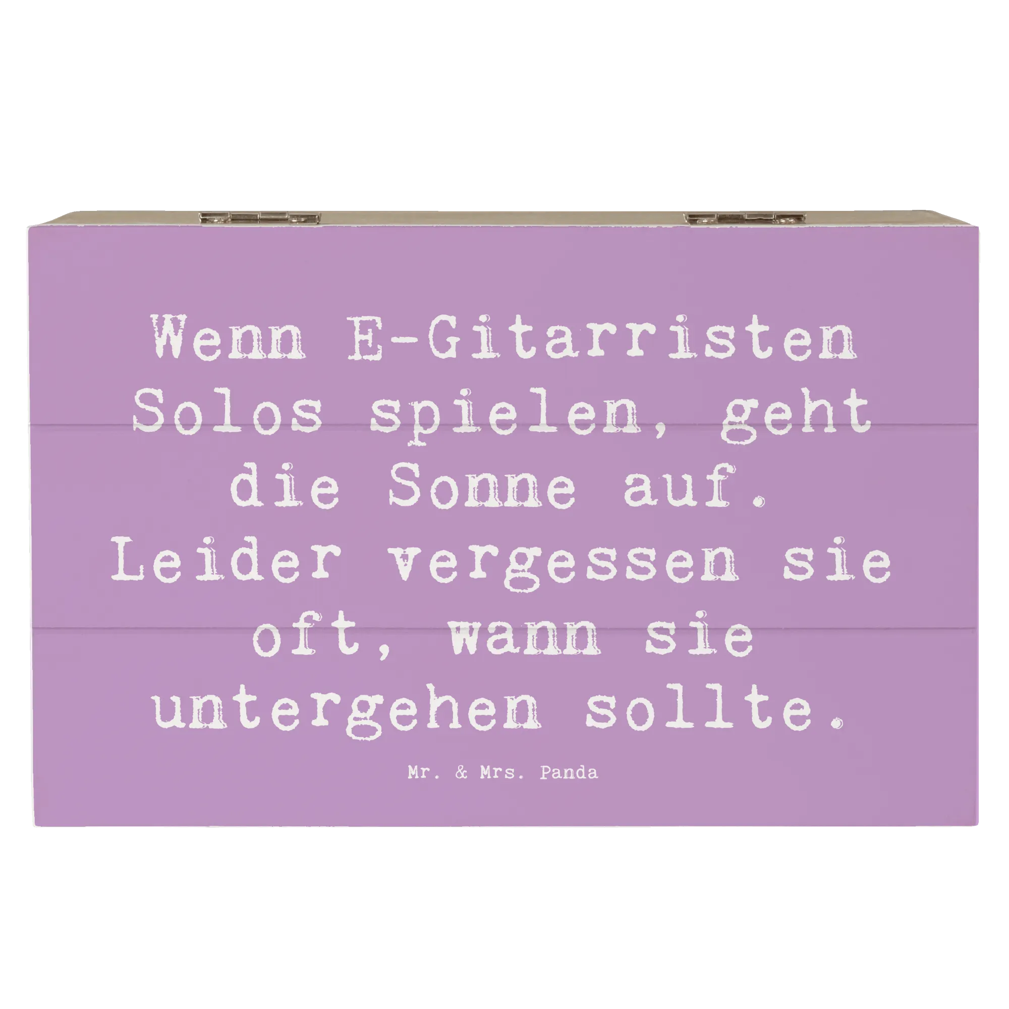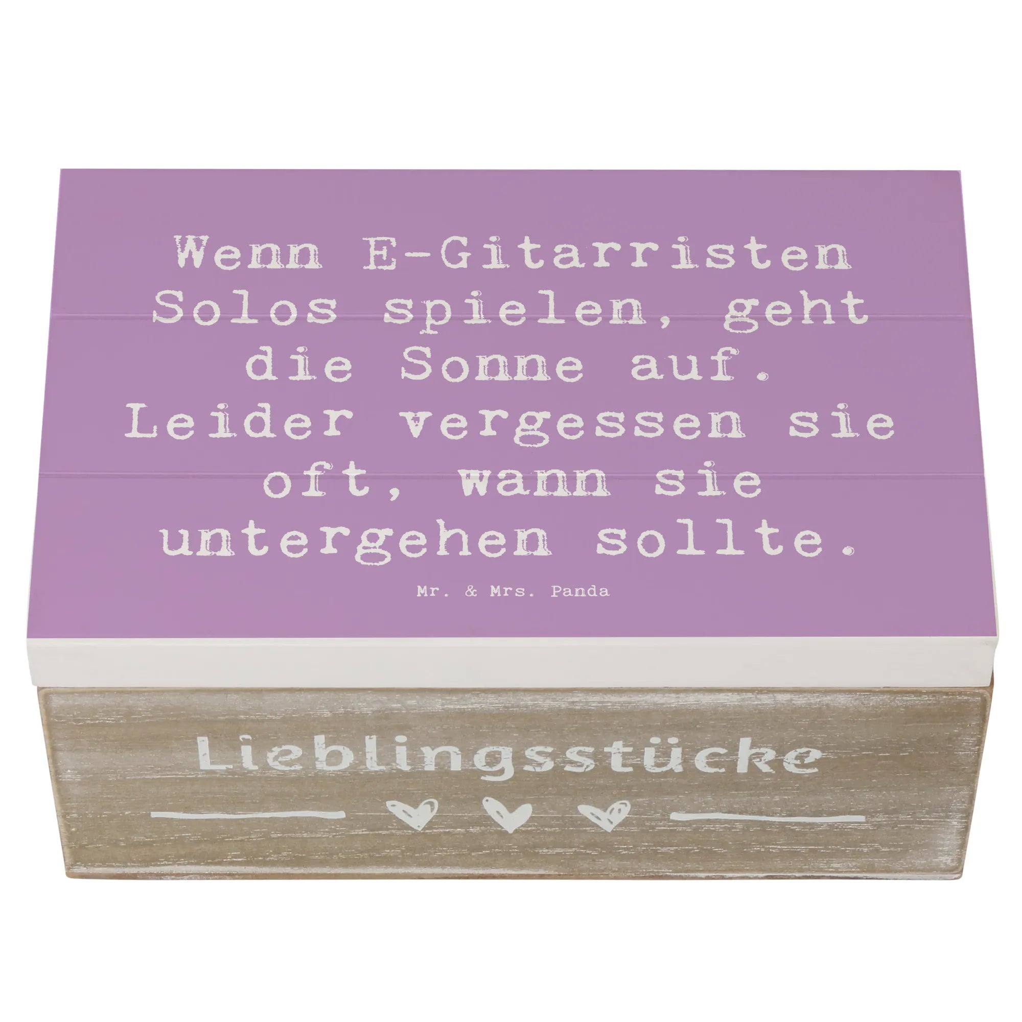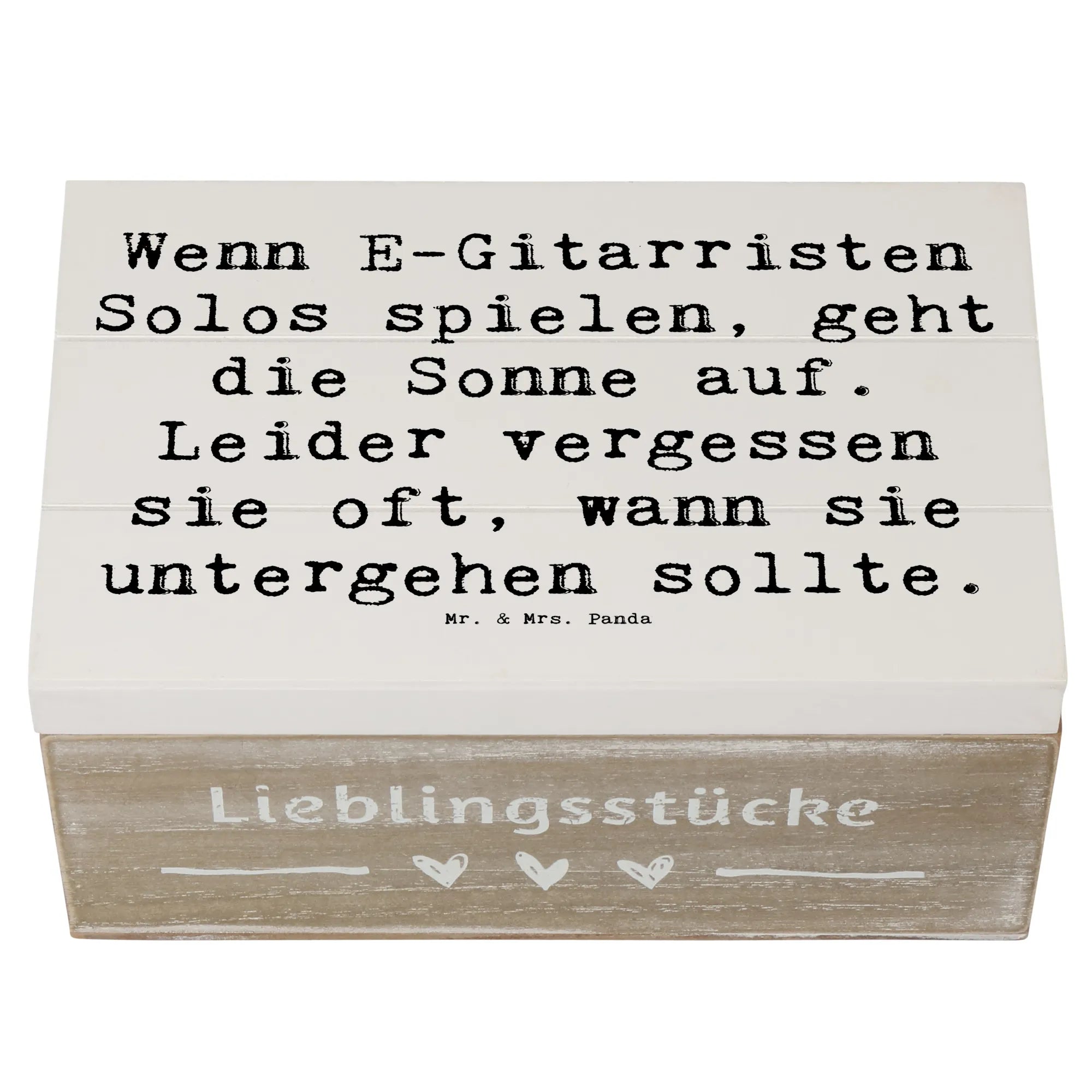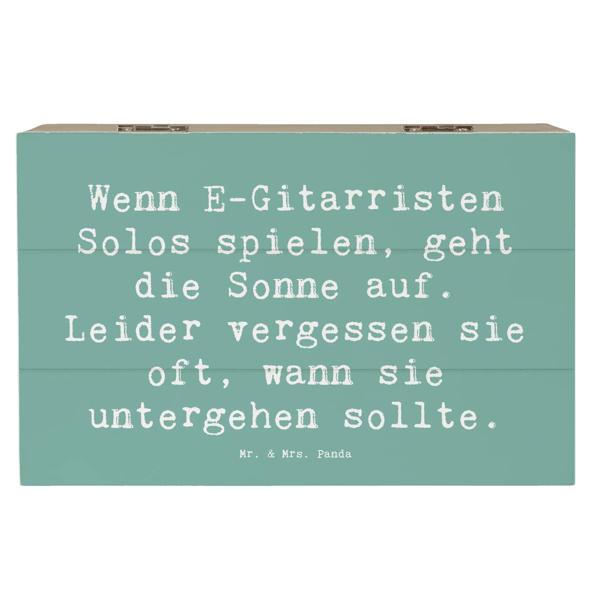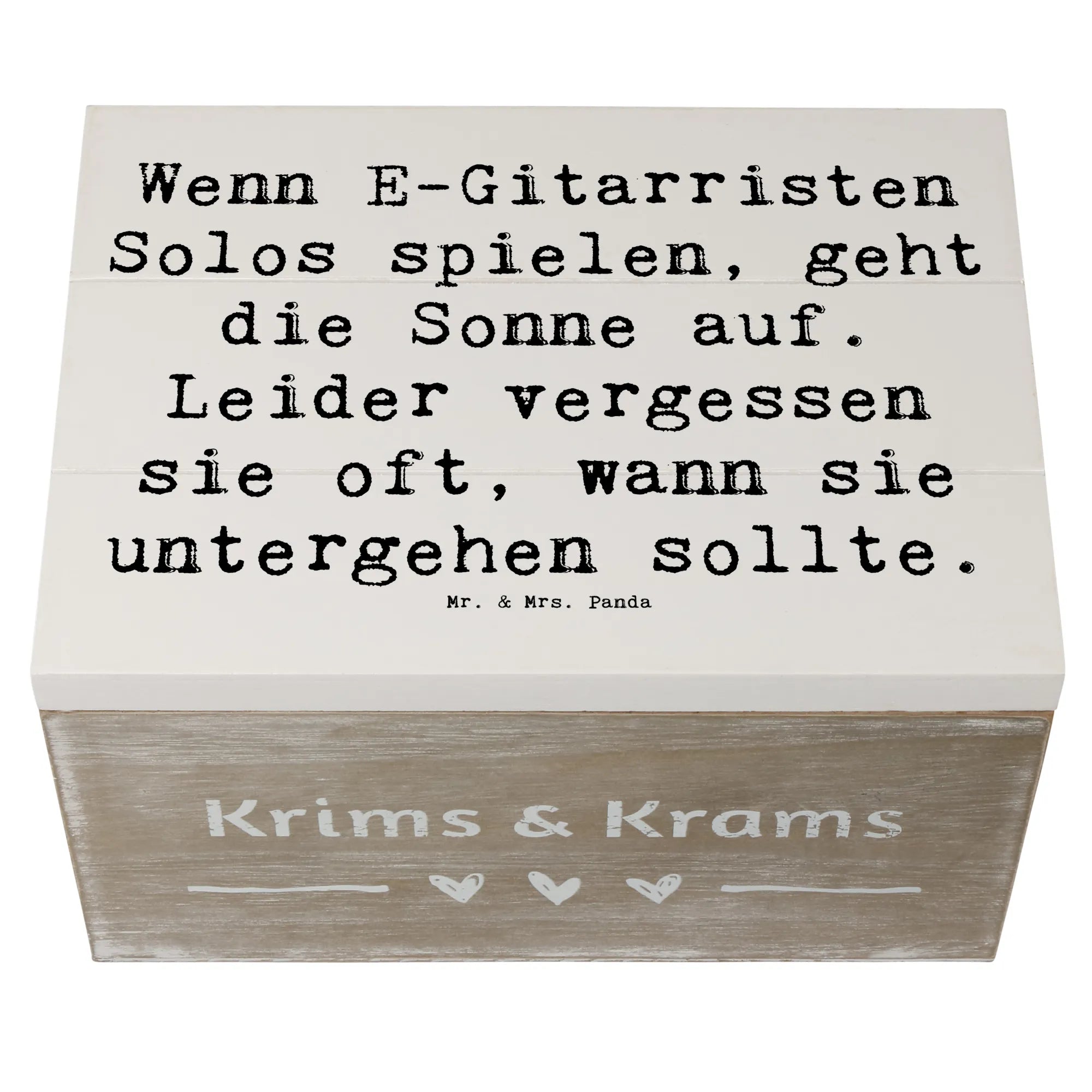Die mit einem liebevollen Spruch bedruckte Kiste, die besagt: 'Wenn E-Gitarristen Solos spielen, geht die Sonne auf. Leider vergessen sie oft, wann sie untergehen sollte.', wird jeden E-Gitarristen zum Schmunzeln bringen und ist eine tolle Ergänzung für jedes Musikzimmer.