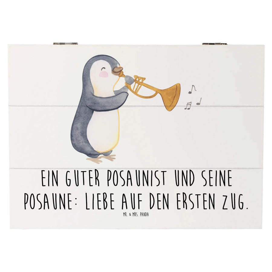 Unsere Holzkiste mit dem Motiv Posaune aus der Kollektion Musizieren & Instrumente von Mr. & Mrs. Panda ist das ideale Geschenk für alle, die Musik leben. Der charmante Spruch „Ein guter Posaunist und seine Posaune: Liebe auf den ersten Zug.“ zaubert ein Lächeln auf die Lippen von Posaunisten, Orchestermitgliedern und Blasmusik-Freunden.