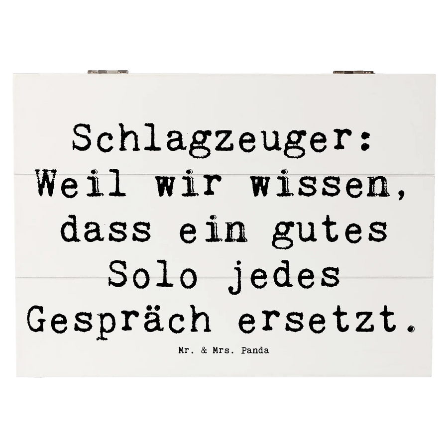 Die wunderschöne Holzkiste von Mr. & Mrs. Panda ist das perfekte Geschenk für alle Musikliebhaber, insbesondere für Schlagzeuger und Drummer. Diese bezaubernde Kiste ist nicht nur mit einem beeindruckenden Schlagzeug-Motiv versehen, sondern auch mit dem witzigen Spruch: 'Schlagzeuger: Weil wir wissen, dass ein gutes Solo jedes Gespräch ersetzt.'