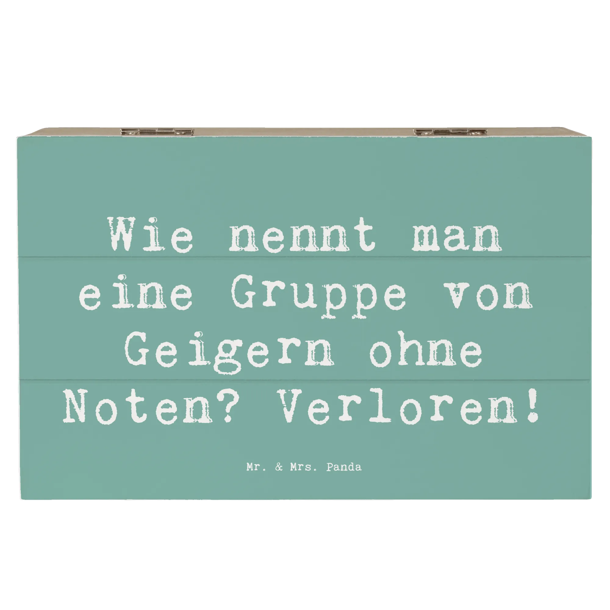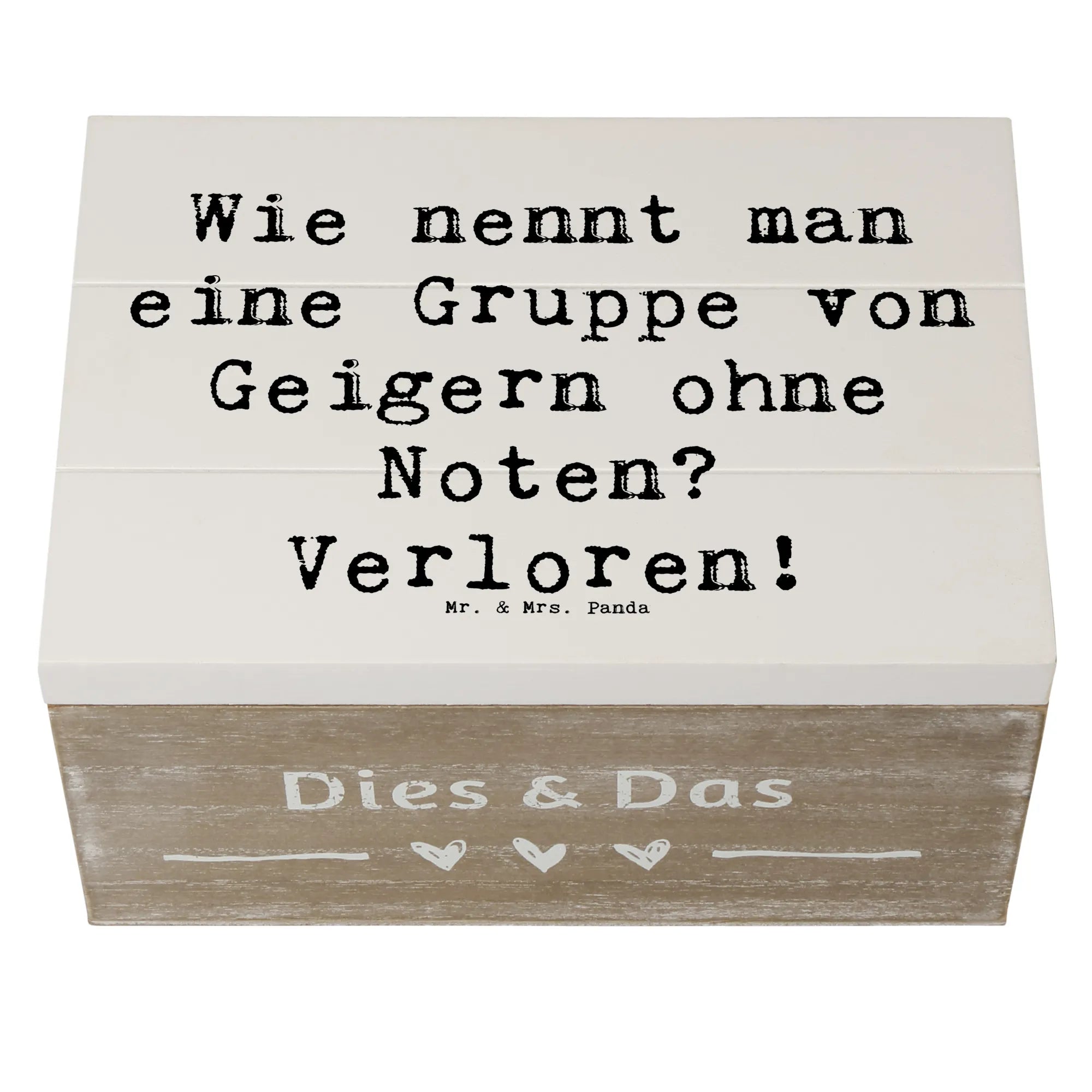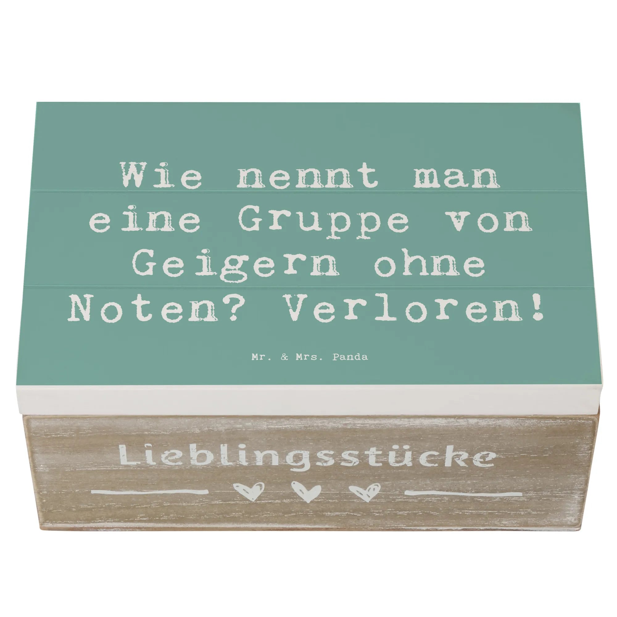 Der eingearbeitete Spruch "Wie nennt man eine Gruppe von Geigern ohne Noten? Verloren!" verleiht der Kiste eine humorvolle Note und versüßt so das Aufbewahren und Verschenken. Die Kiste ist zudem mit Einschlagscharnieren ausgestattet, die ein einfaches Öffnen und Schließen ermöglichen. Denk daran, dass diese Kiste nicht abschließbar ist, was sie zu einem perfekten Ort für alles macht, was du zur Hand haben möchtest.