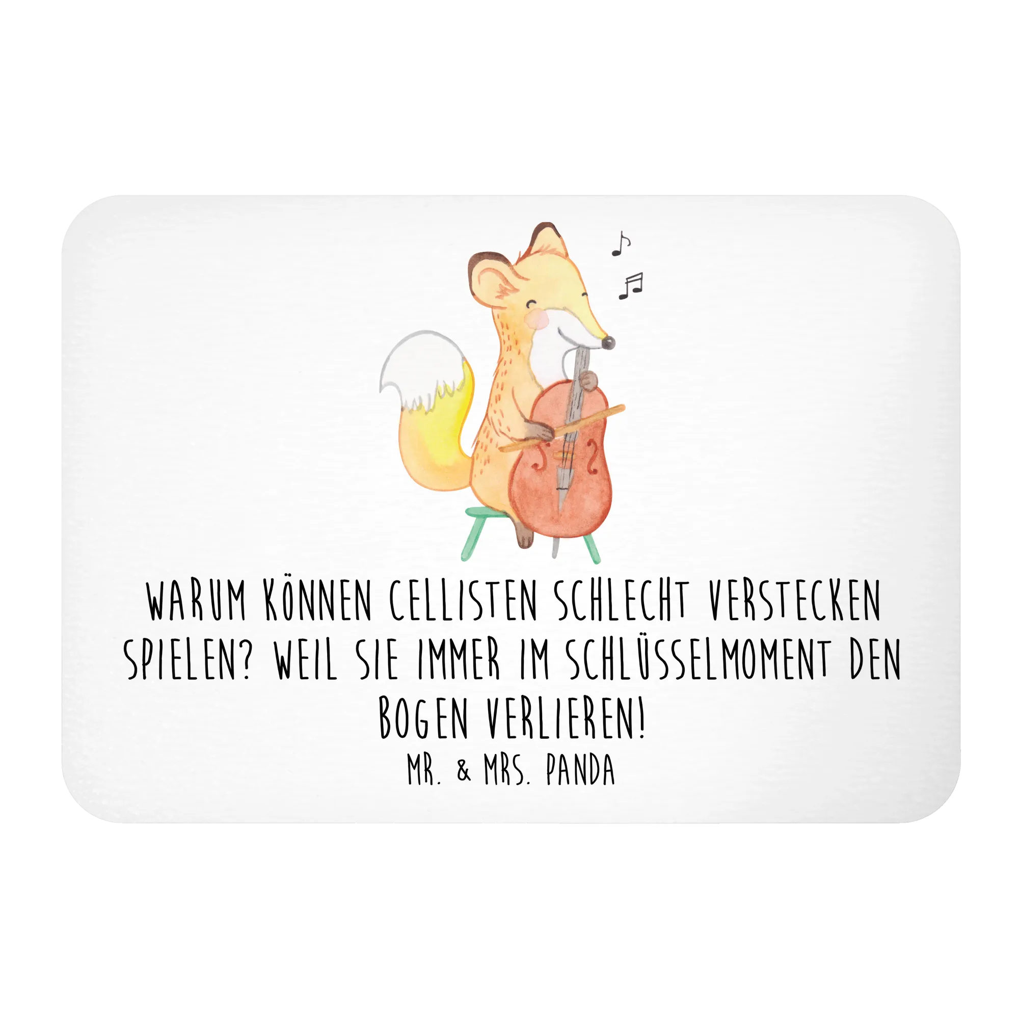 Auf seinem farbenfrohen Design ziert eine witzige Spruch, die jeden Musikfan zum Schmunzeln bringt: „Warum können Cellisten schlecht Verstecken spielen? Weil sie immer im Schlüsselmoment den Bogen verlieren!".