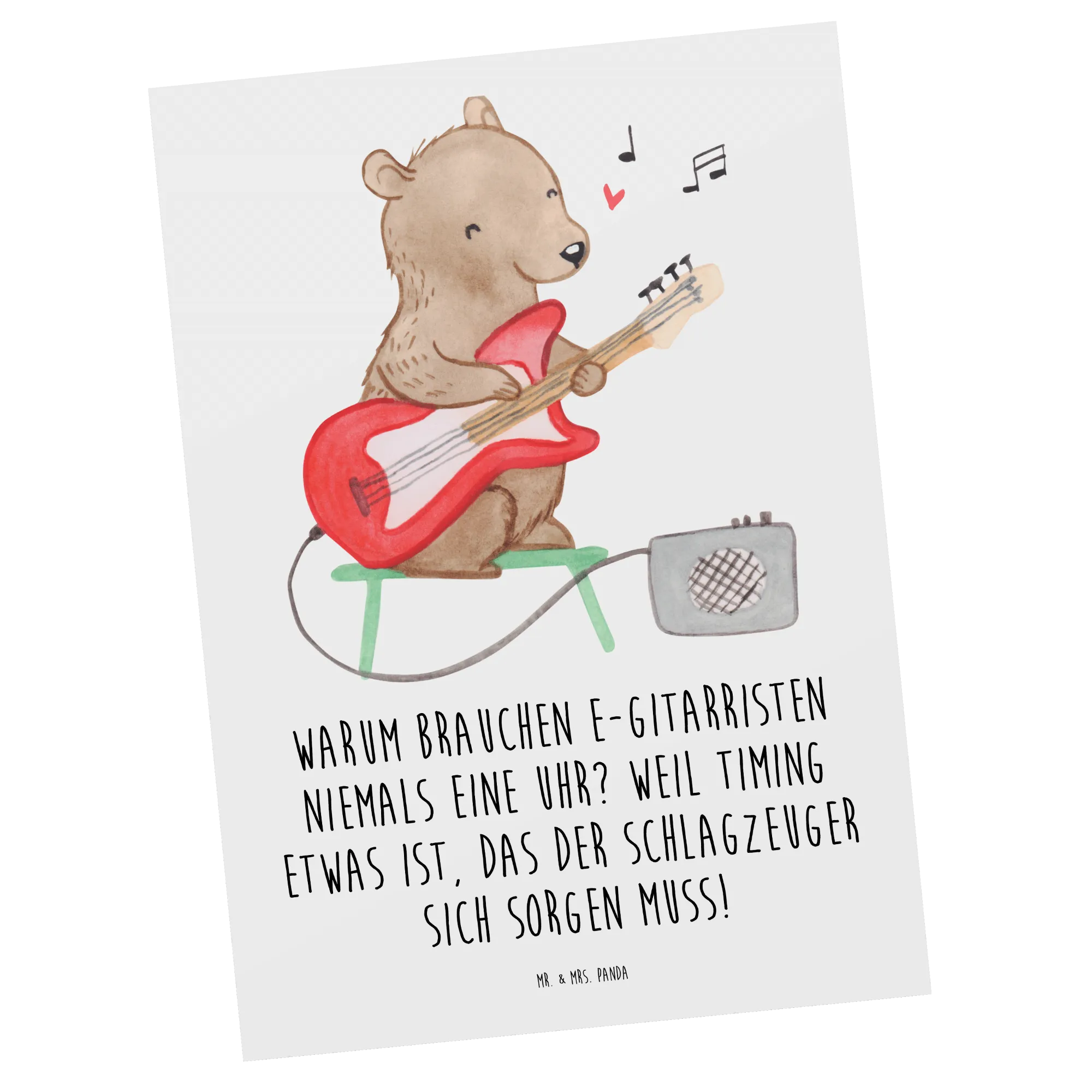 Die Postkarte mit der E-Gitarre aus der Kollektion "Musizieren & Instrumente" von Mr. & Mrs. Panda ist das perfekte Geschenk für alle Musikliebhaber und E-Gitarristen. Sie beeindruckt nicht nur durch ihr einzigartiges Design, sondern auch durch ihren humorvollen Slogan: "Warum brauchen E-Gitarristen niemals eine Uhr? Weil Timing etwas ist, das der Schlagzeuger sich sorgen muss!" Egal ob zu einem Geburtstag, als Einladung zu einem Konzert oder einfach nur so, diese Karte bringt nicht nur Freude, sondern auch ein Lächeln auf die Gesichter der Beschenkten.