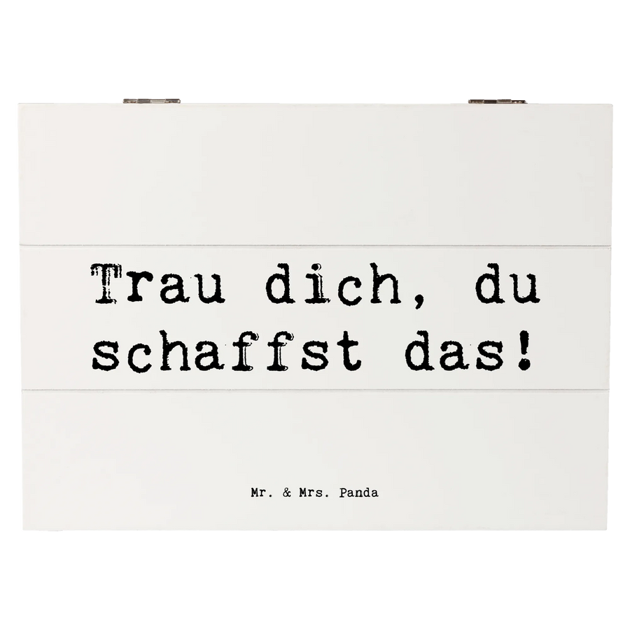 Die wunderschöne Holzkiste von Mr. & Mrs. Panda mit dem Motiv 'Angst überwinden' ist mehr als nur eine Aufbewahrungsbox – sie ist ein wahrhaftiger Mutmacher! Jedes Mal, wenn Du diese Kiste öffnest, wirst Du daran erinnert, dass Du Deine Ängste besiegen kannst und dass Du die Kraft hast, alles zu erreichen, was Du Dir wünschst. Mit dem inspirierenden Slogan 'Trau dich, du schaffst das!' im Inneren, ist diese Kiste der perfekte Ort für all die kleinen und großen Schätze deines Lebens!