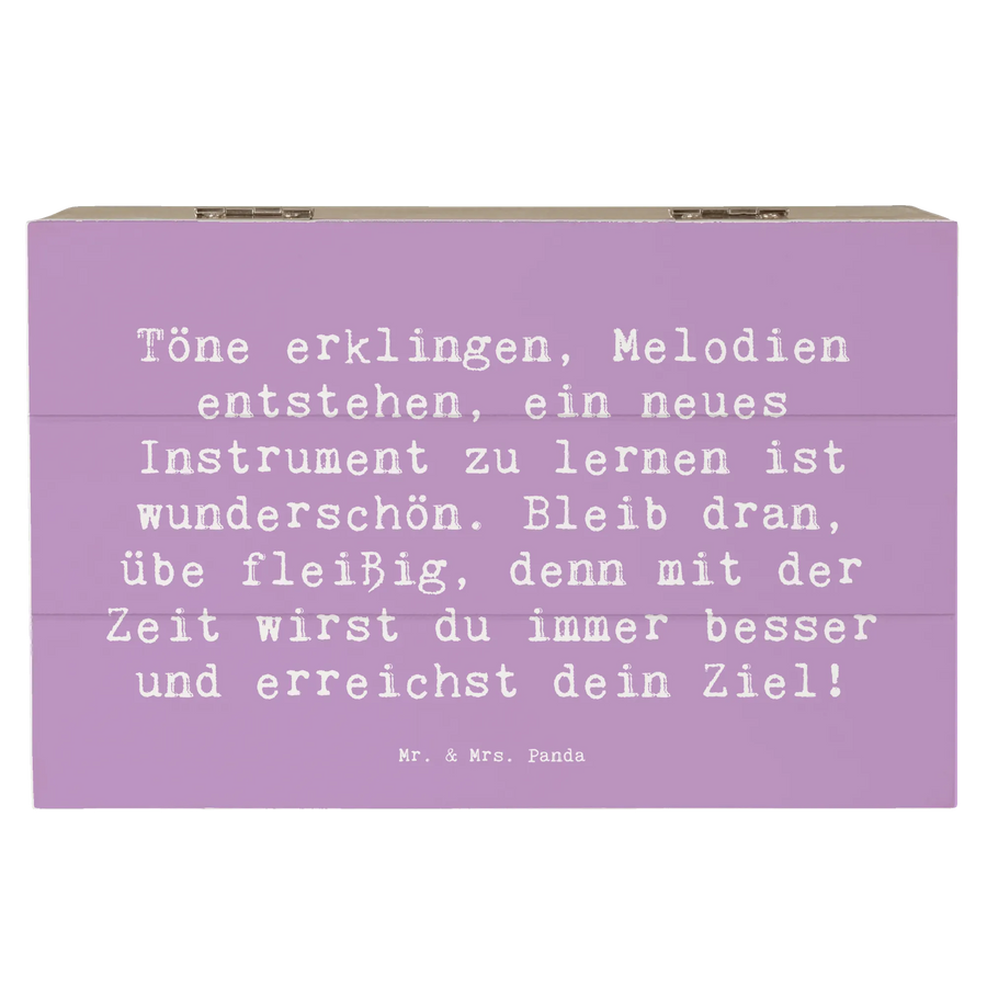 Entdecke die wunderschöne Holzkiste von Mr. & Mrs. Panda, die mit dem inspirierenden Spruch "Töne erklingen, Melodien entstehen, ein neues Instrument zu lernen ist wunderschön. Bleib dran, übe fleißig, denn mit der Zeit wirst du immer besser und erreichst dein Ziel!" versehen ist.