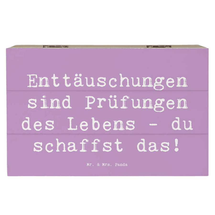 Wenn du auf der Suche nach dem perfekten Geschenk für einen lieben Menschen bist, dann ist die Holzkiste "Mit Enttäuschungen umgehen" aus der Mutmacher-Kollektion von Mr. & Mrs. Panda genau das Richtige! Diese wunderschöne Holzkiste bietet nicht nur Platz für die wertvollsten Erinnerungen, sondern trägt auch eine wichtige Botschaft: "Enttäuschungen sind Prüfungen des Lebens - du schaffst das!"