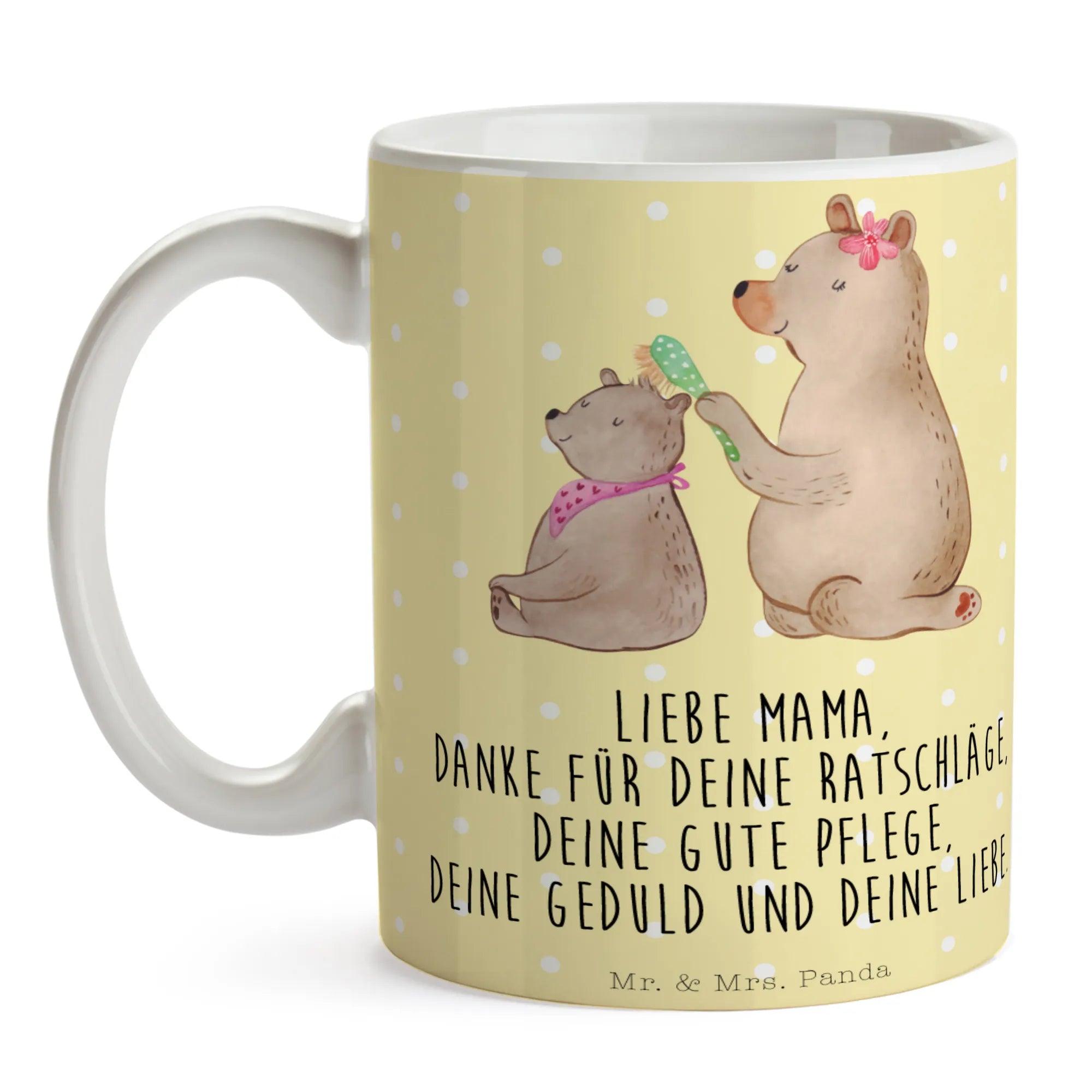 Diese Keramiktasse zeigt einen liebevollen großen Bären, der mit Sanftheit und Hingabe das Haar seines kleinen Bären kämmt, während dieser entspannt die Augen schließt und die Zuneigung genießt. Mit dem Slogan "Liebe Mama, danke für deine Ratschläge, deine gute Pflege, deine Geduld und deine Liebe" wird jeder Schluck aus dieser Tasse zu einem ganz besonderen Moment.