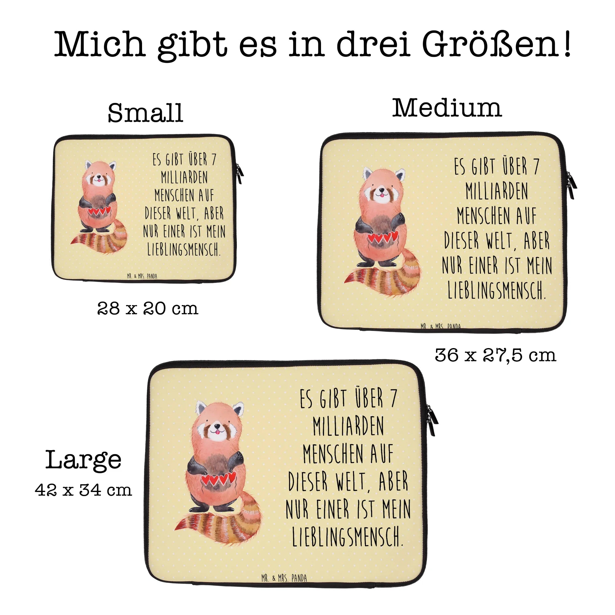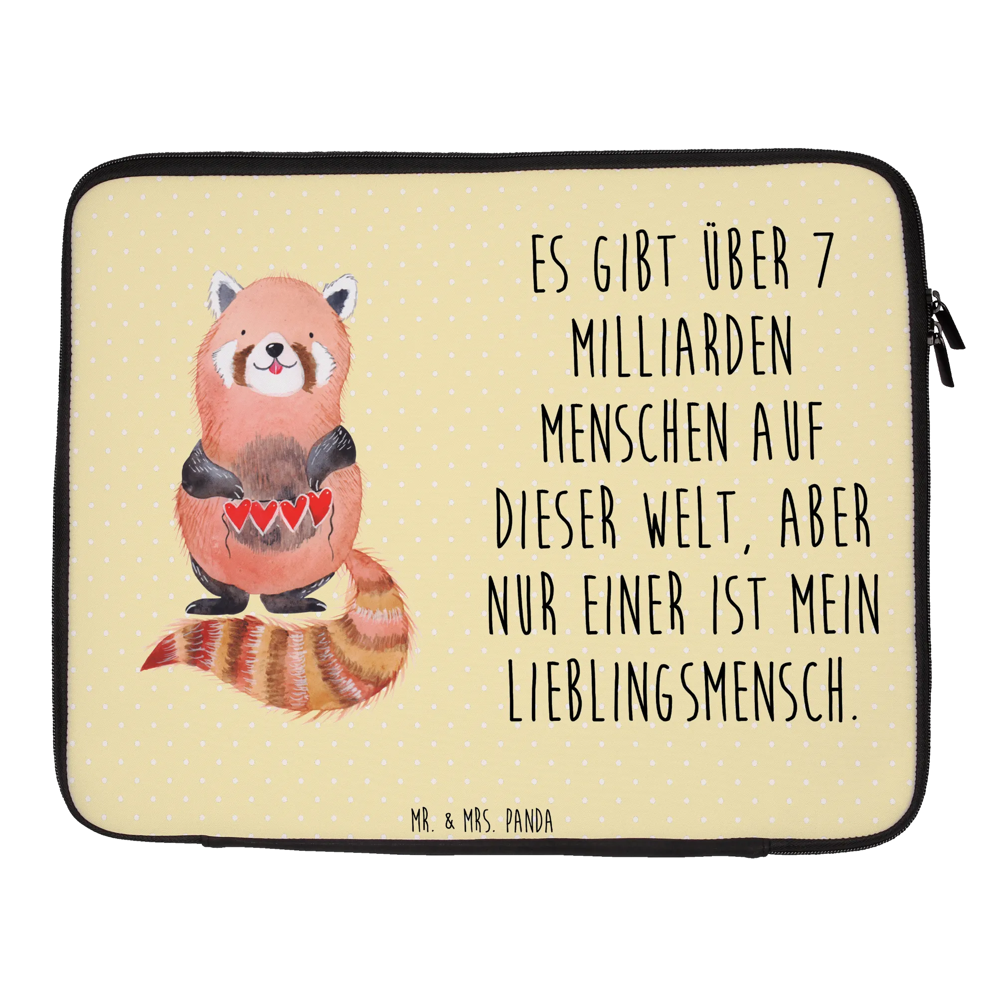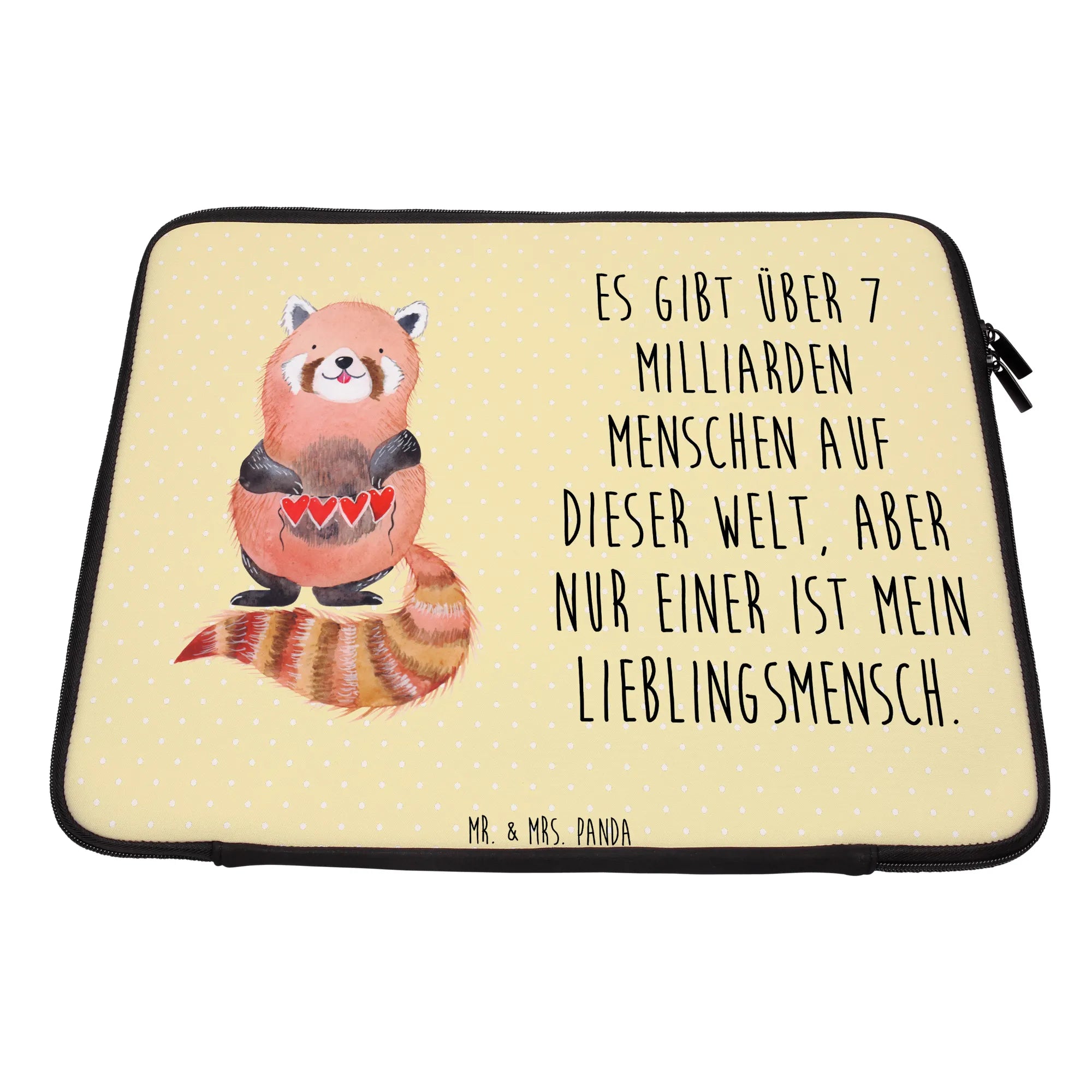 Die Notebook Tasche mit dem bezaubernden Motiv des roten Pandas ist die perfekte Wahl für alle, die ihre Technik mit Stil schützen möchten. Diese liebevoll gestaltete Tasche kommt aus der Small World Kollektion von Mr. & Mrs. Panda und bietet nicht nur einen hervorragenden Schutz für dein Notebook, sondern ist auch ein echter Eyecatcher. Das fröhliche Design, das einen niedlichen roten Panda zeigt, der eine Herzgirlande hält, zaubert jedem sofort ein Lächeln ins Gesicht.