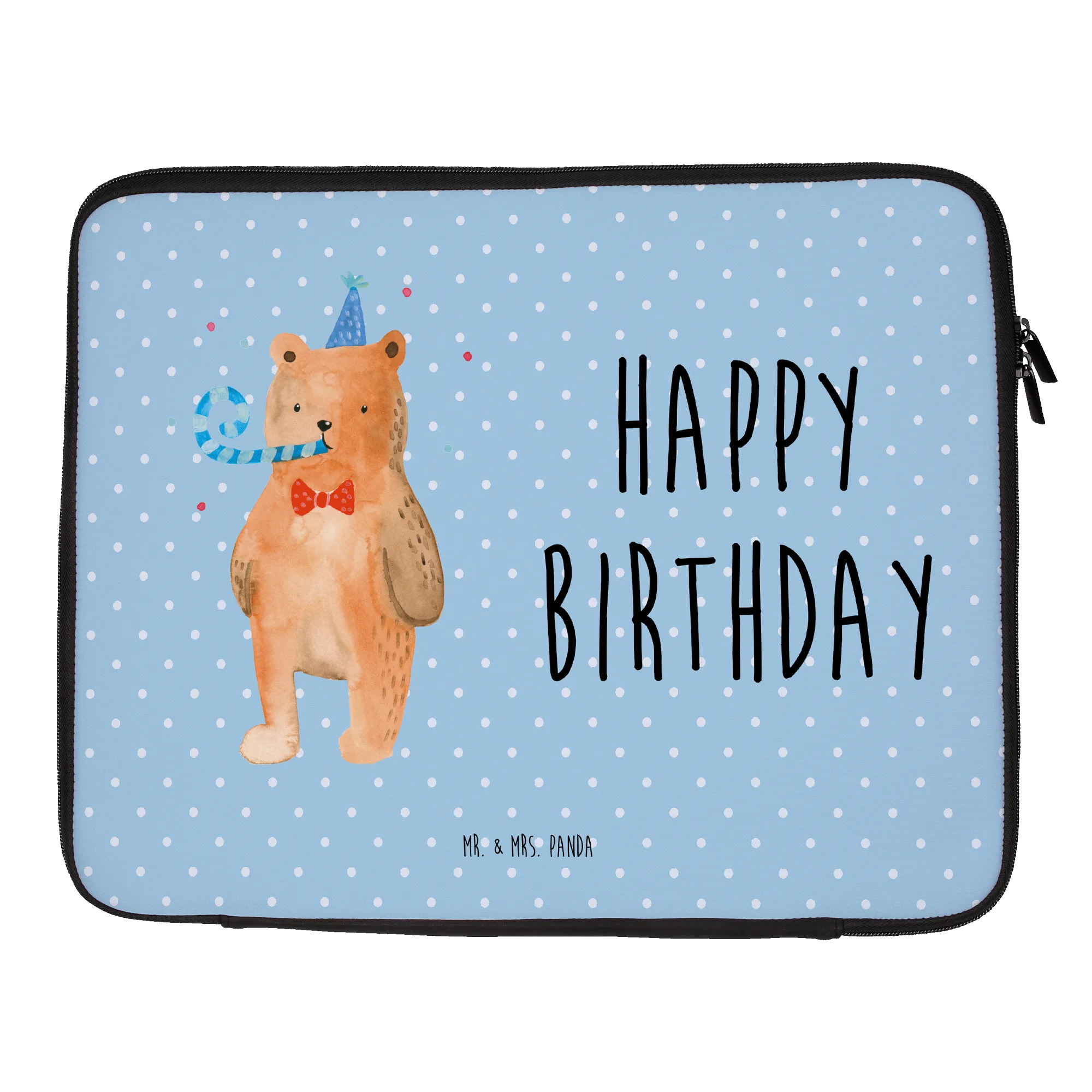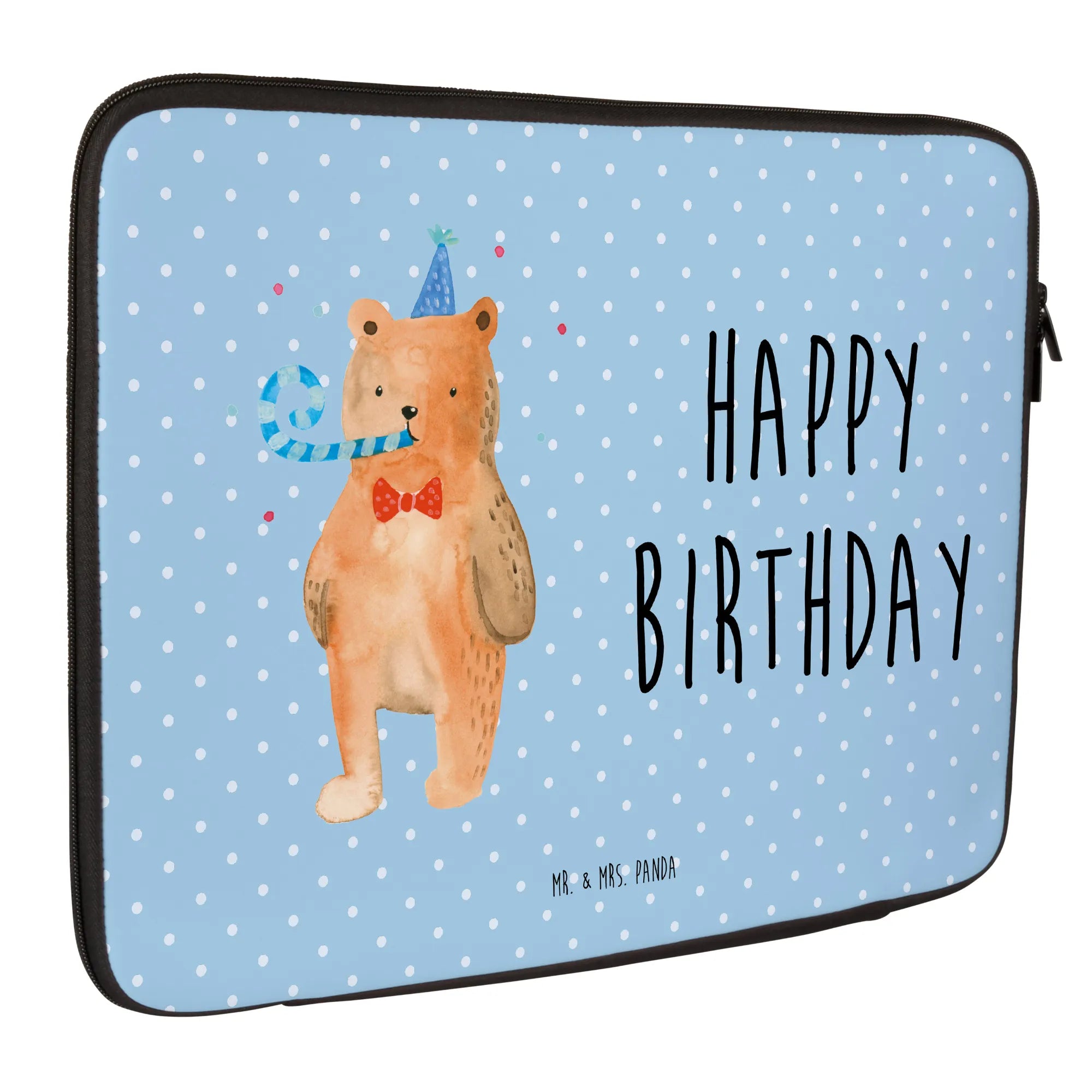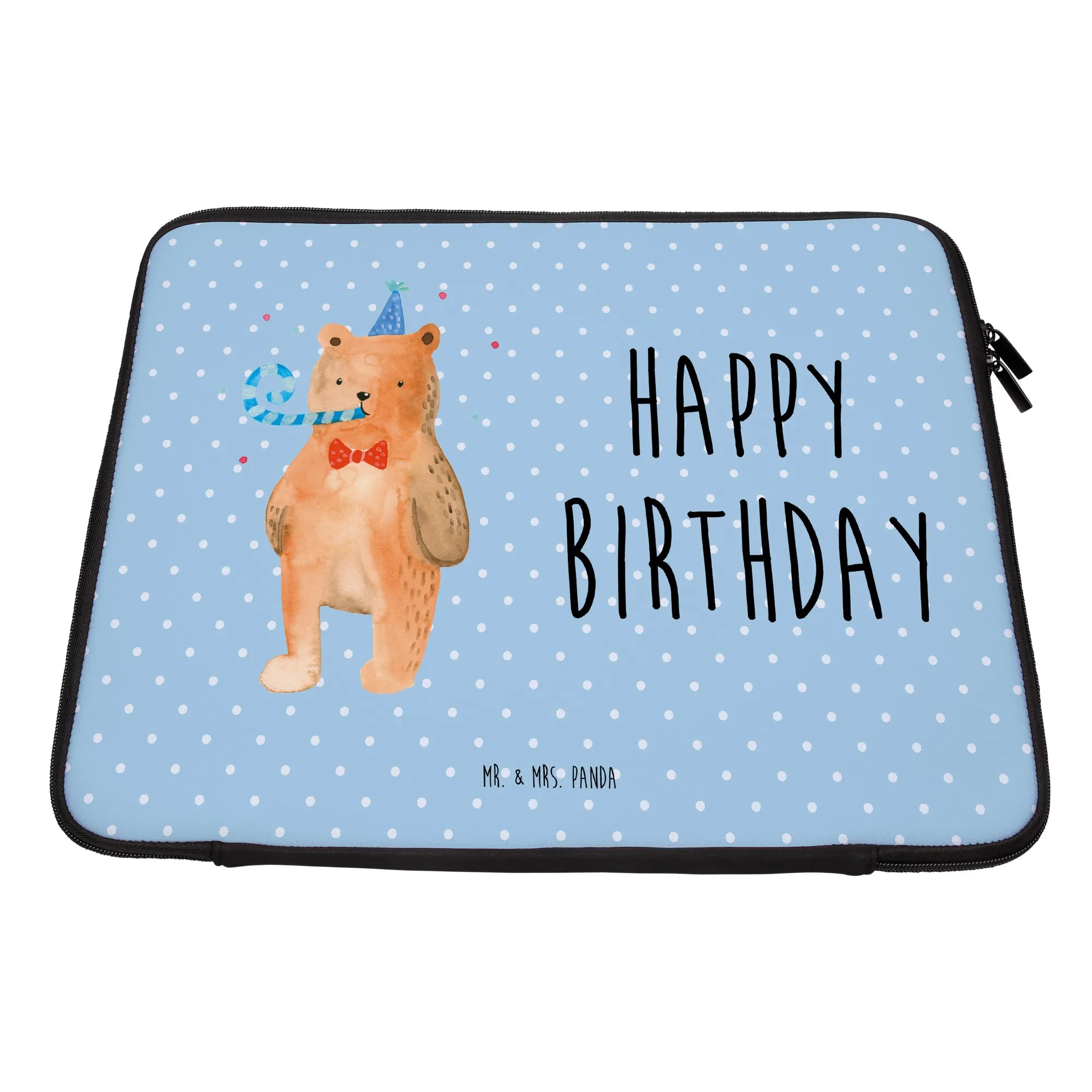 Mach das nächste Geburtstagskind glücklich mit dieser originellen Notebook Tasche. Du wirst sehen, wie sehr sie sich darüber freuen, wenn sie ihre neue Tasche auspacken. Beeindrucke deine Freunde mit Stil und Funktionalität und gib ihnen ein Geschenk, das sie wirklich verwenden können. Und wie immer, bei Mr. & Mrs. Panda steckt in jedem Produkt Liebe und Leidenschaft, sodass du sicher sein kannst, dass du einen besonderen Artikel verschenken oder selbst behalten wirst. Pflegeleicht, ideal mit einem feuchten Tuch abwischbar und nicht maschinenwaschbar, ist die Tasche alles, was man sich wünschen kann. Hol' dir jetzt die "Birthday Bär" Notebook Tasche und feiere stilvoll!