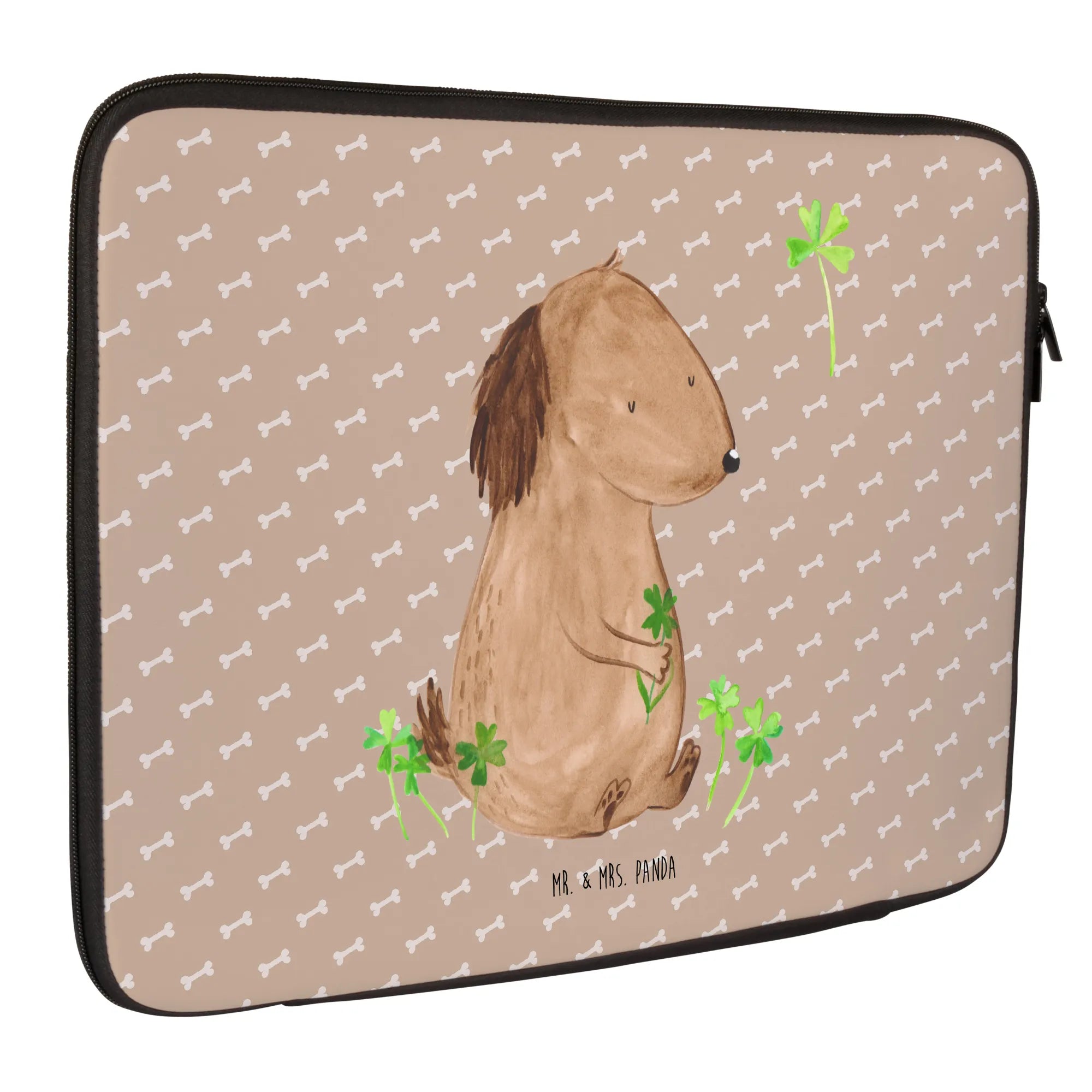 Die Notebook Tasche Hund Kleeblatt aus der liebevollen Hunde Kollektion von Mr. & Mrs. Panda ist die ideale Begleiterin für alle Hundeliebhaber und Tierfreunde. Mit ihrem süßen Motiv eines Hundes, der stolz ein Kleeblatt in der Hand hält, zaubert diese Tasche jedem ein Lächeln ins Gesicht. Die hochwertige Tasche bietet nicht nur einen tollen Blickfang, sondern auch hohen Schutz für Deinen Laptop oder Notebook.