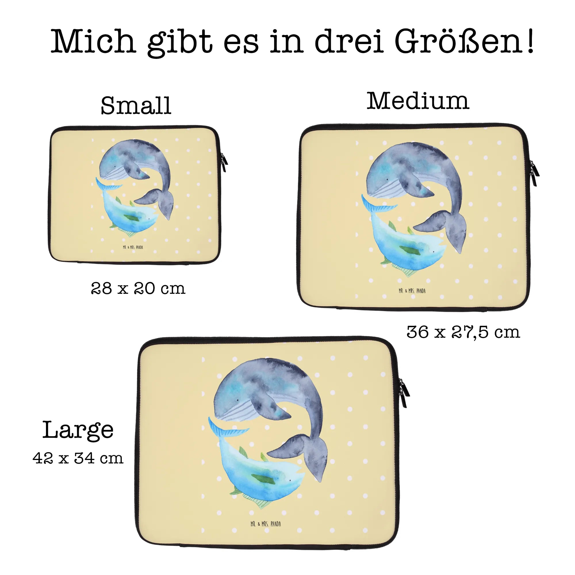 Also, schnapp dir die Notebook Tasche mit Wal- und Thunfisch-Motiv und bringe gute Laune in den Alltag oder verschenke sie an die besten Freunde. Ein Stückchen Freude kommt in jeden Haushalt mit diesem kleinen, aber feinen Accessoire.