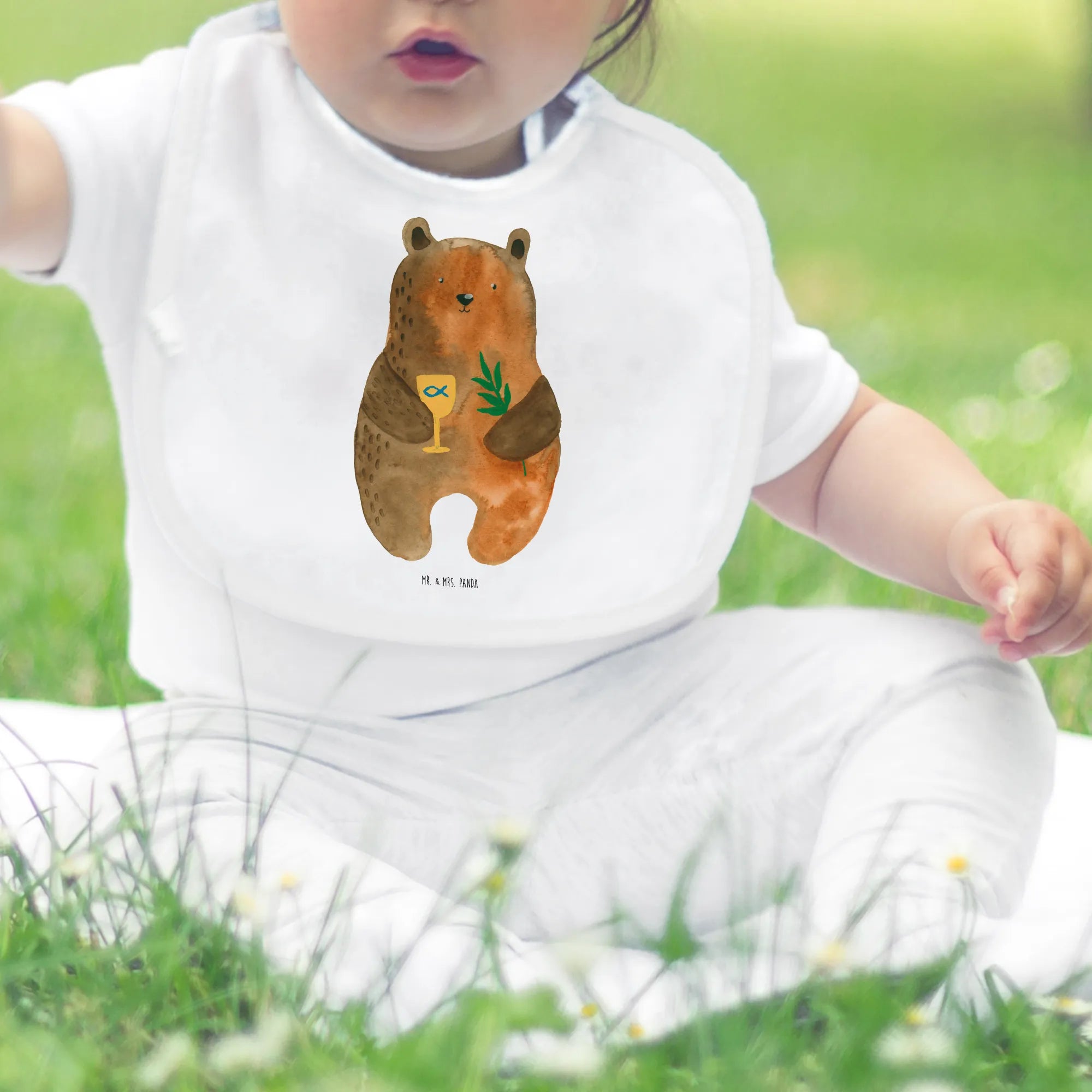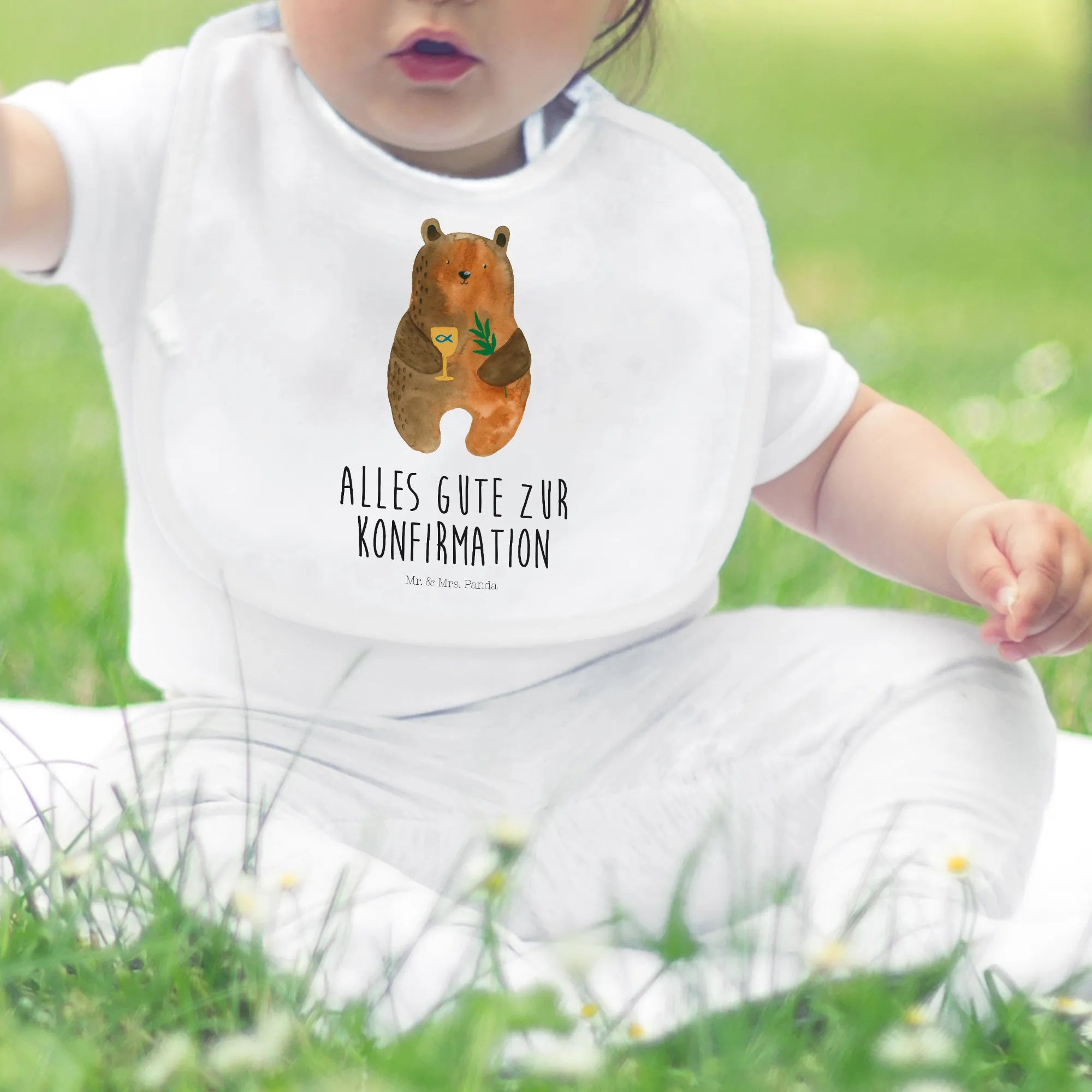 Das Organic Babylätzchen mit dem süßen Konfirmation-Bär aus der besonderen Bären Kollektion von Mr. & Mrs. Panda ist das perfekte Geschenk für jeden Anlass rund um das neue Leben eines kleinen Wunders. Ob zur Geburt, zur Babyparty oder als niedliches Geschenk zur Konfirmation - dieses Lätzchen zaubert garantiert ein Lächeln auf jedes Gesicht. Der bezaubernde Bär, dargestellt mit einem goldenen Kelch in der einen Hand und einem Zweig in der anderen, bringt eine liebevolle Botschaft der Feierstimmung mit.