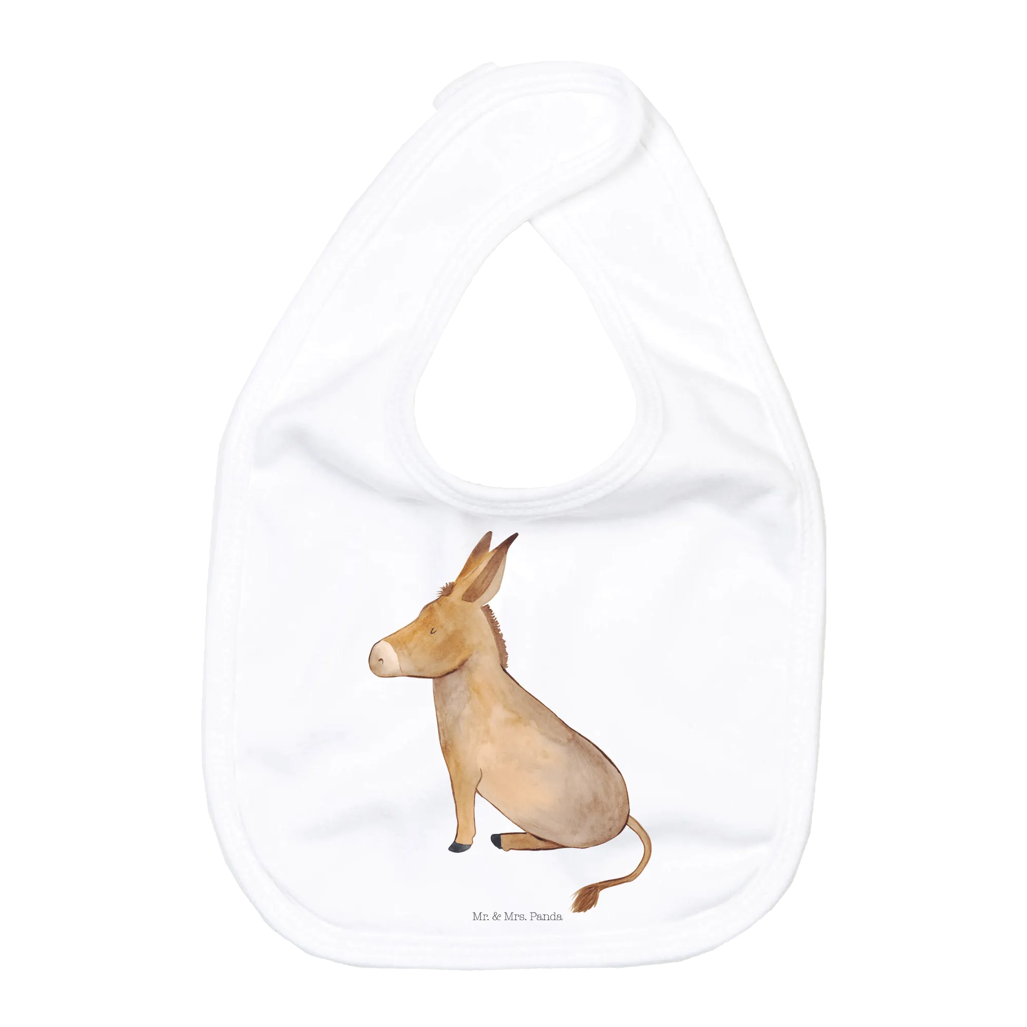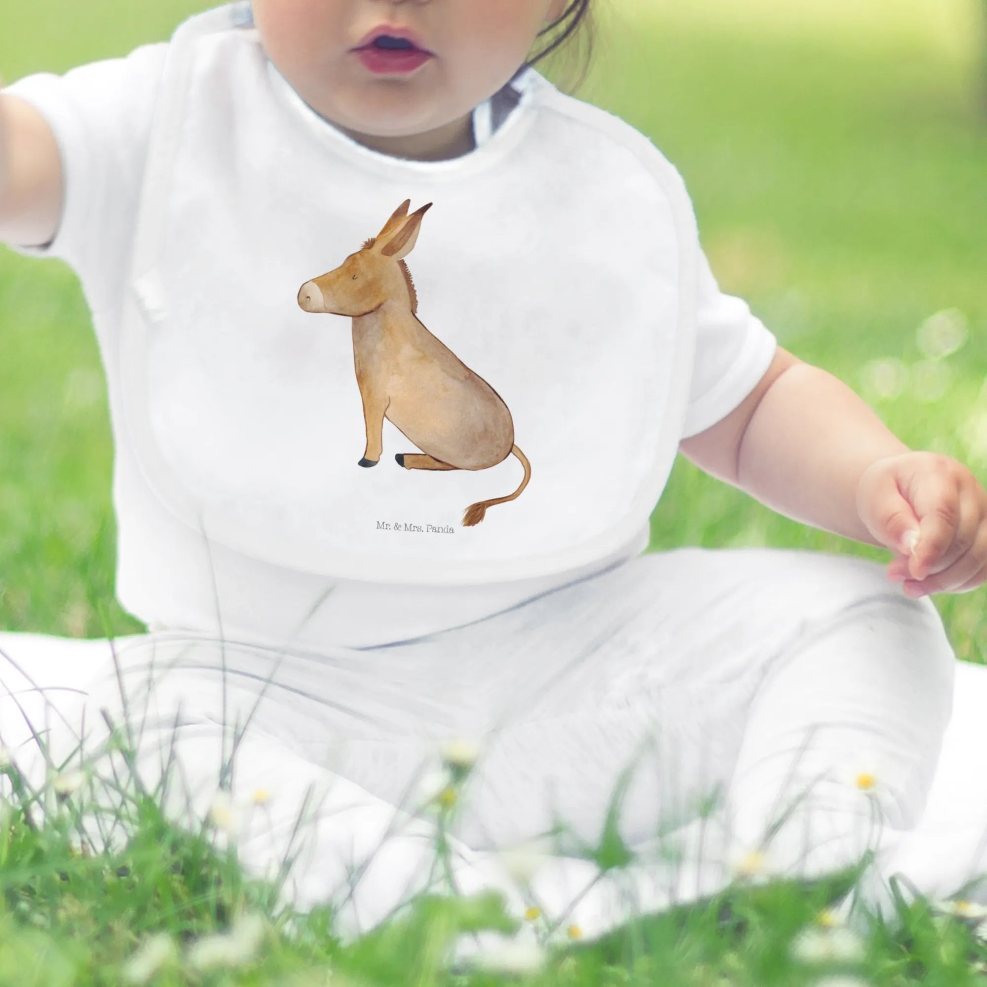 Das Lätzchen ist aus softer, ökologischer Baumwolle gefertigt, die sanft zur empfindlichen Babyhaut ist. Die weich gezeichnete Grafik eines süßen Esels, mit großen, sanften Augen und einladenden Ohren, vermittelt bereits beim ersten Blick Lebensmut, Zuversicht und ein Lächeln.
