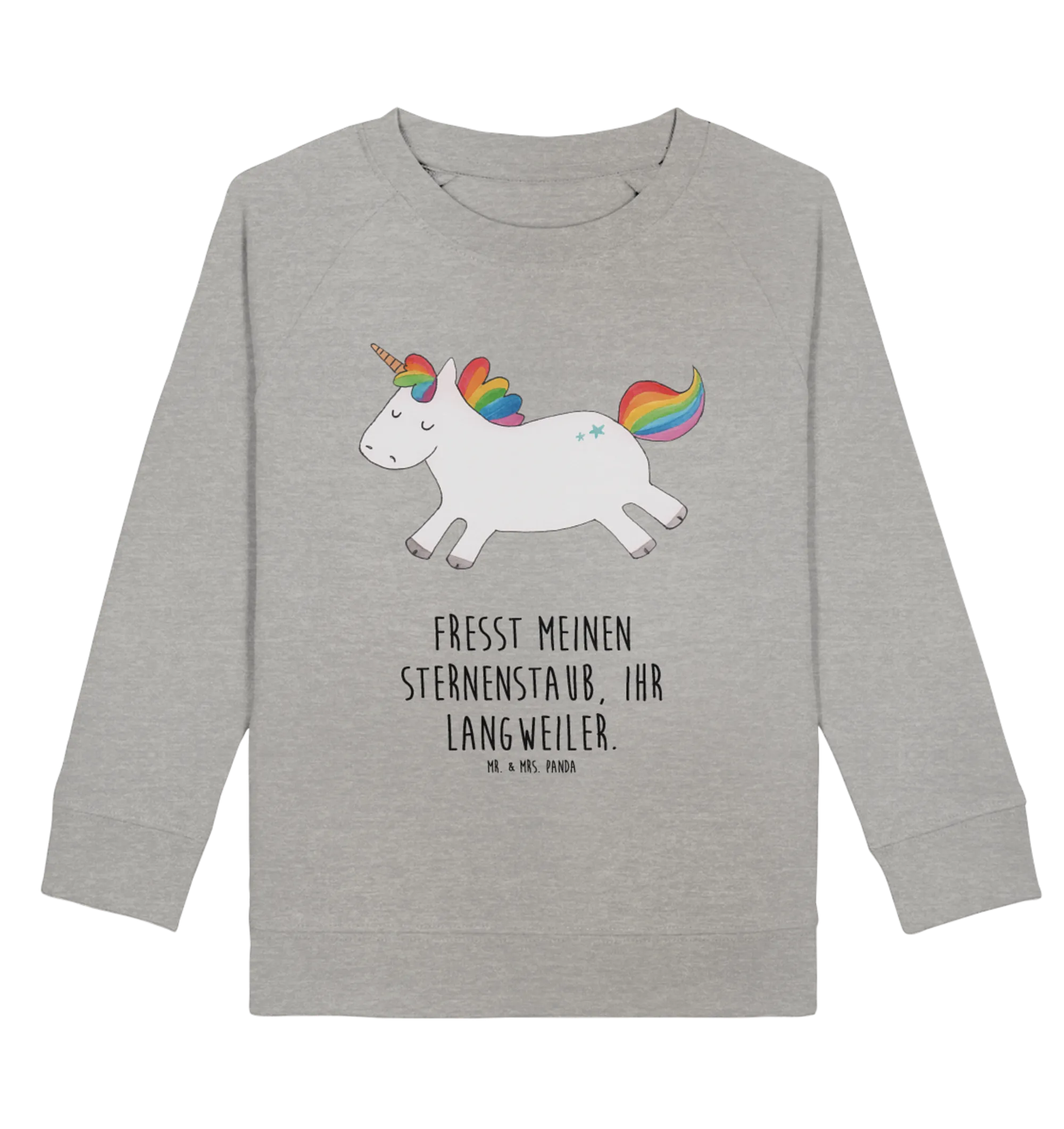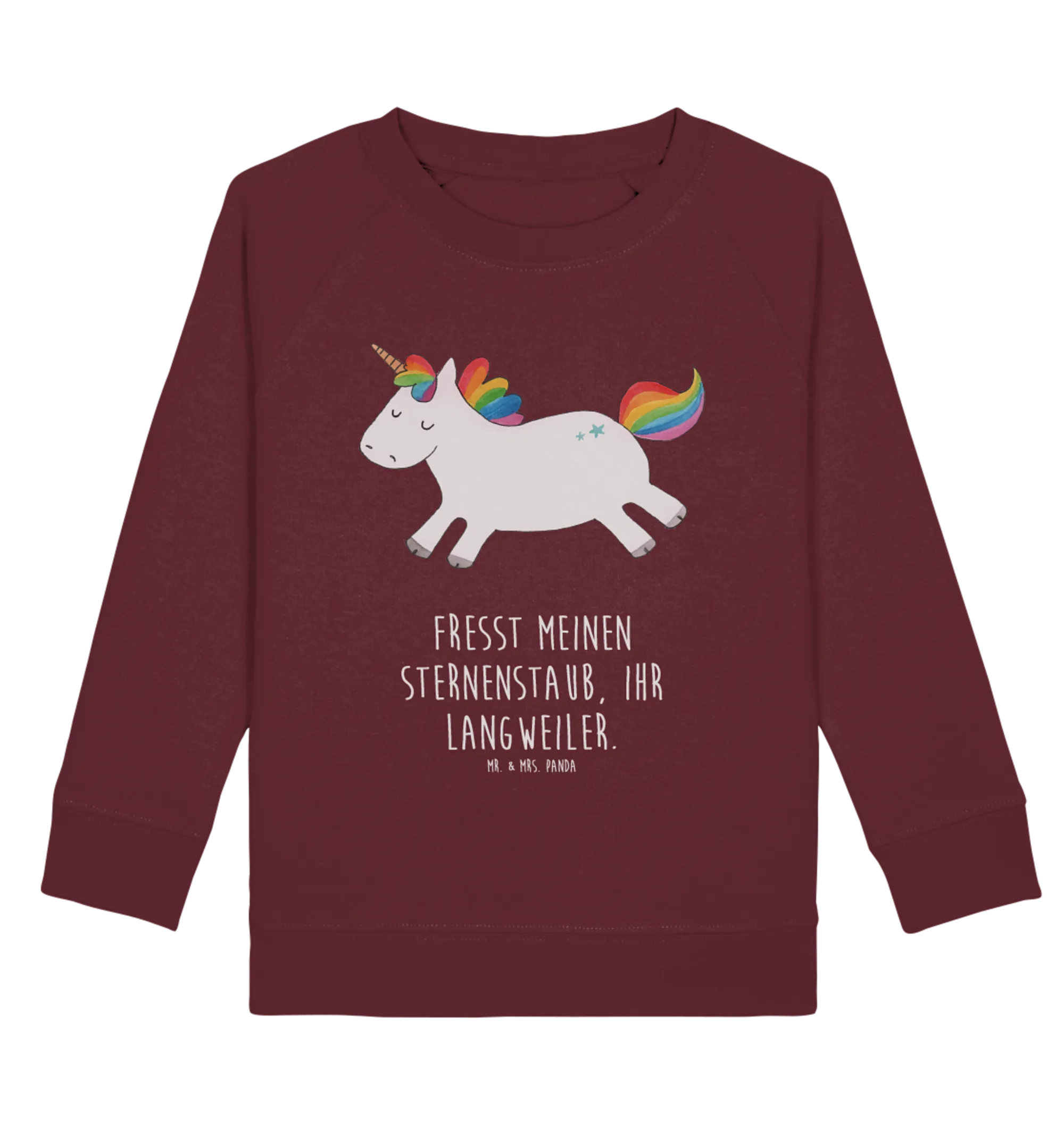 Der Organic Kinder Pullover Einhorn Happy aus der zauberhaften Einhorn-Kollektion ist das perfekte Geschenk für kleine Träumer und Abenteurer. Mit seinem bunten, handgezeichneten Einhorn-Motiv und dem witzigen Slogan 'Fresst meinen Sternenstaub, ihr Langweiler.' wird dieser Pullover zum echten Blickfang und zaubert jedem Kind ein Lächeln ins Gesicht.