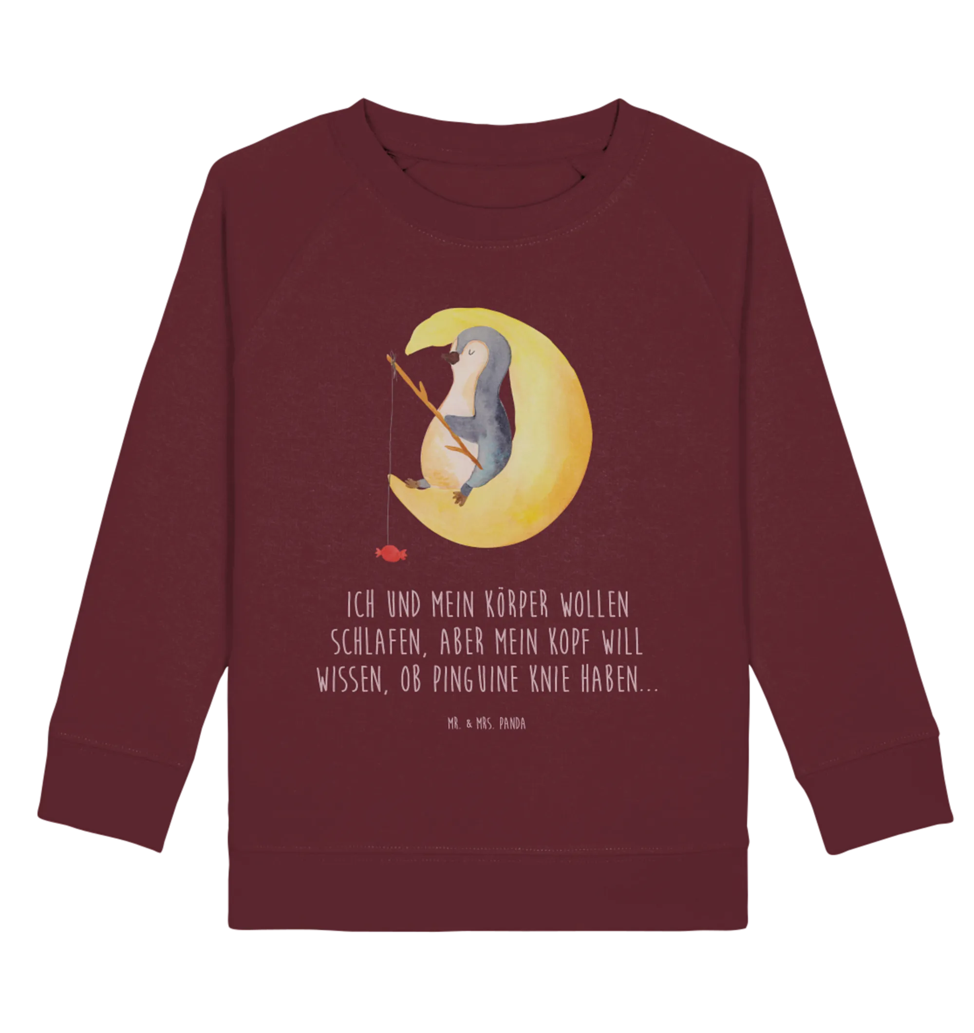 Der Organic Kinder Pullover mit dem süßen Pinguin Mond Motiv aus der Pinguin-Kollektion von Mr. & Mrs. Panda ist der perfekte Begleiter für kleine Abenteurer! Dieser Pullover, in der eleganten Farbgebung Burgunder, vereint Style und Gemütlichkeit und sorgt dafür, dass sich jedes Kind wohlfühlt. Der liebevolle Pinguin, der es sich auf einer Mondsichel gemütlich gemacht hat, angelt mit einer Angel nach Sternen – ein Motiv, das die Fantasie anregt und zum Träumen einlädt.