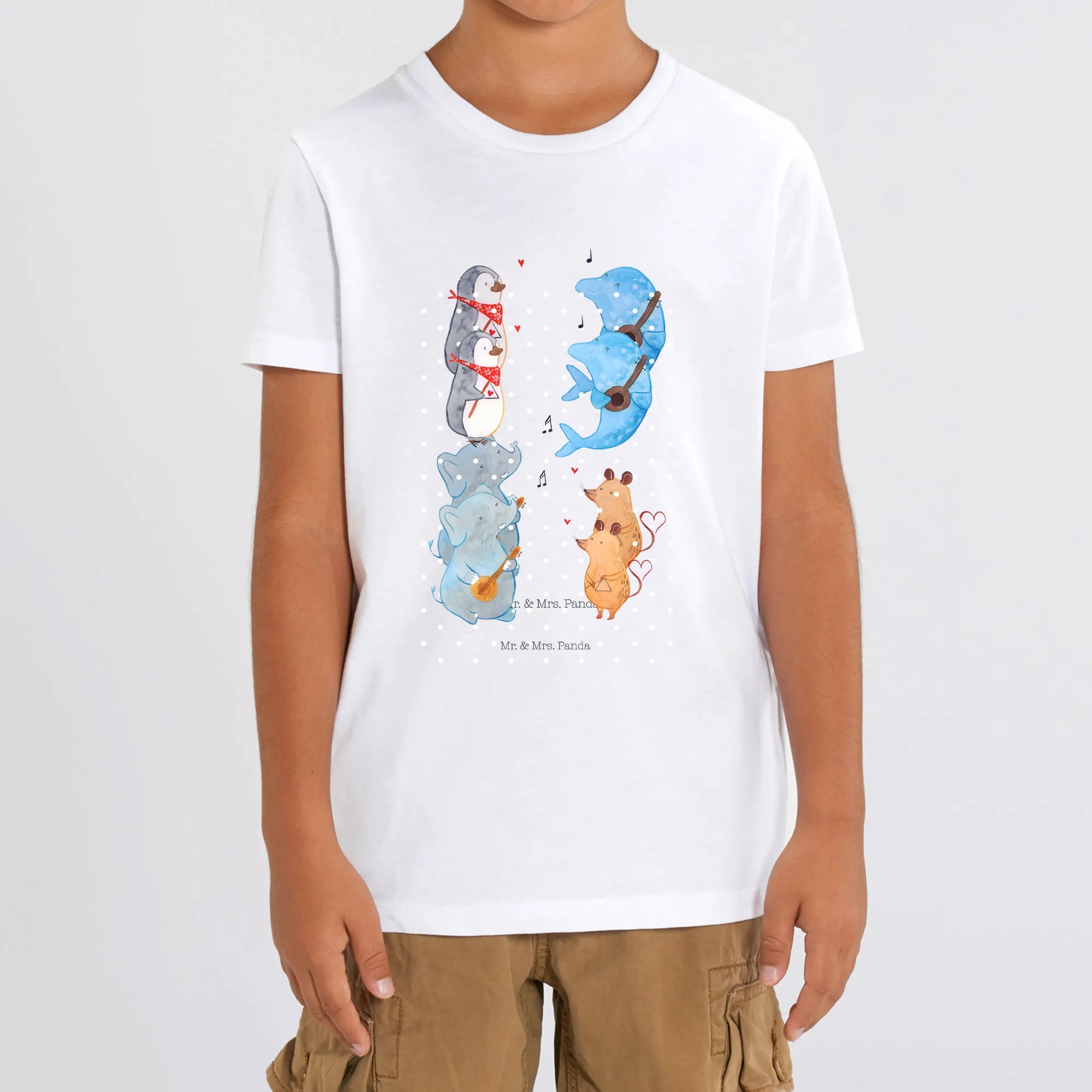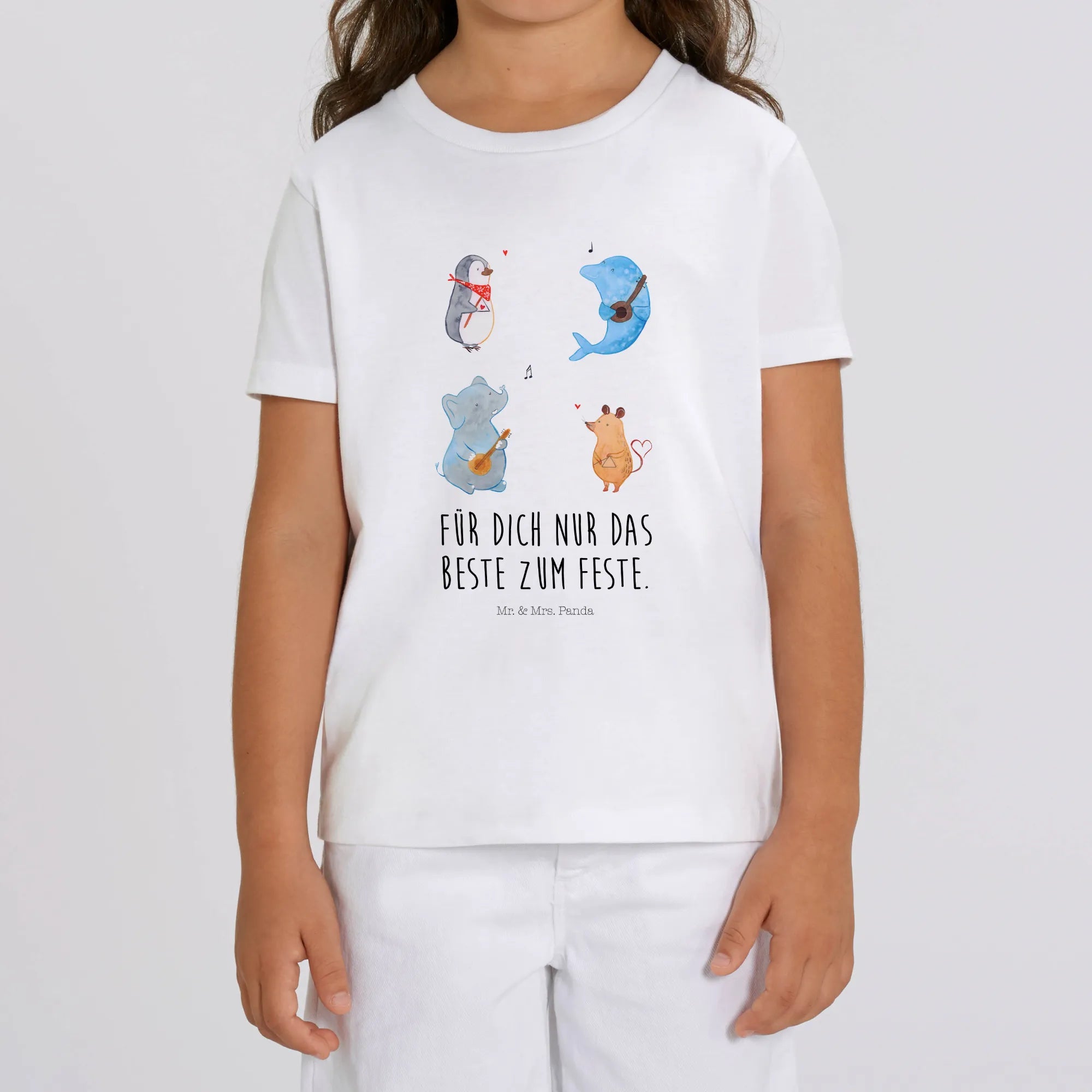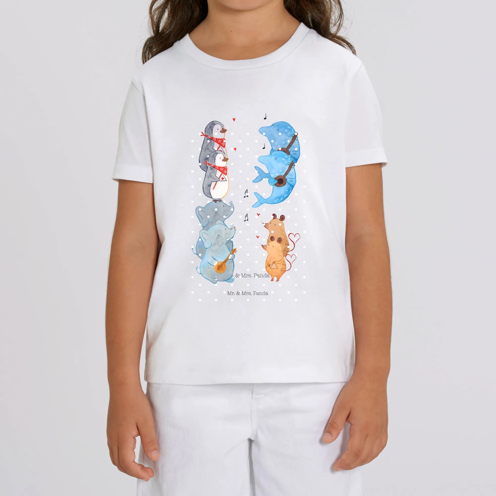 Mit einem fröhlichen Design, das einen Pinguin, eine Maus, einen Delfin und einen Elefanten zeigt, die zusammen musizieren, zaubert dieses T-Shirt jedem Kind ein Lächeln ins Gesicht. Es ist kuschelig weich und aus 100 % Bio-Baumwolle gefertigt, was es besonders angenehm zu tragen macht.