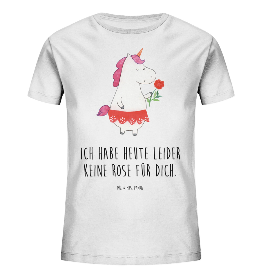 Entdecke das perfekte Geschenk für kleine Einhorn-Liebhaber mit unserem wundervollen, organischen Kinder T-Shirt "Einhorn Dame" aus der Einhorn-Kollektion von Mr. & Mrs. Panda. Dieses bezaubernde T-Shirt ist nicht nur stylisch, sondern auch ein echtes Statement für die feinen Damen unter den Kids! Mit dem handgezeichneten Einhorn-Motiv und dem witzigen Slogan "Ich habe heute leider keine Rose für dich" zieht es alle Blicke auf sich.